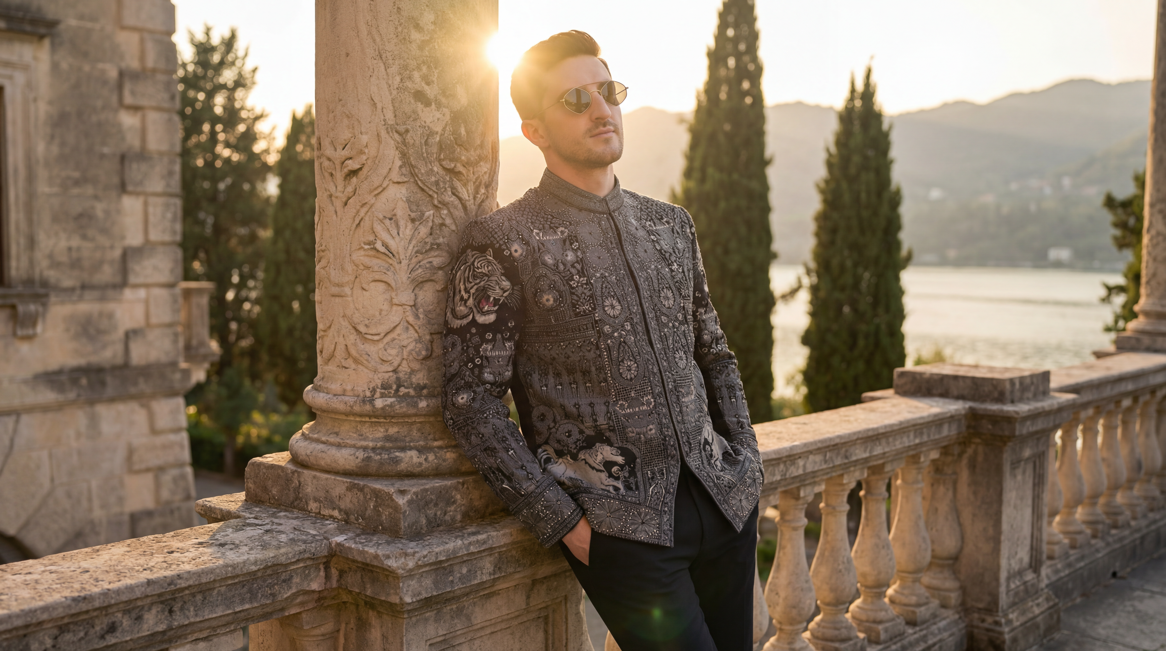 Men’s Bandhgala – Japanese Lycra in Black with Royal Palace Theme Embroidery | One Man Show