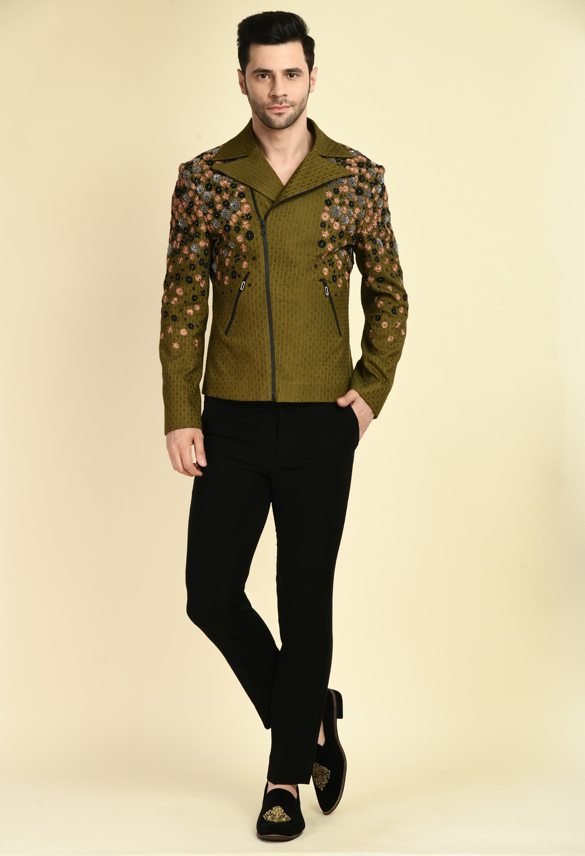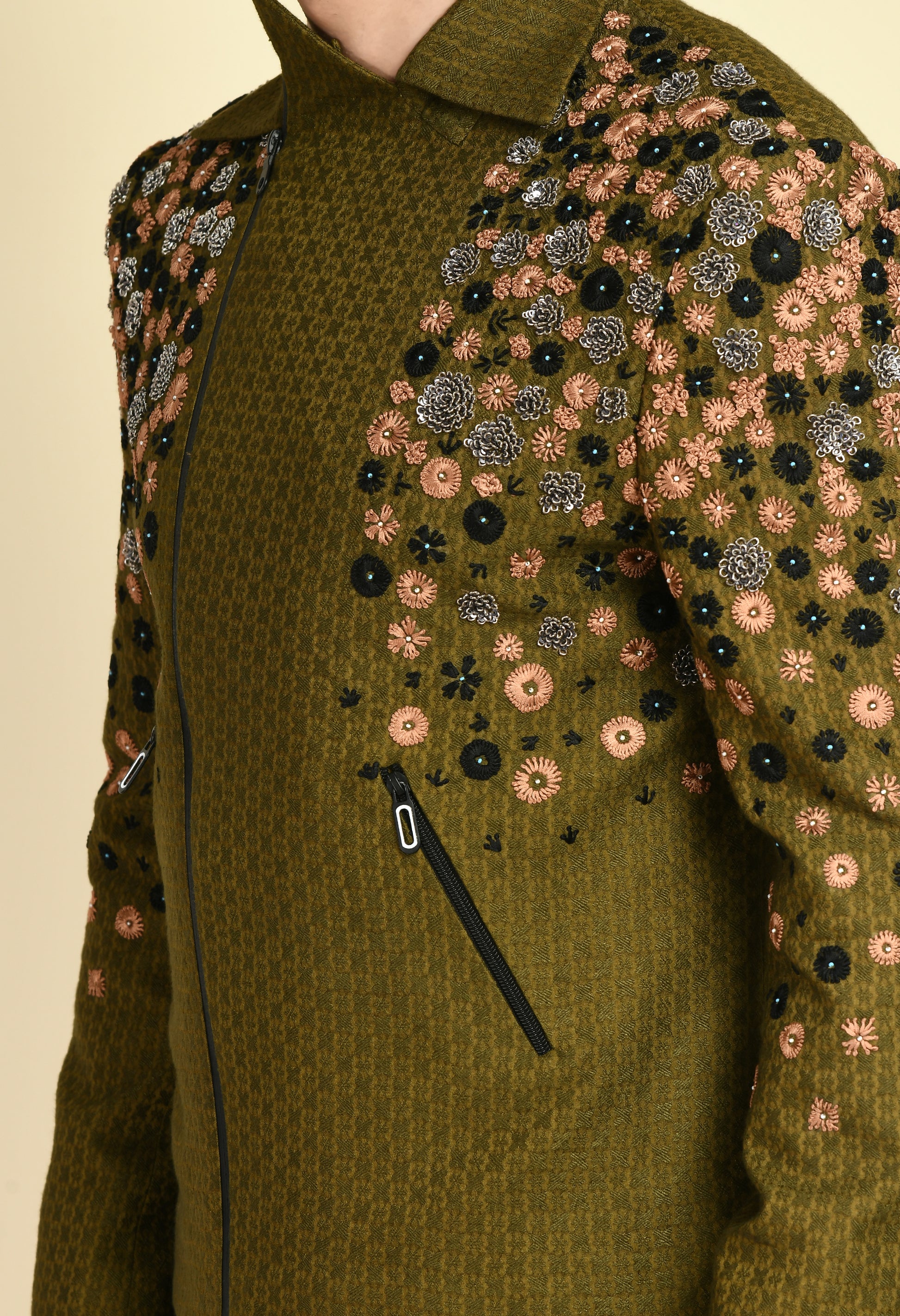 Men’s Biker Jacket – Silk Jaquard in Olive Green with Placement Embroidery | One Man Show