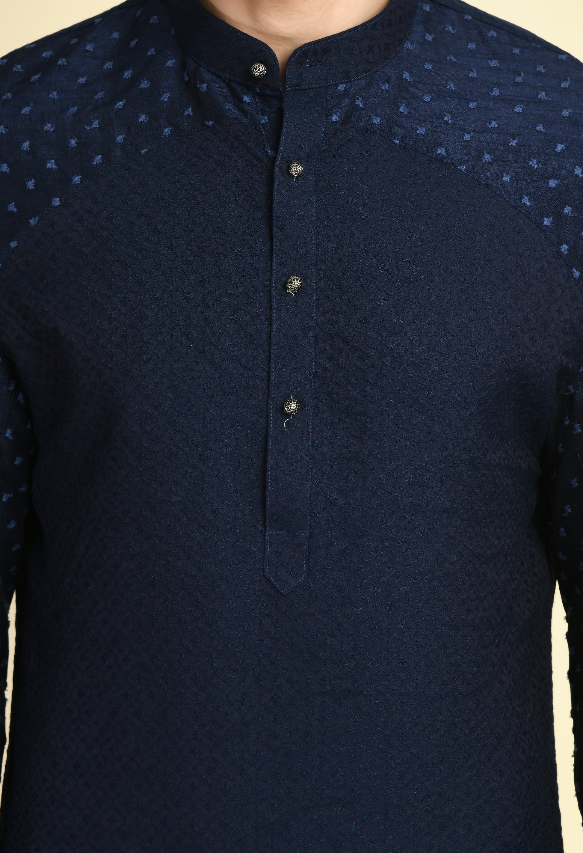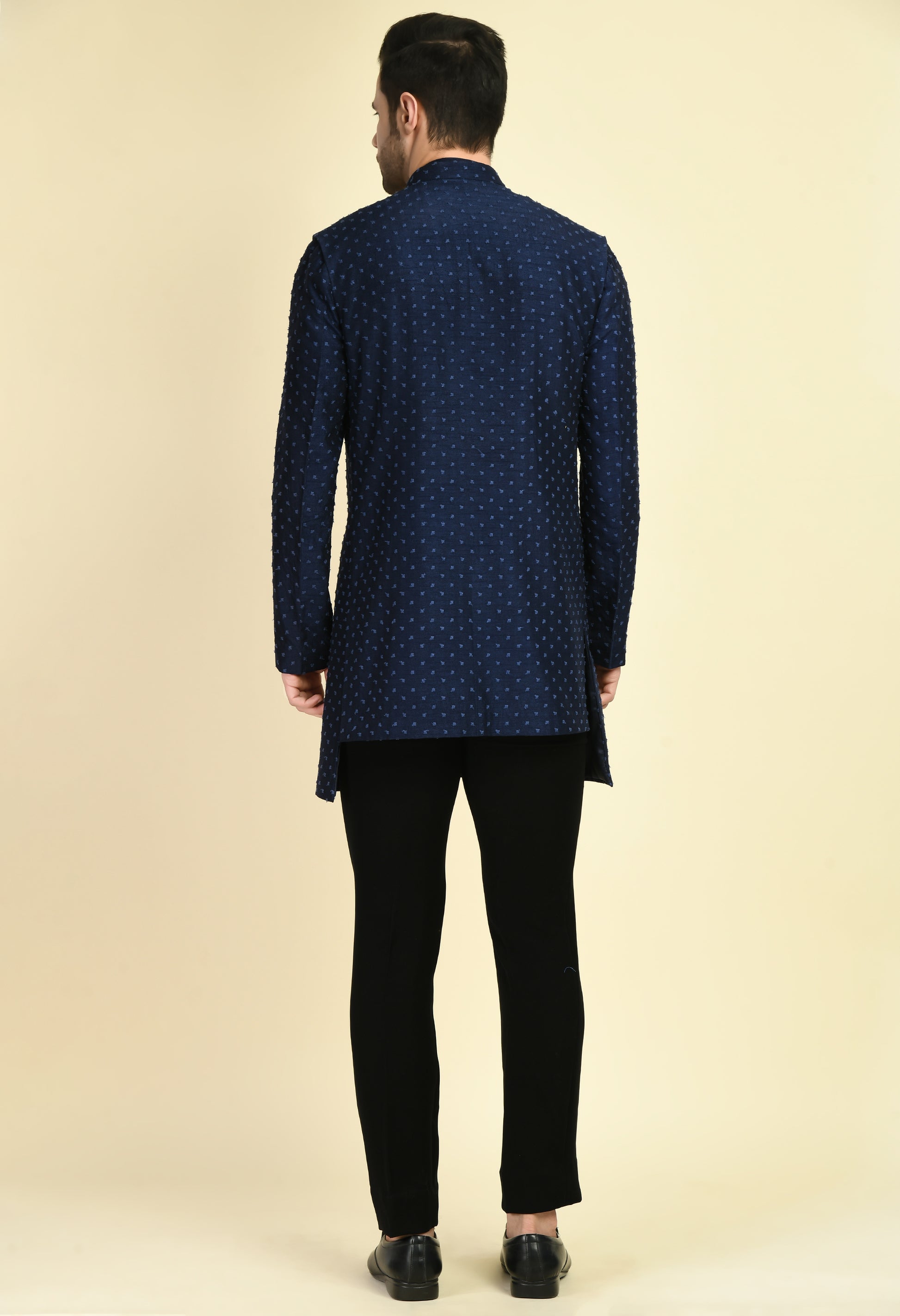 Men’s Nehru Jacket – Silk Jaquard in Navy Blue with Thread Embroidery | One Man Show