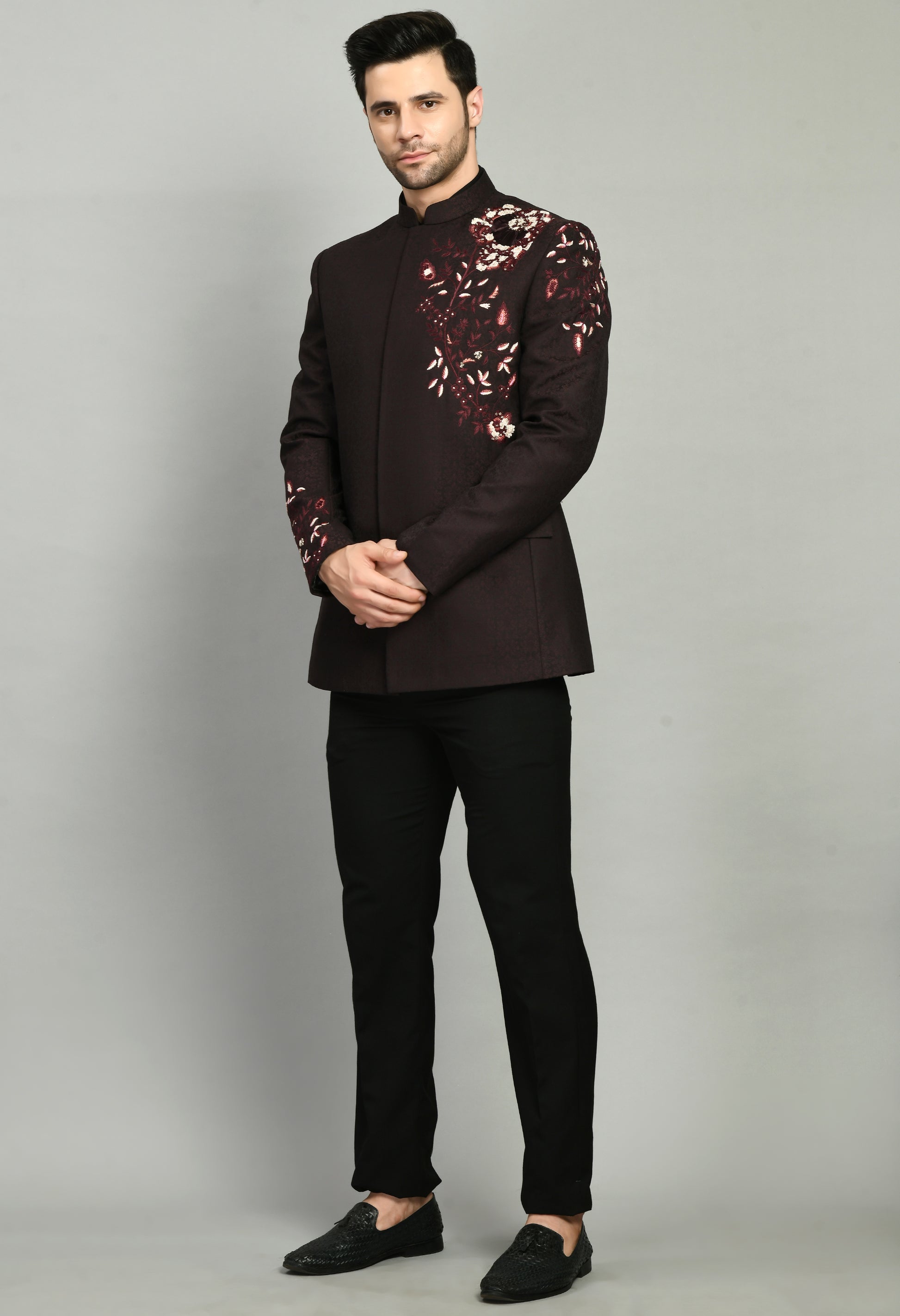 Crafted from premium jaquard suiting, this wine-hued Bandhgala exudes sophistication and elegance. The silhouette features a tailored fit, complemented by exquisite shoulder embroidery with appliqué and silk thread detailing. Perfect for festive occasions, this ensemble pairs beautifully with Japanese Lycra pants for a refined look.