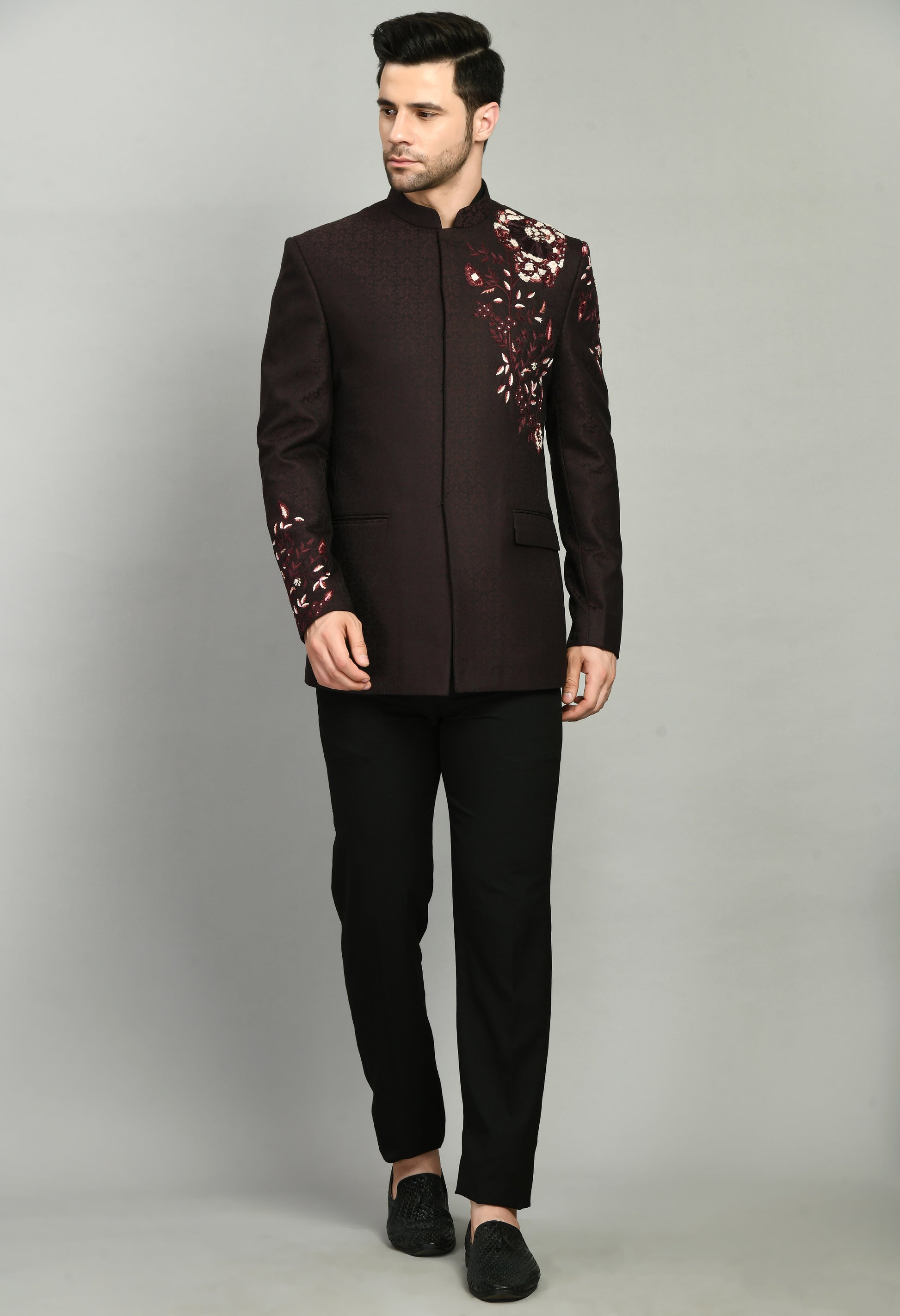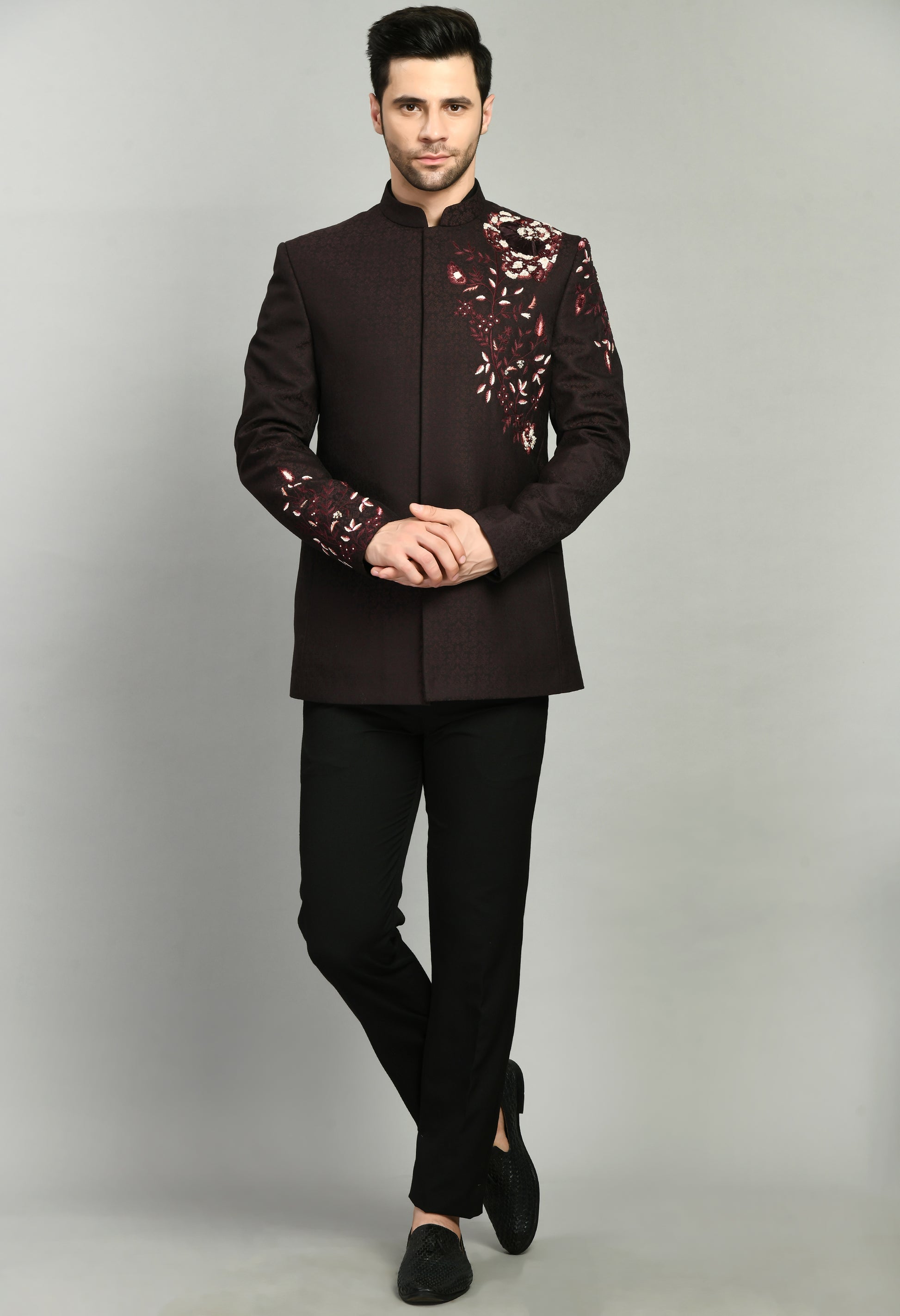 Men’s Bandhgala – Jaquard Suiting in Wine with Shoulder Embroidery | One Man Show
