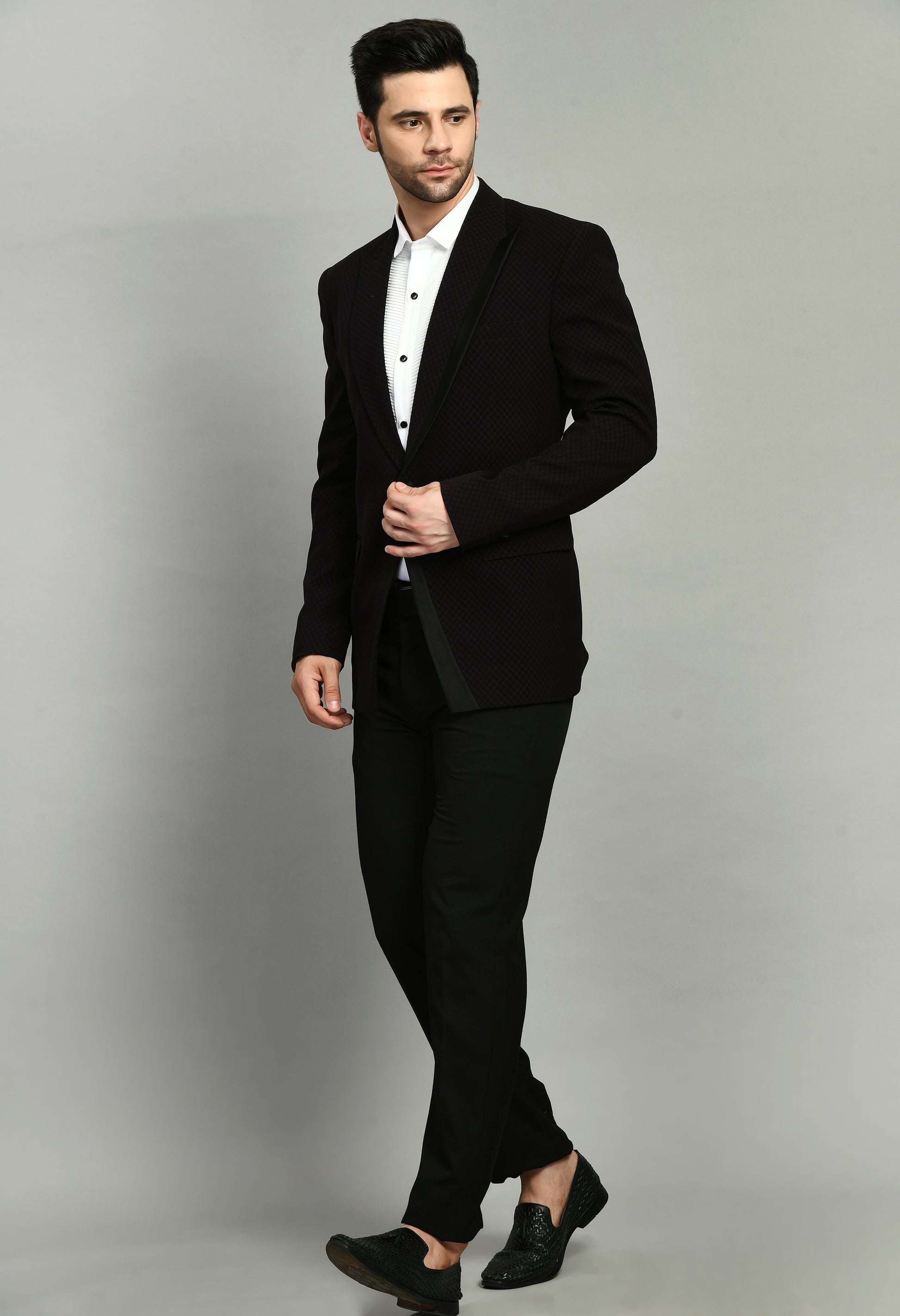 Crafted from premium Japanese Lycra, this tuxedo offers a refined fit and exceptional drape, perfect for formal occasions. The black textured fabric is complemented by a sophisticated satin lapel detail, creating a striking silhouette. The ensemble includes a matching shirt in cotton Lycra for added comfort and style, making it an ideal choice for weddings and gala events.