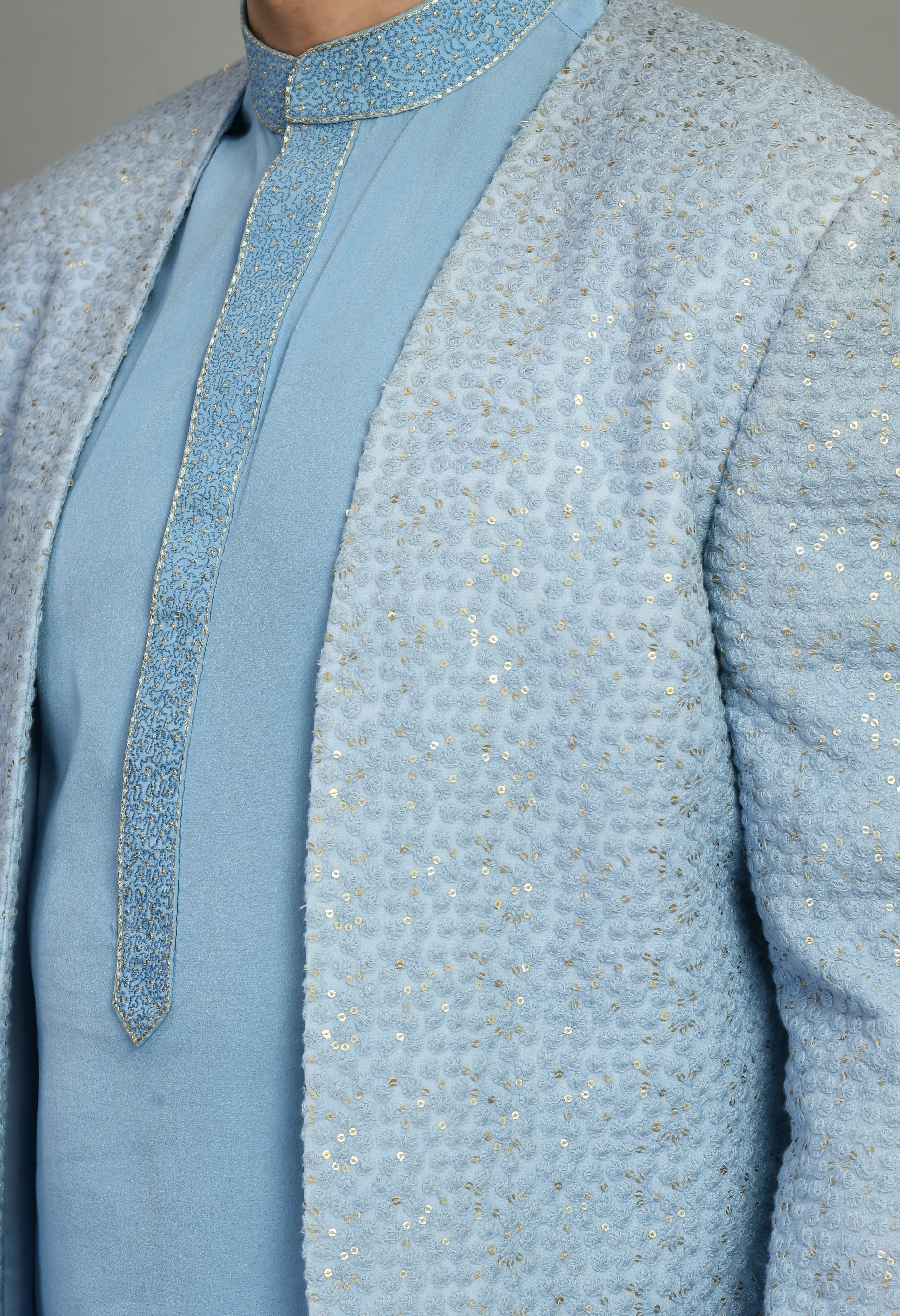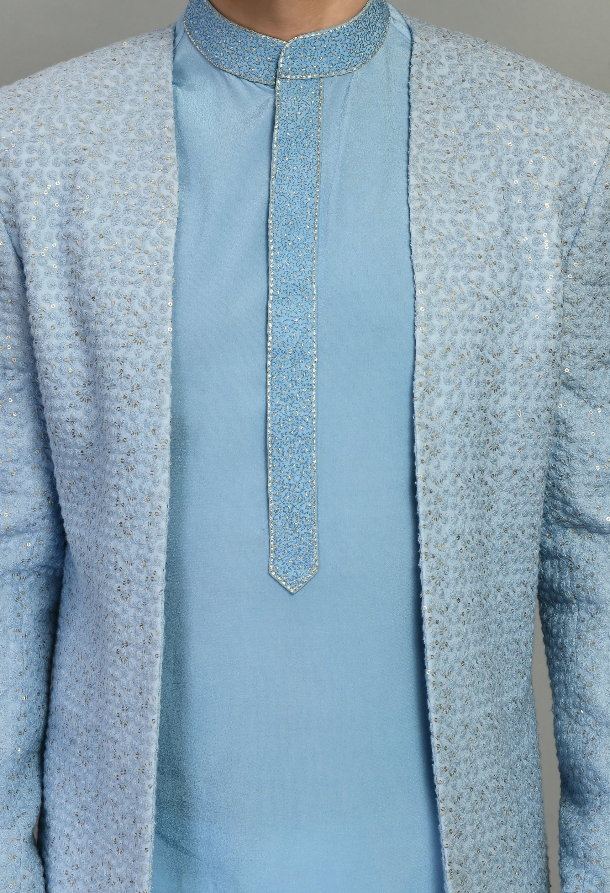 Men’s Indo-Western – Silk Georgette in Sky Blue with Floral Thread Work | One Man Show