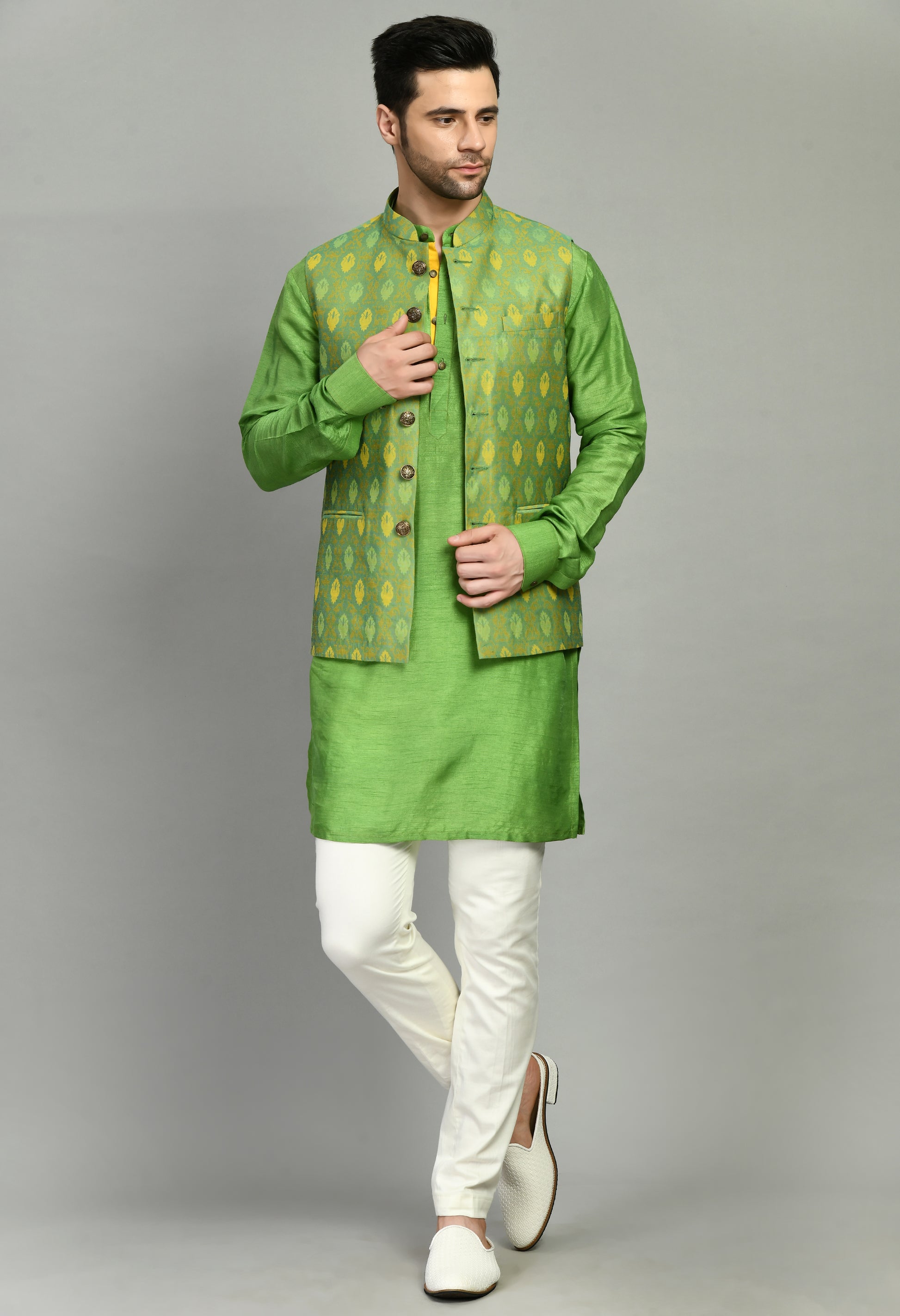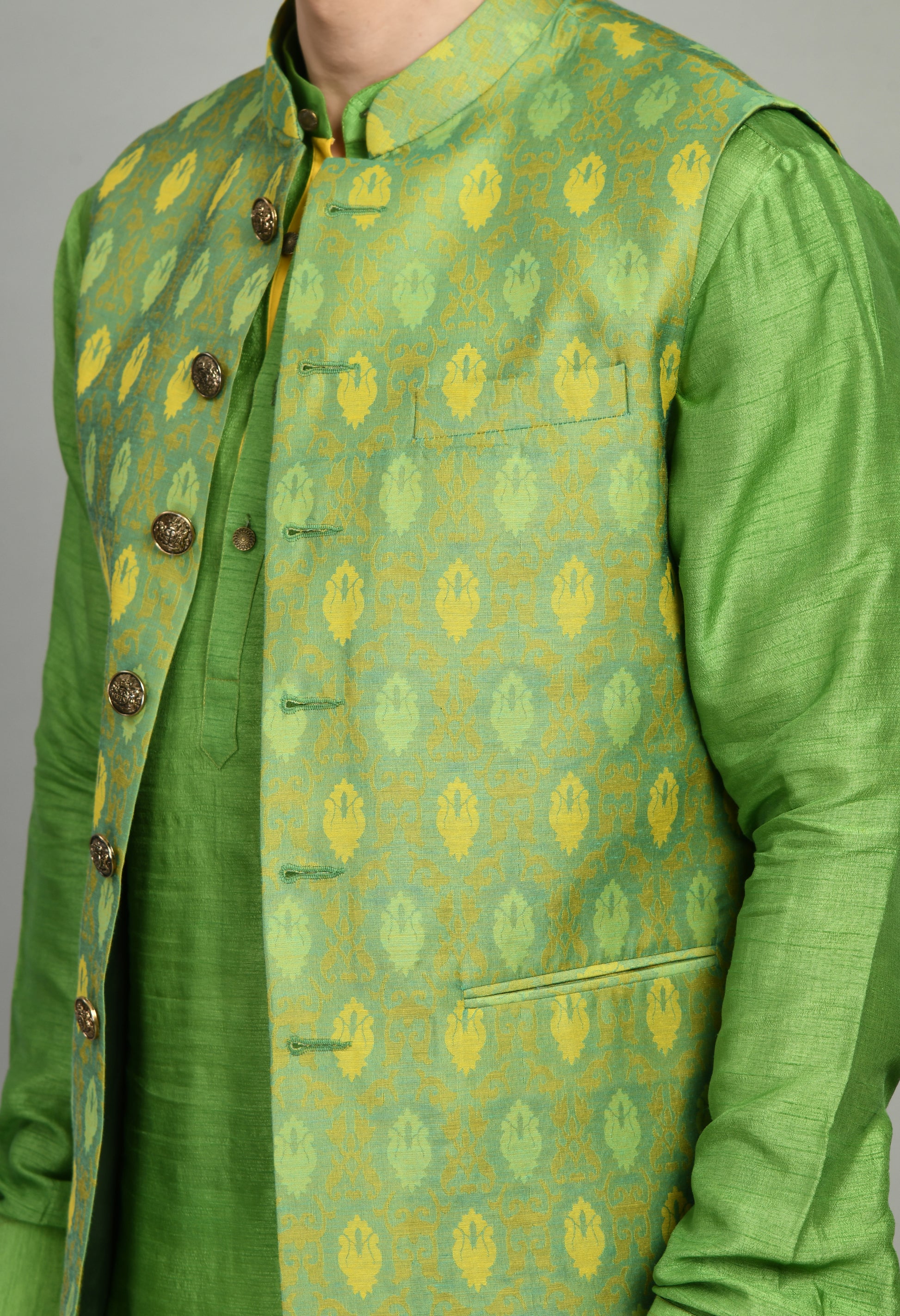 Men’s Nehru Jacket – Silk Jaquard in Green with Front Open Design | One Man Show