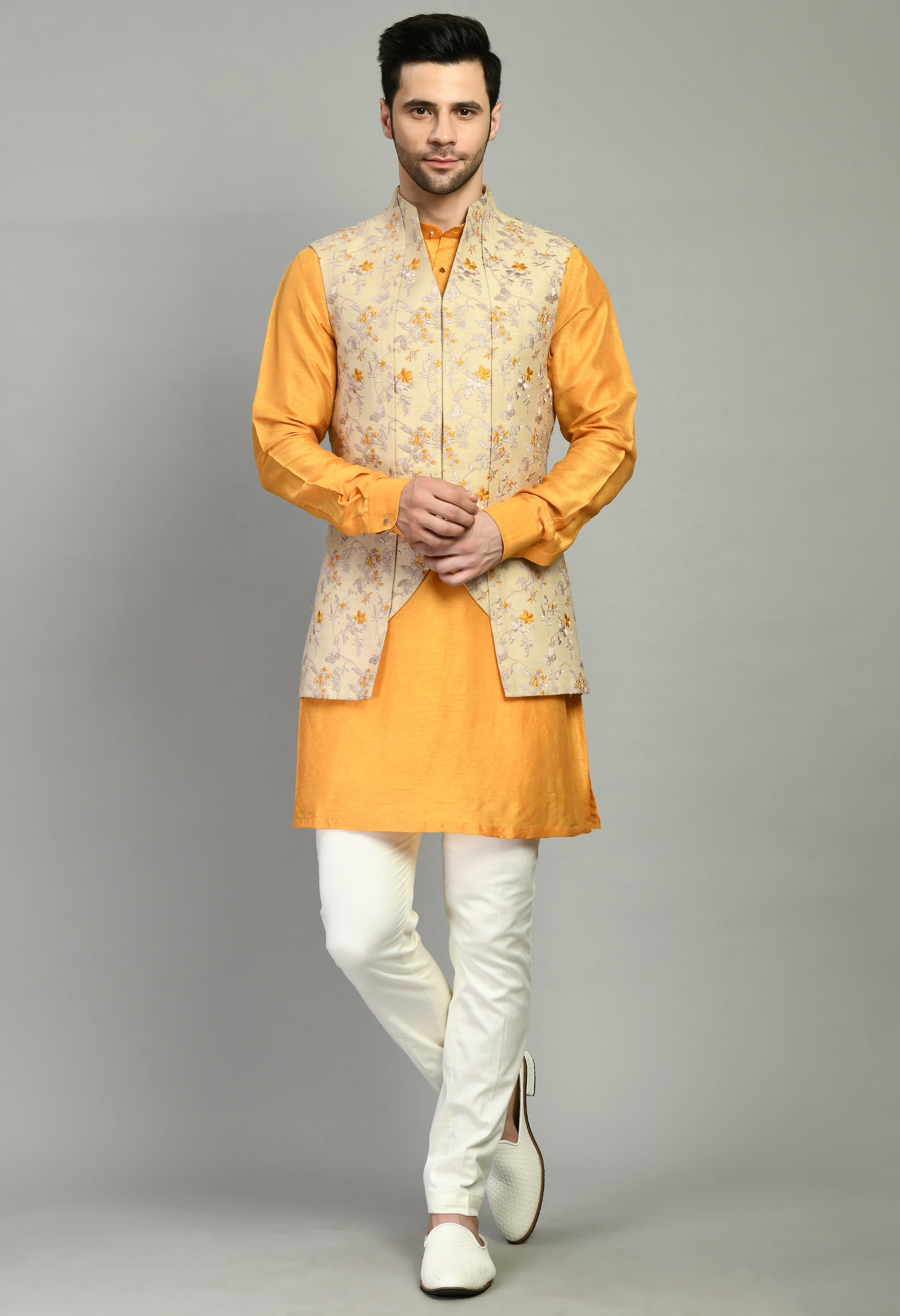 Men’s Nehru Jacket – Silk Moga in Yellow with Silk Thread Floral Embroidery | One Man Show