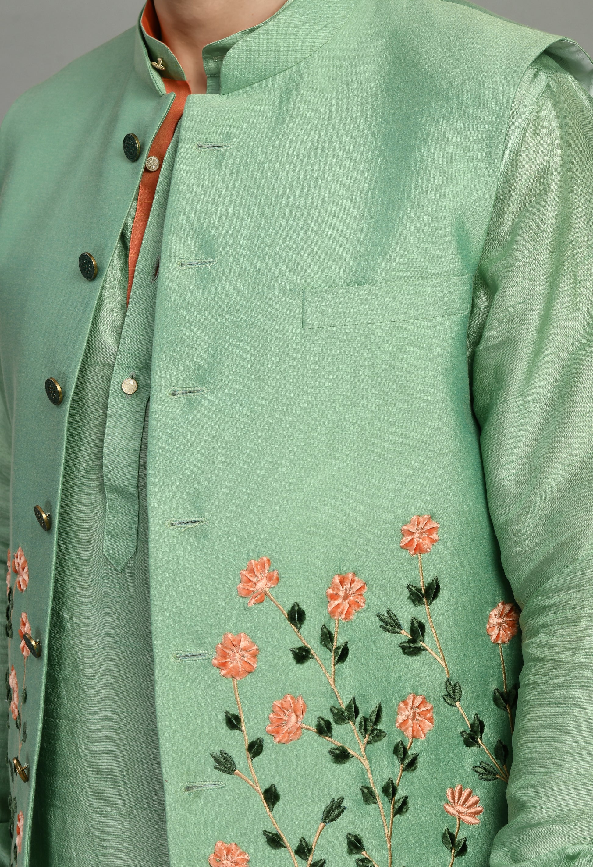 Men’s Nehru Jacket – Cotton Silk in Green with Silk Thread Embroidery | One Man Show