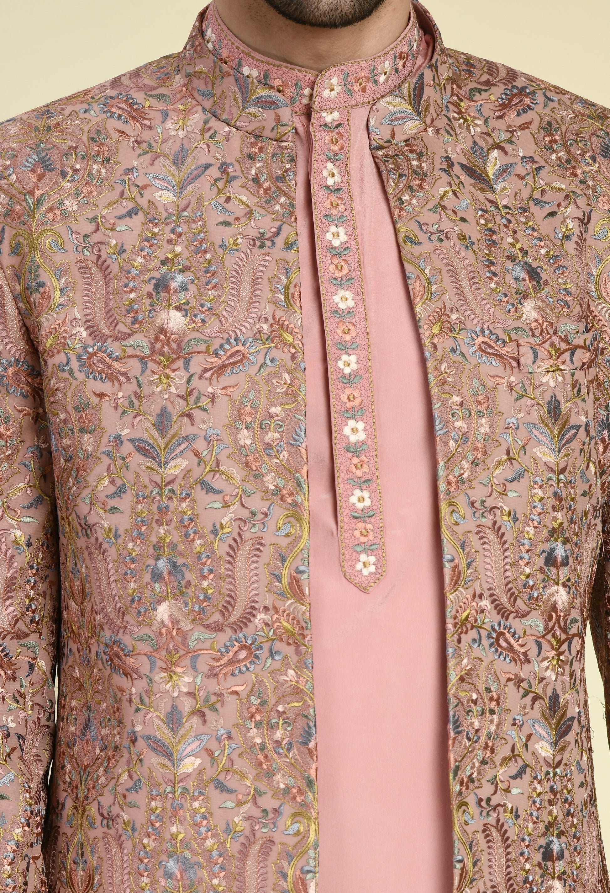 Men’s Indo-Western – Silk Georgette in Pink with Floral Multi Thread Embroidery | One Man Show