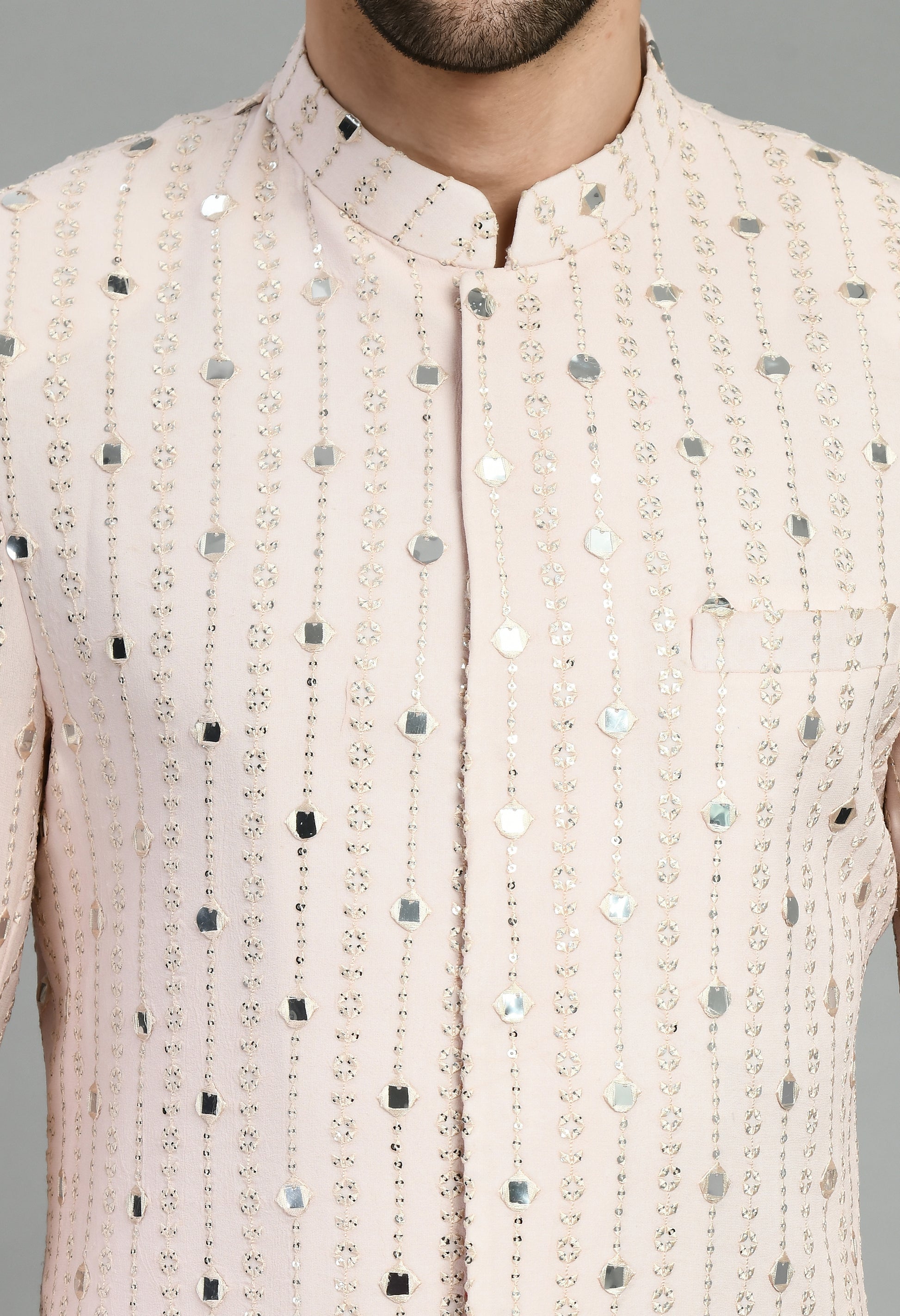 Men’s Indo-Western – Silk Georgette in Pink with Mirror Work Embroidery | One Man Show