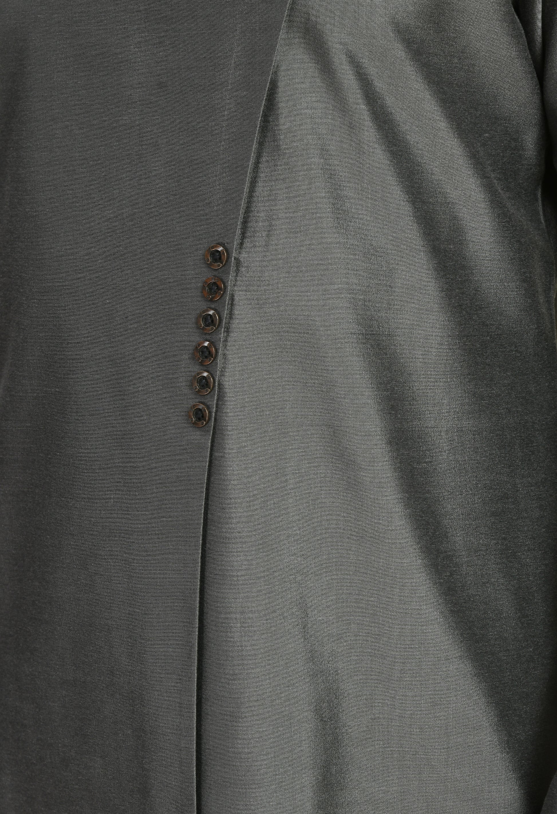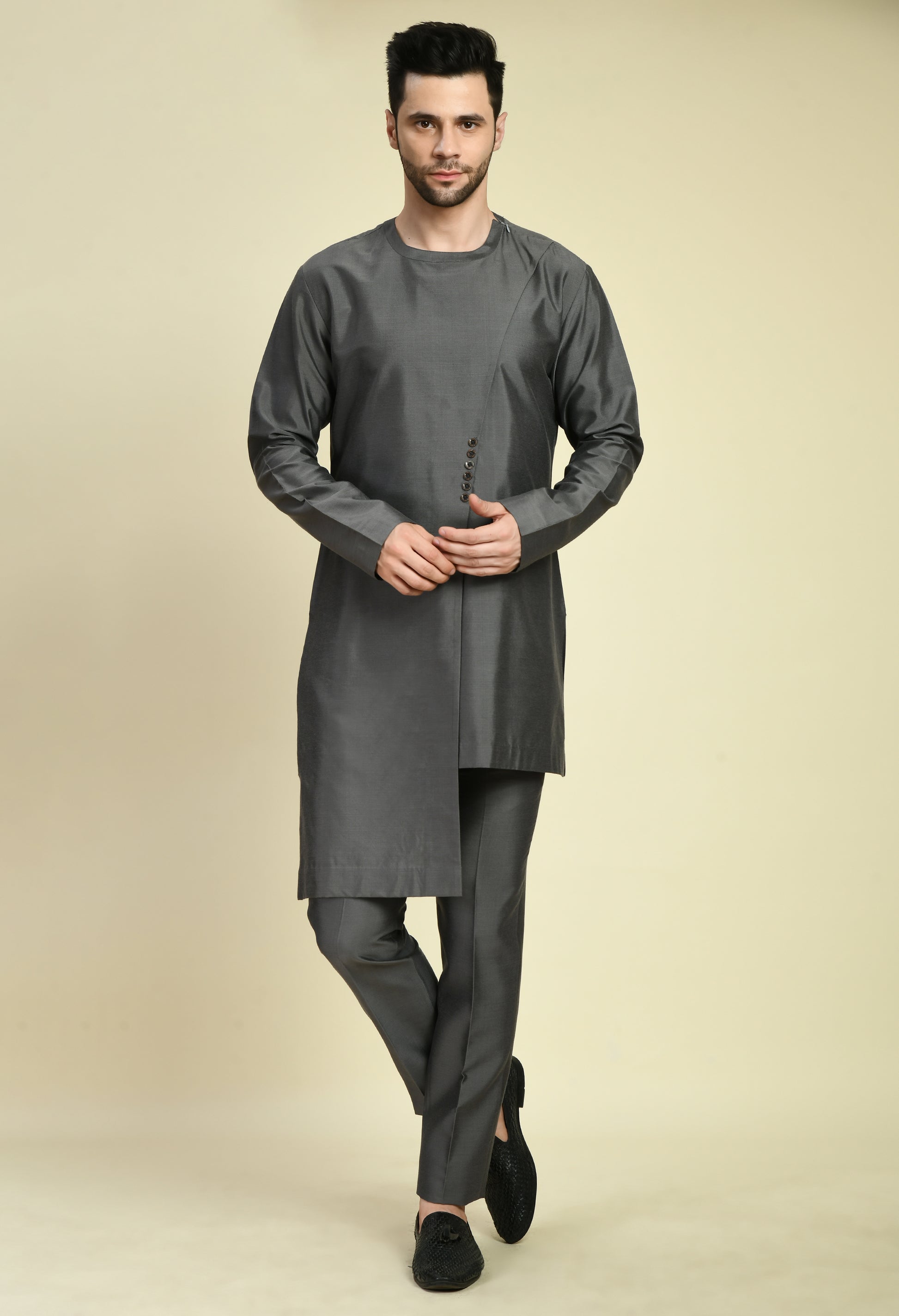 Men’s Kurta Set – Cotton Silk in Grey with Assymetric Hem and Front Overlap Design | One Man Show