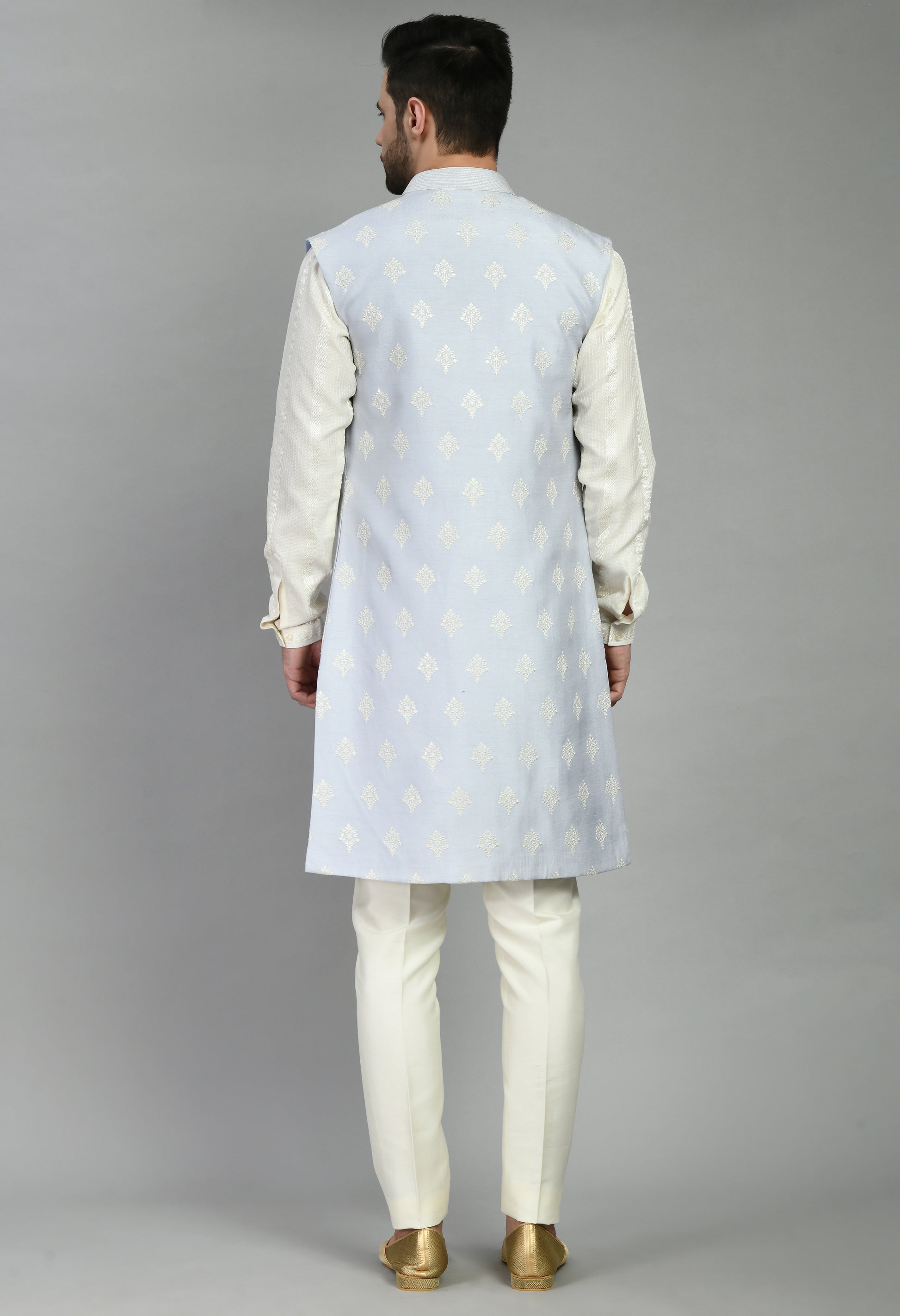 Crafted from premium silk, this Nehru jacket exudes elegance and sophistication. The floral motif embroidery in silk thread adds a touch of artistry, making it perfect for festive occasions. Pair it with a silk kurta and cotton lycra lower for a complete ensemble that ensures comfort and style.