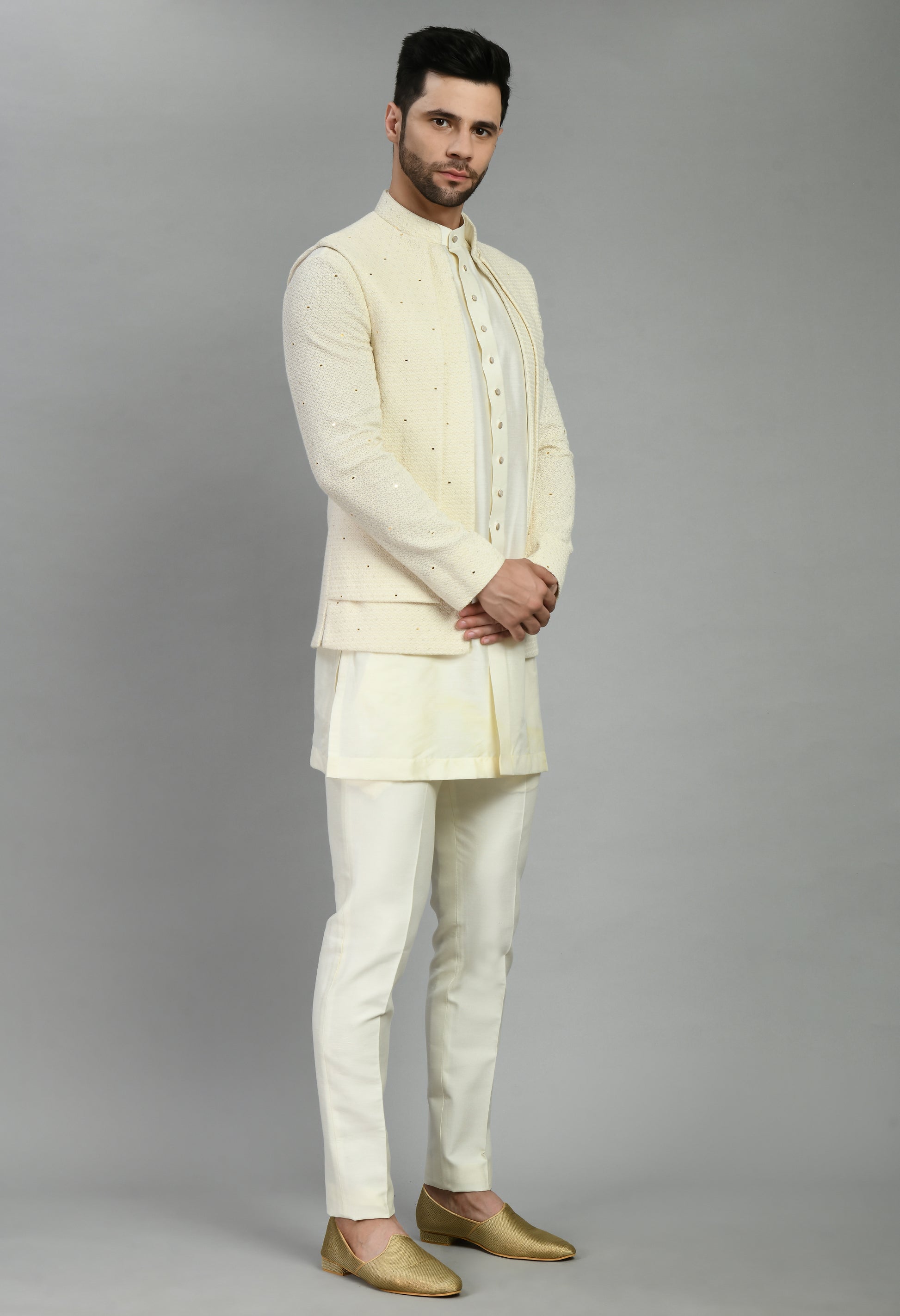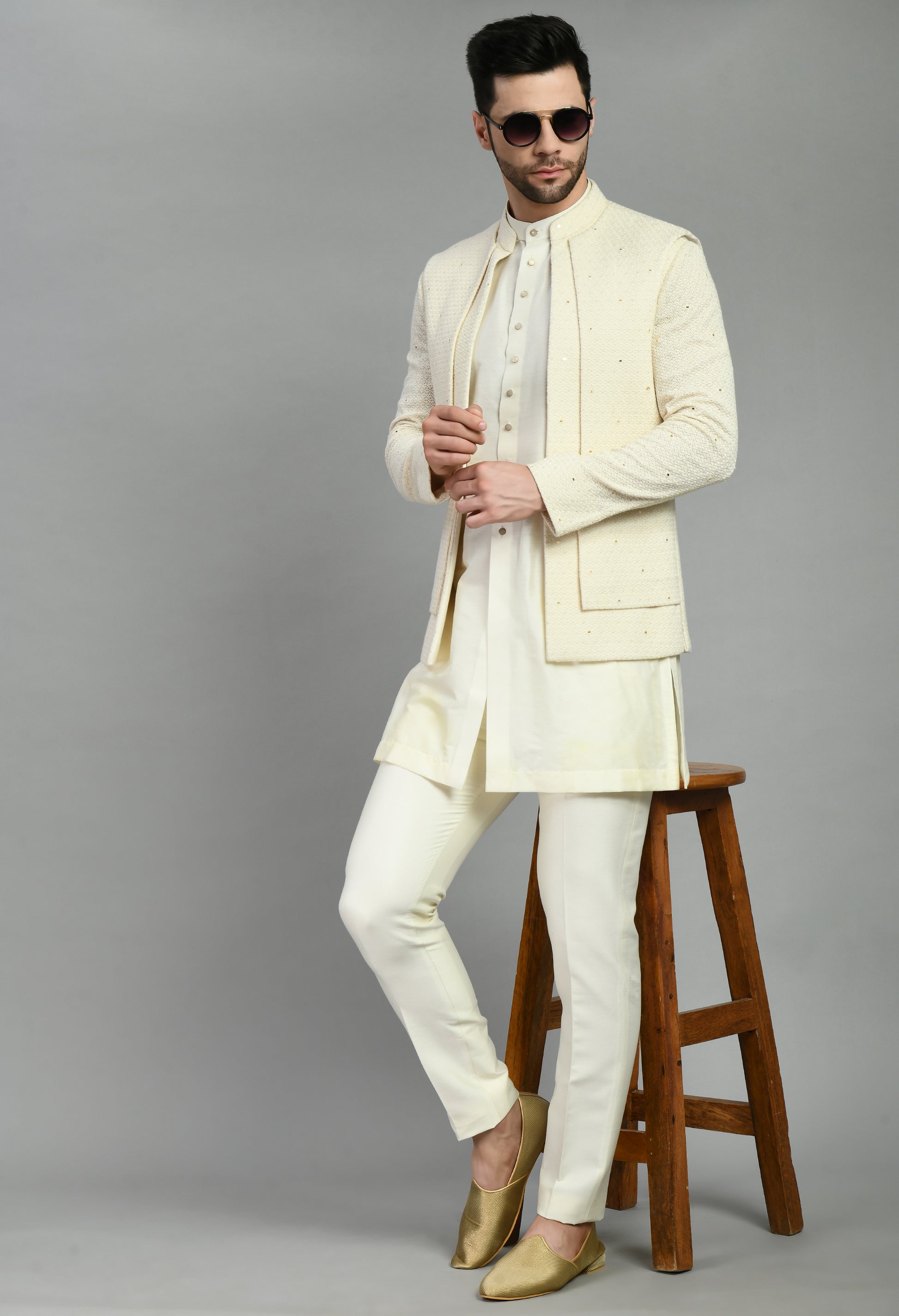 Men’s Nehru Jacket – Silk Georgette in Cream with Thread and Sequins Embroidery | One Man Show
