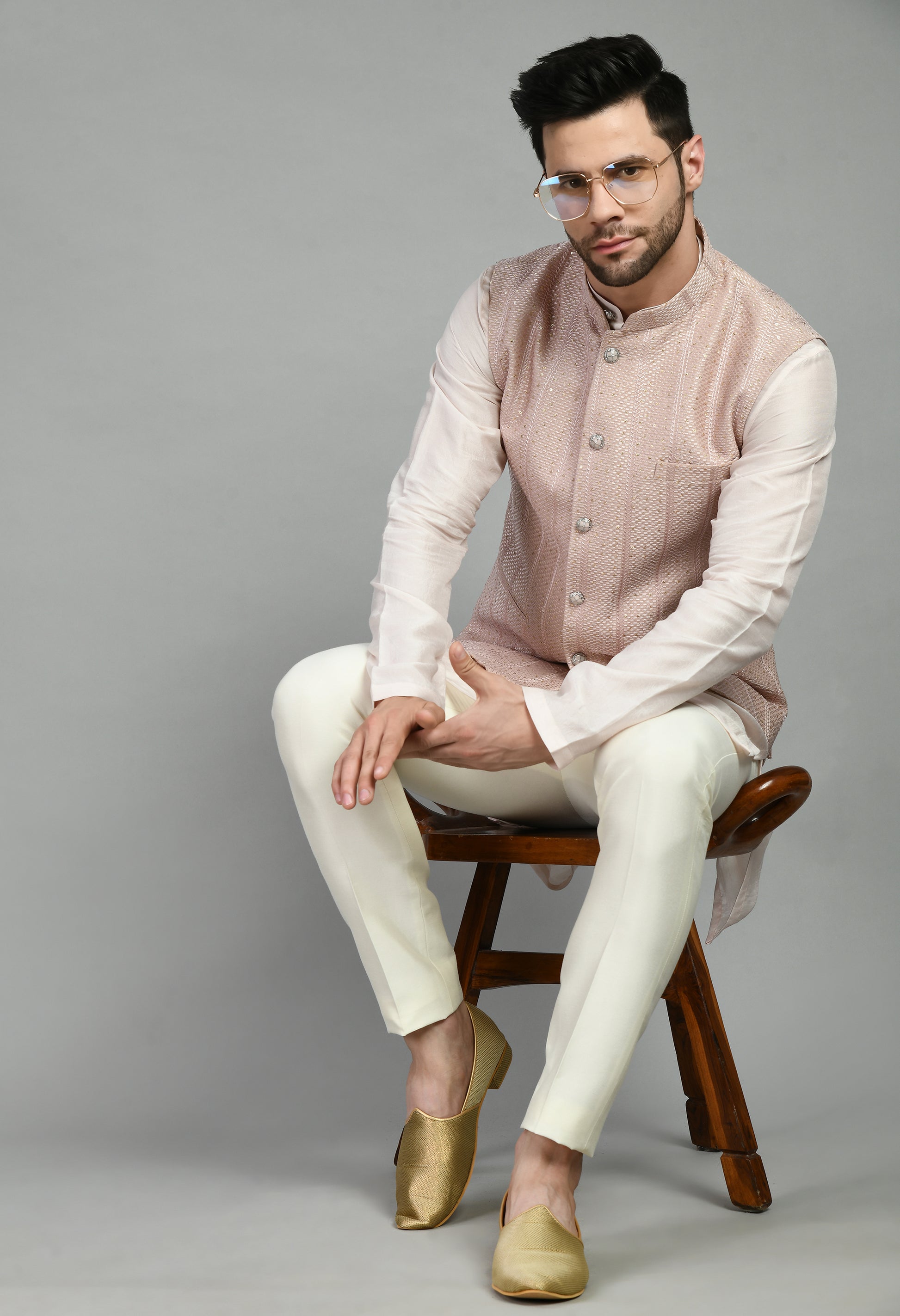Men’s Nehru Jacket – Silk Georgette in Pink with Thread and Sequins Embroidery | One Man Show