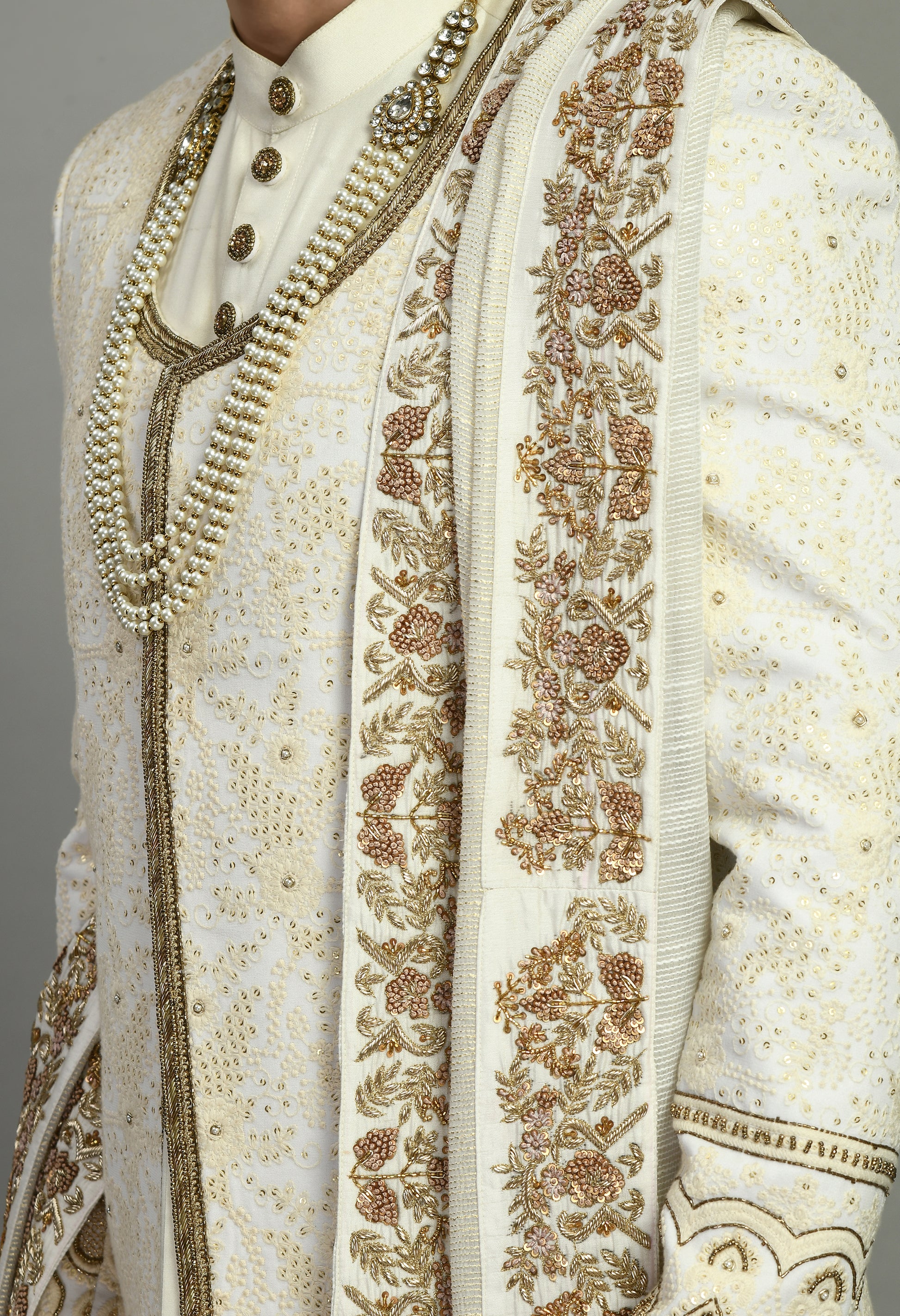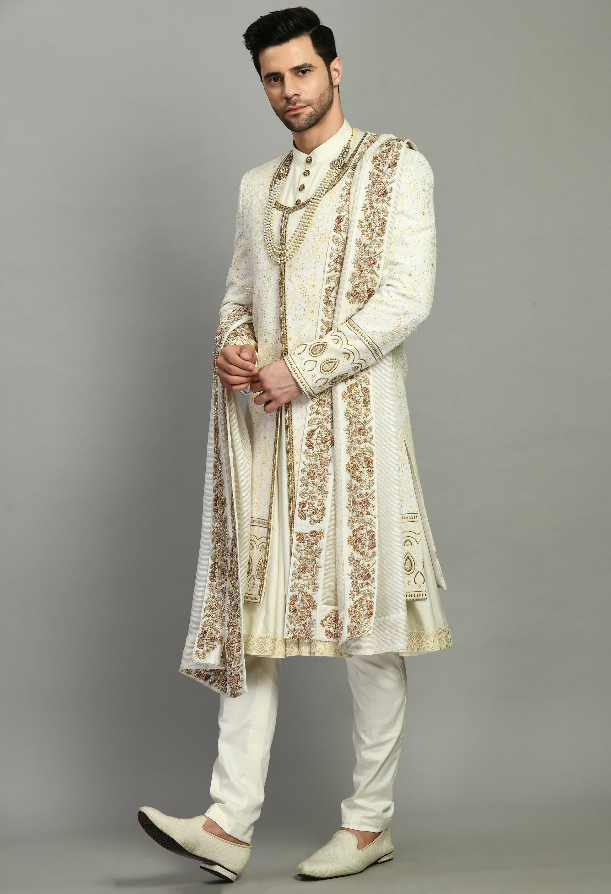 Men’s Sherwani – Silk in Ivory with Detailed Hand Embroidery Allover | One Man Show