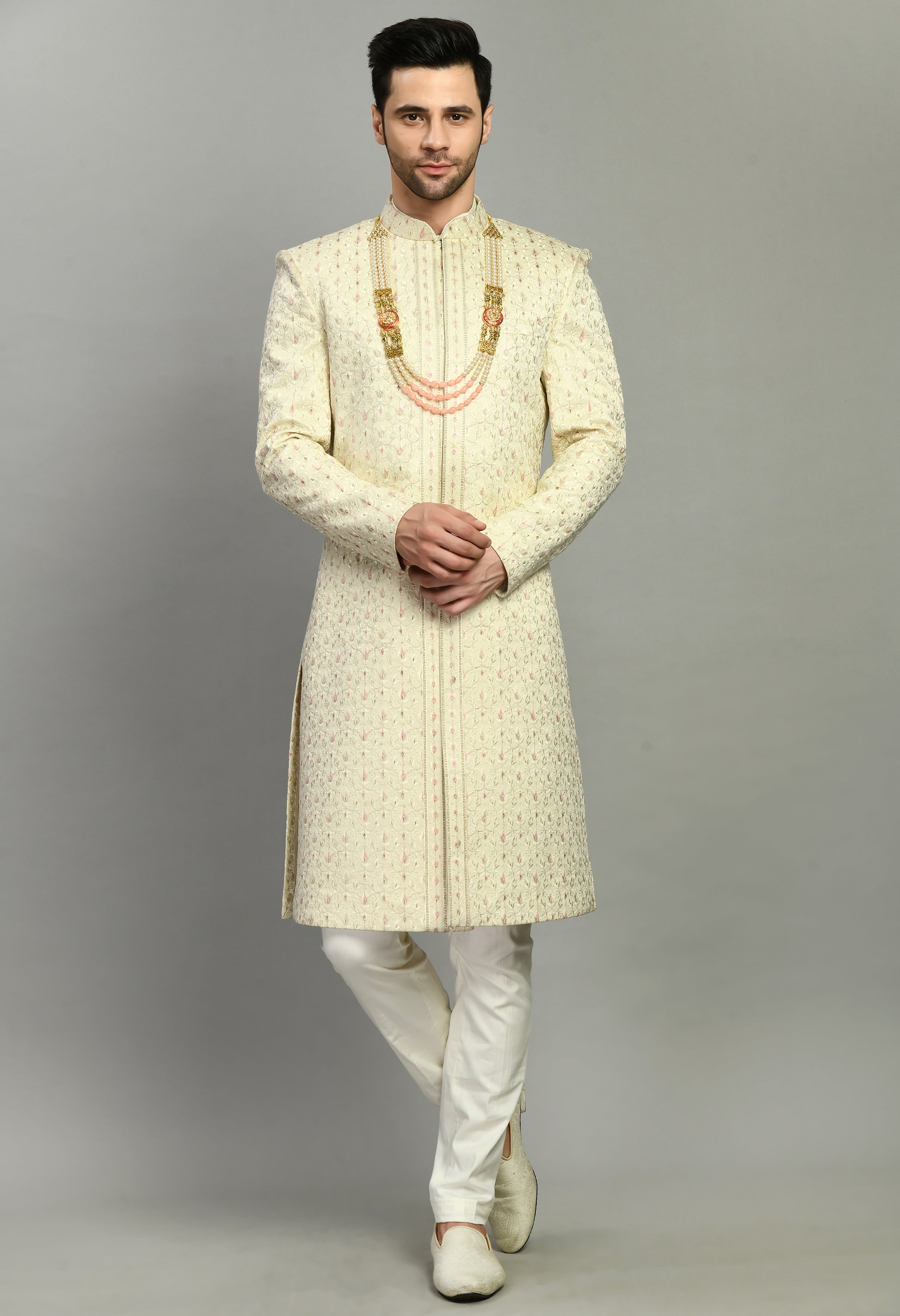 Men’s Sherwani – Silk in Cream with Detailed Hand Embroidery Allover | One Man Show