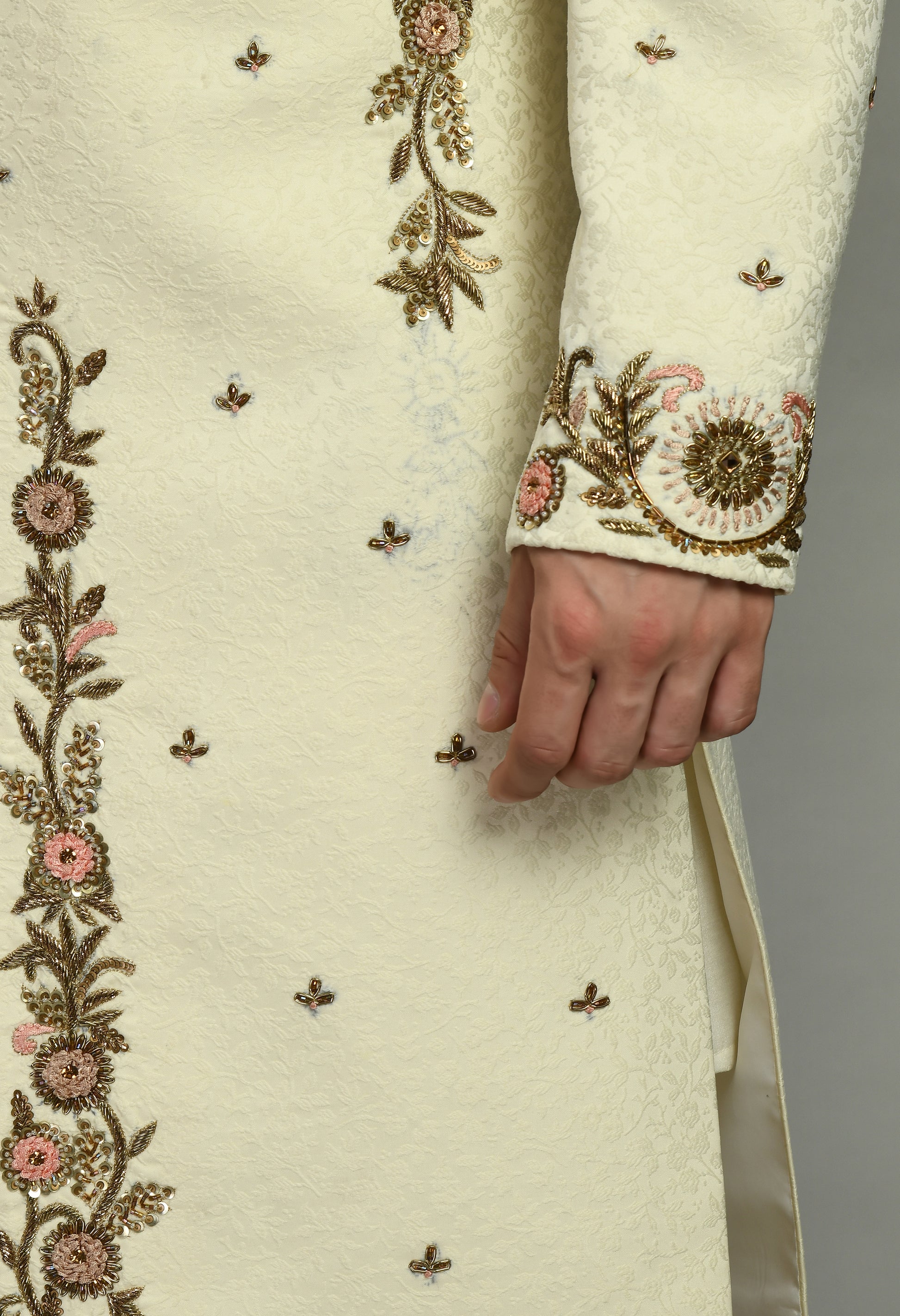 Men’s Sherwani – Silk in Ivory with Detailed Hand Embroidery | One Man Show