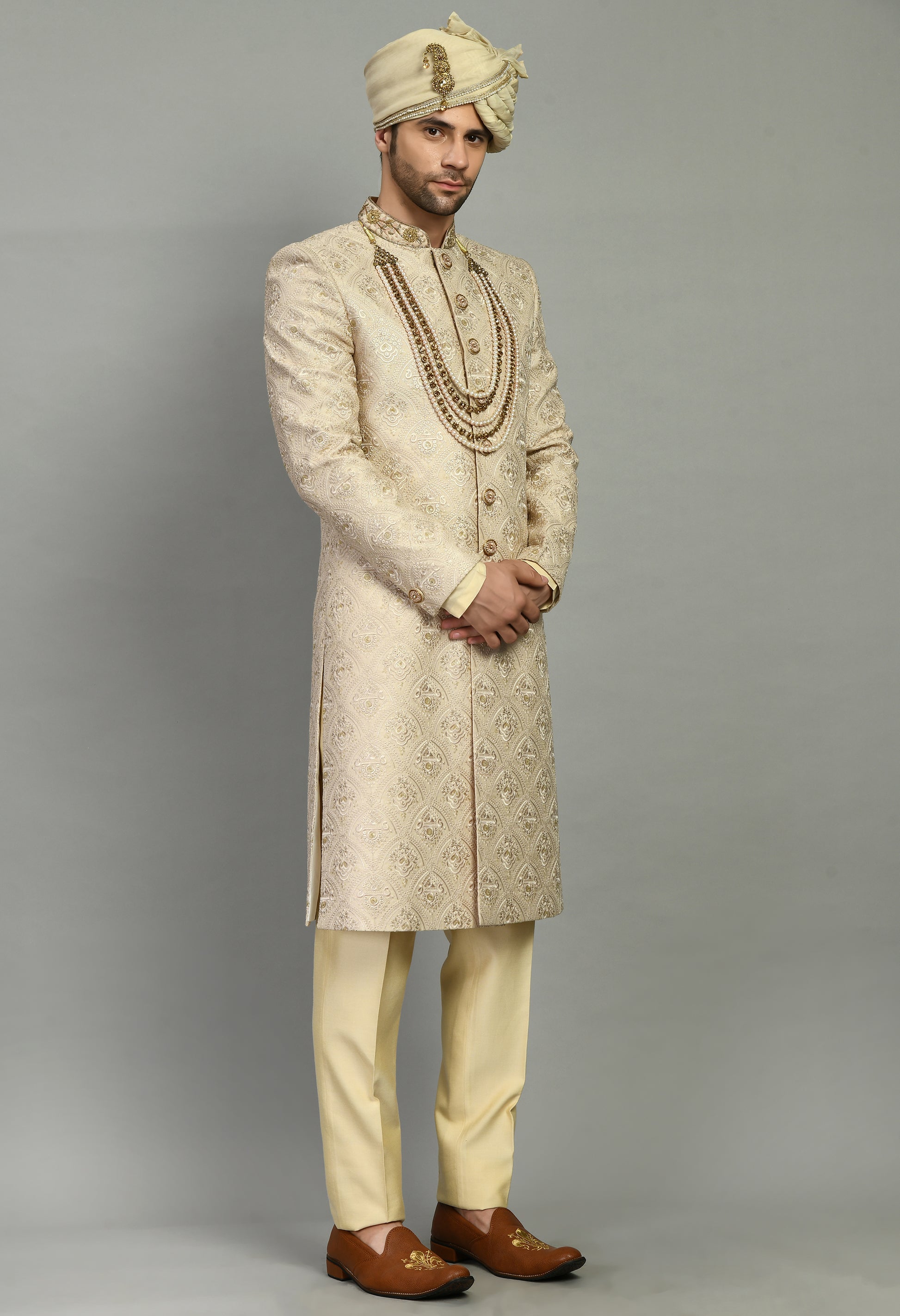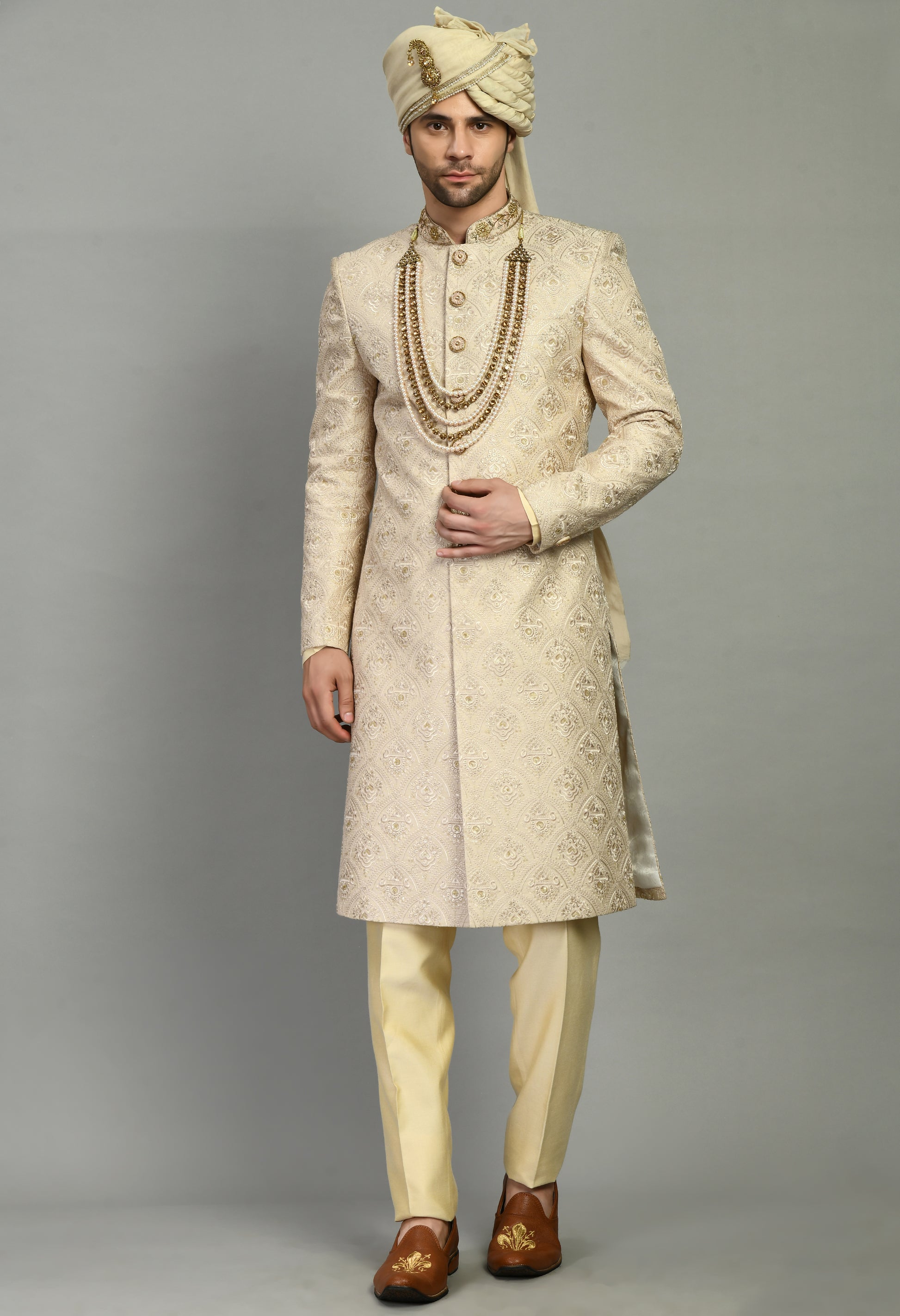 Men’s Sherwani – Silk in Beige with Detailed Hand Embroidery | One Man Show