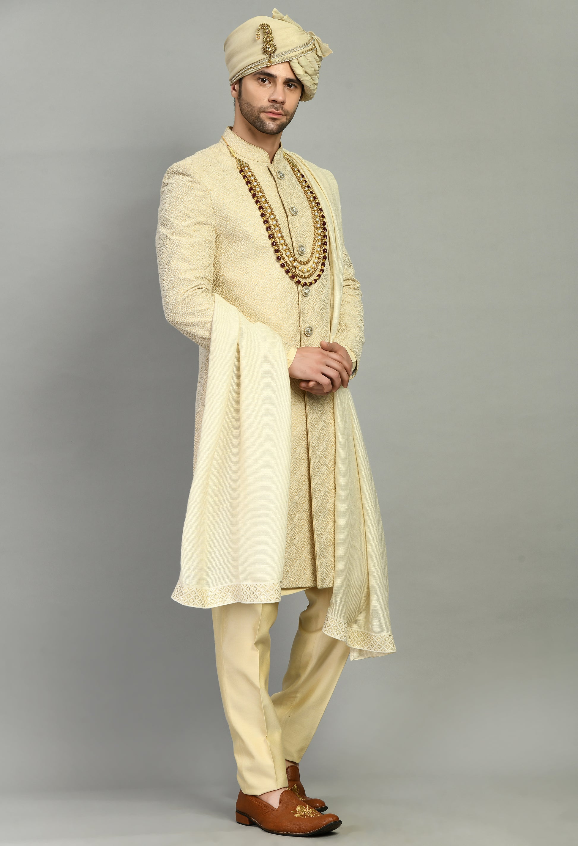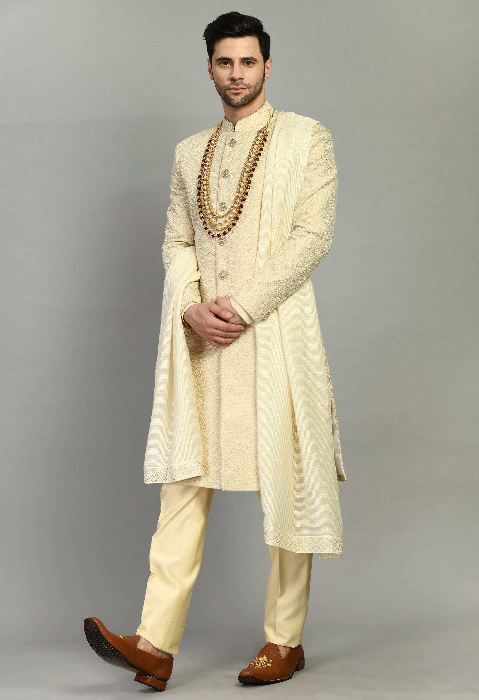 Men’s Sherwani – Silk in Cream with Detailed Hand Embroidery Allover | One Man Show