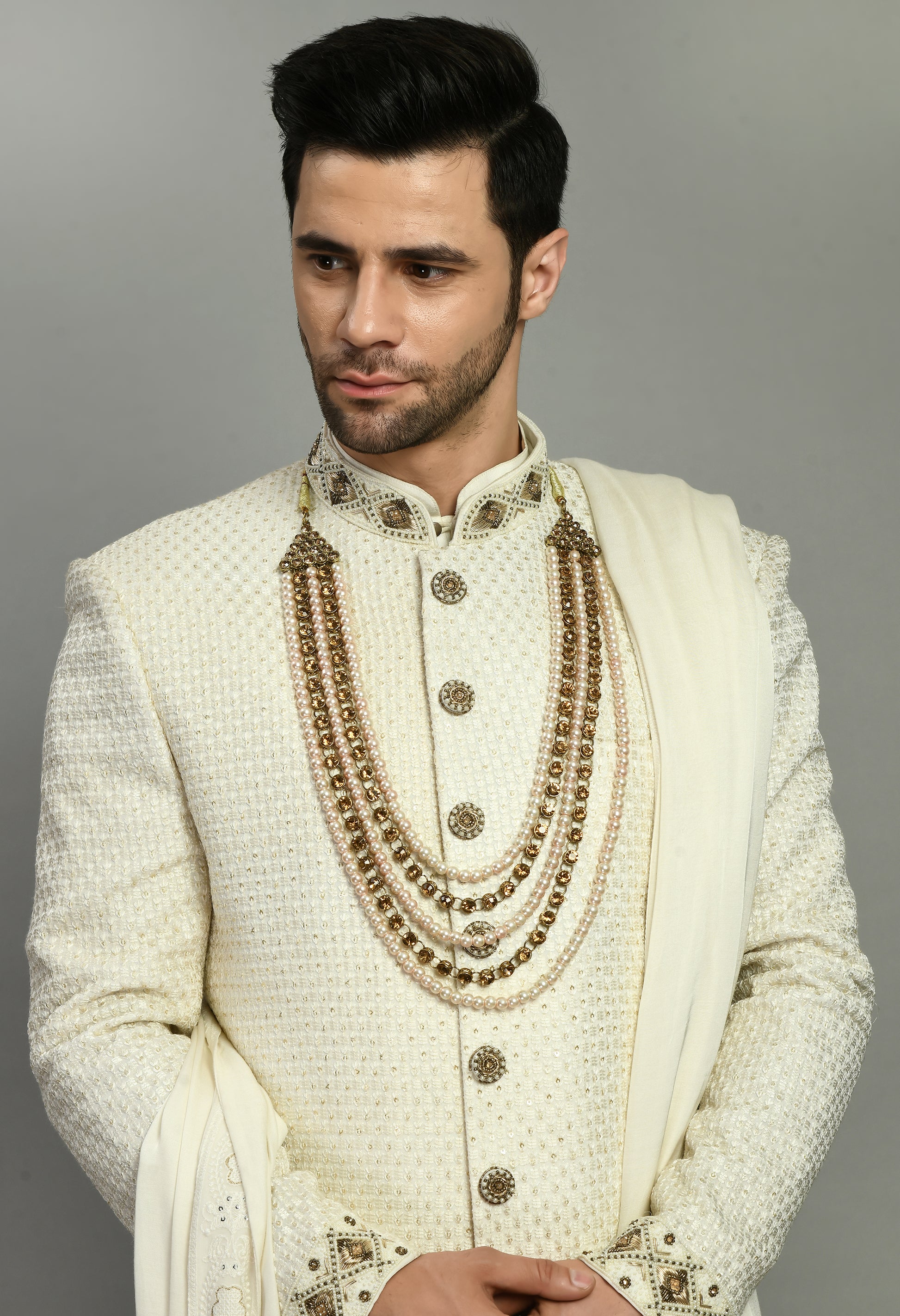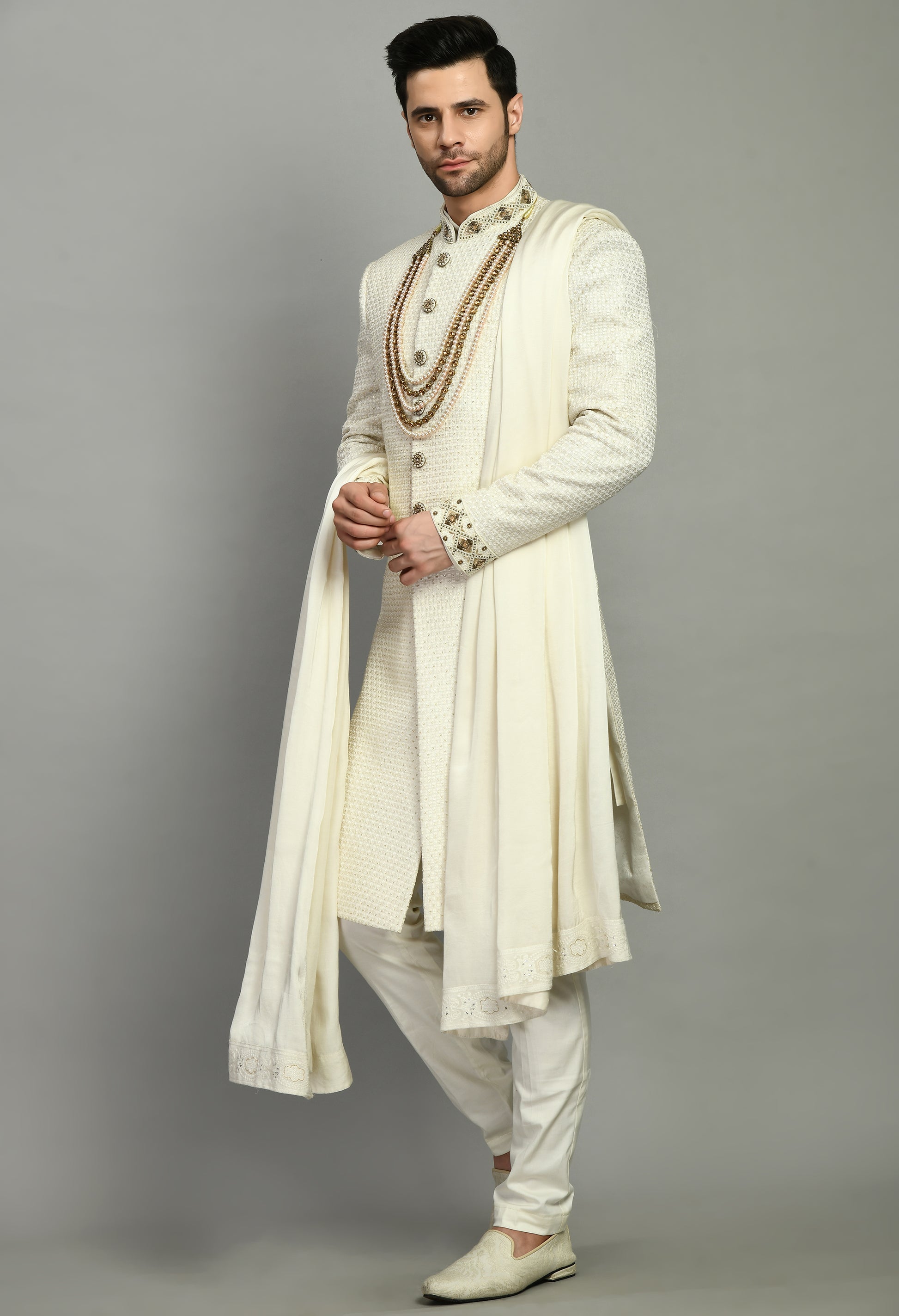 Men’s Sherwani – Silk in Ivory with Detailed Hand Embroidery | One Man Show