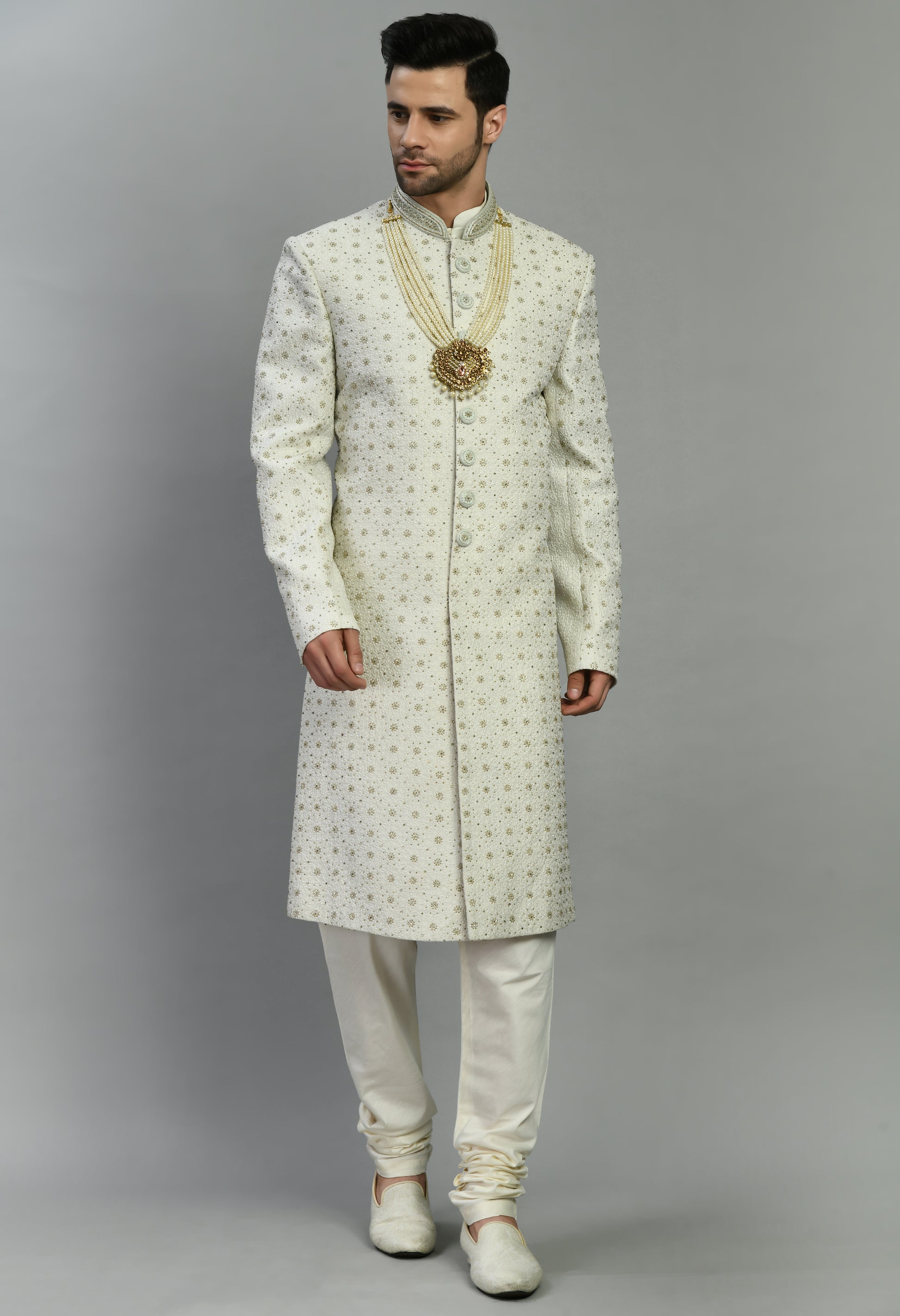Men’s Sherwani – Silk in Ivory with Detailed Hand Embroidery Allover | One Man Show