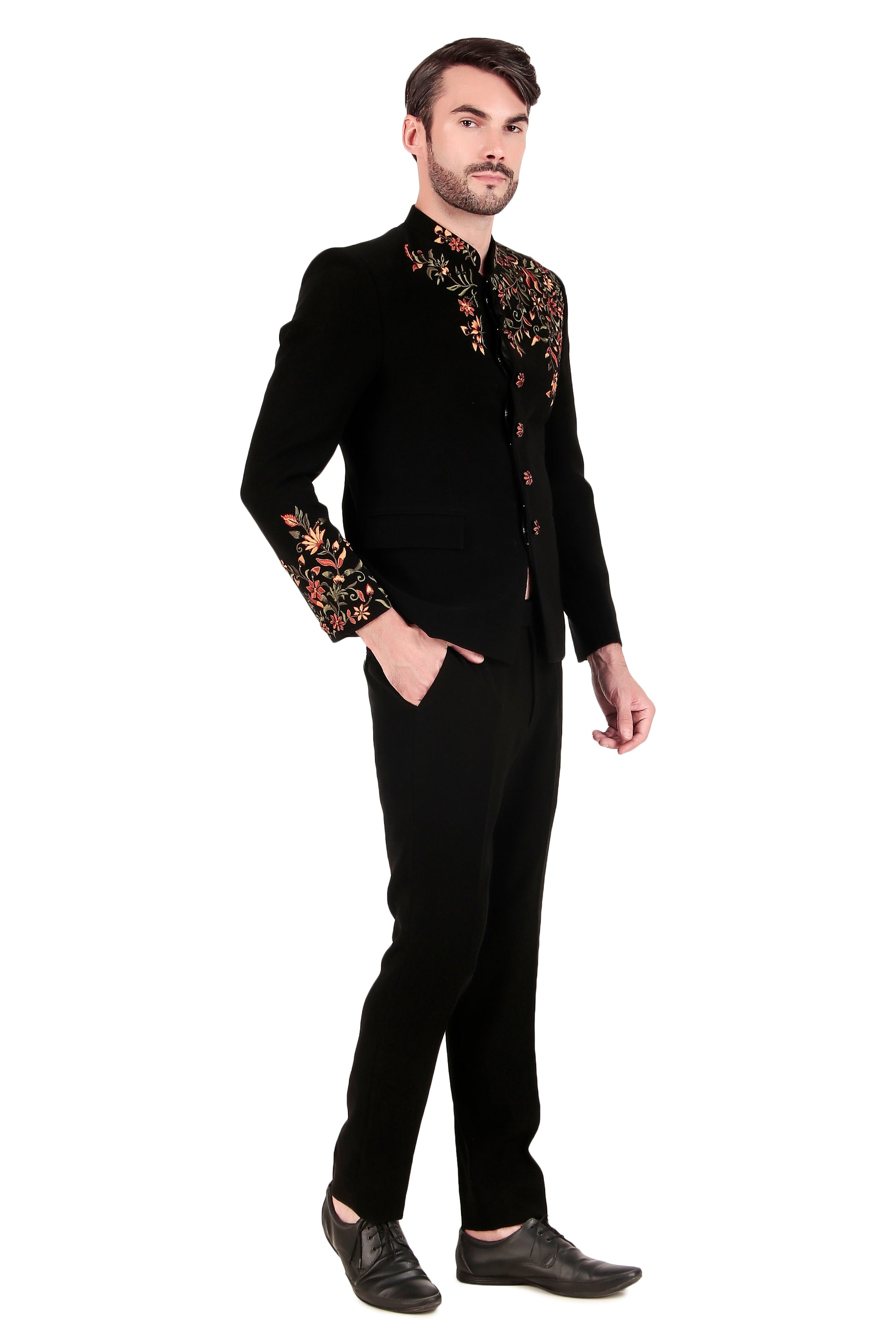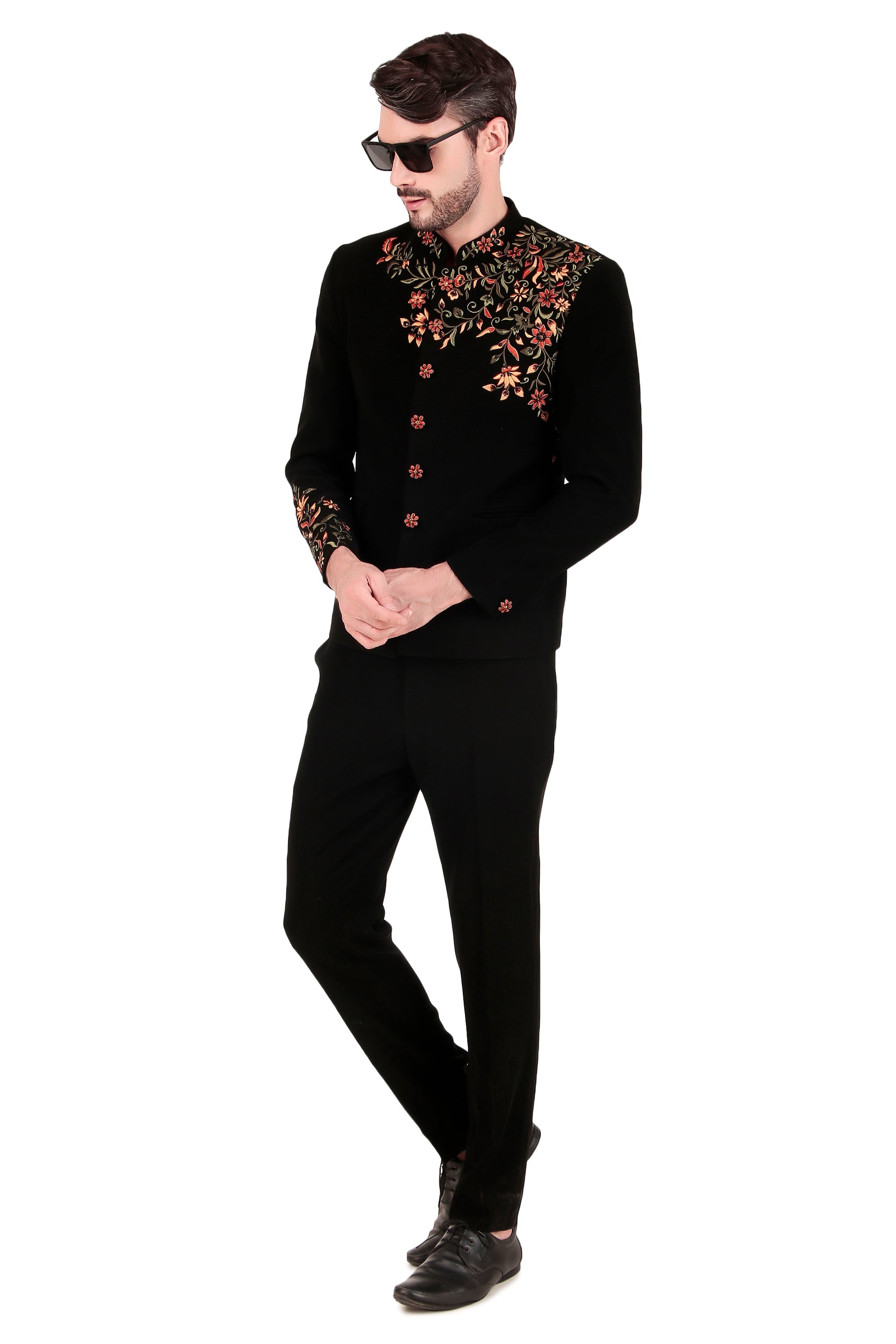 Men’s Bandhgala – Japanese Lycra in Black with Angrakha Bandhgala & Silk Thread Embroidery | One Man Show