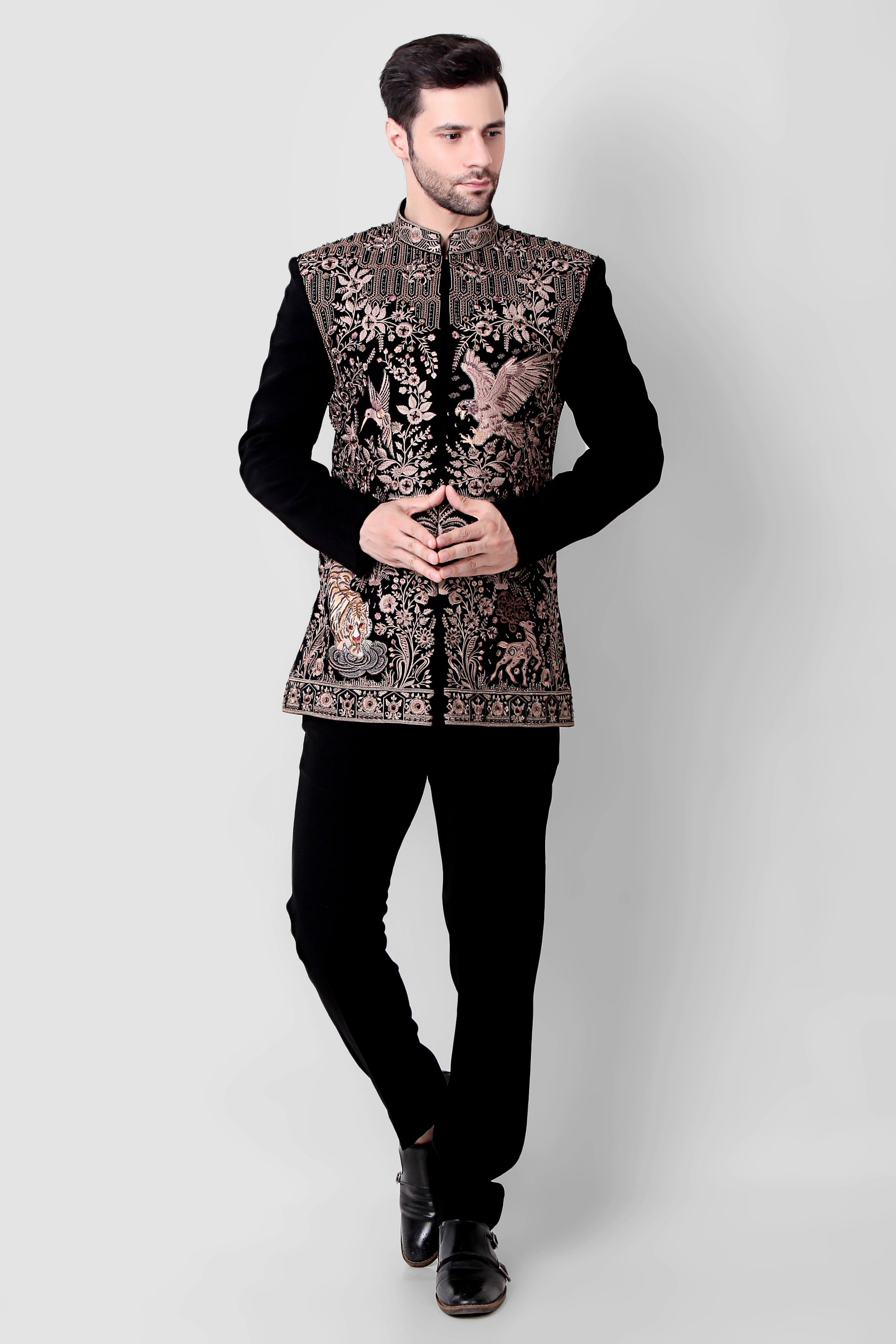 Men’s Bandhgala – Japanese Lycra in Black with Royal Palace Theme Embroidery | One Man Show