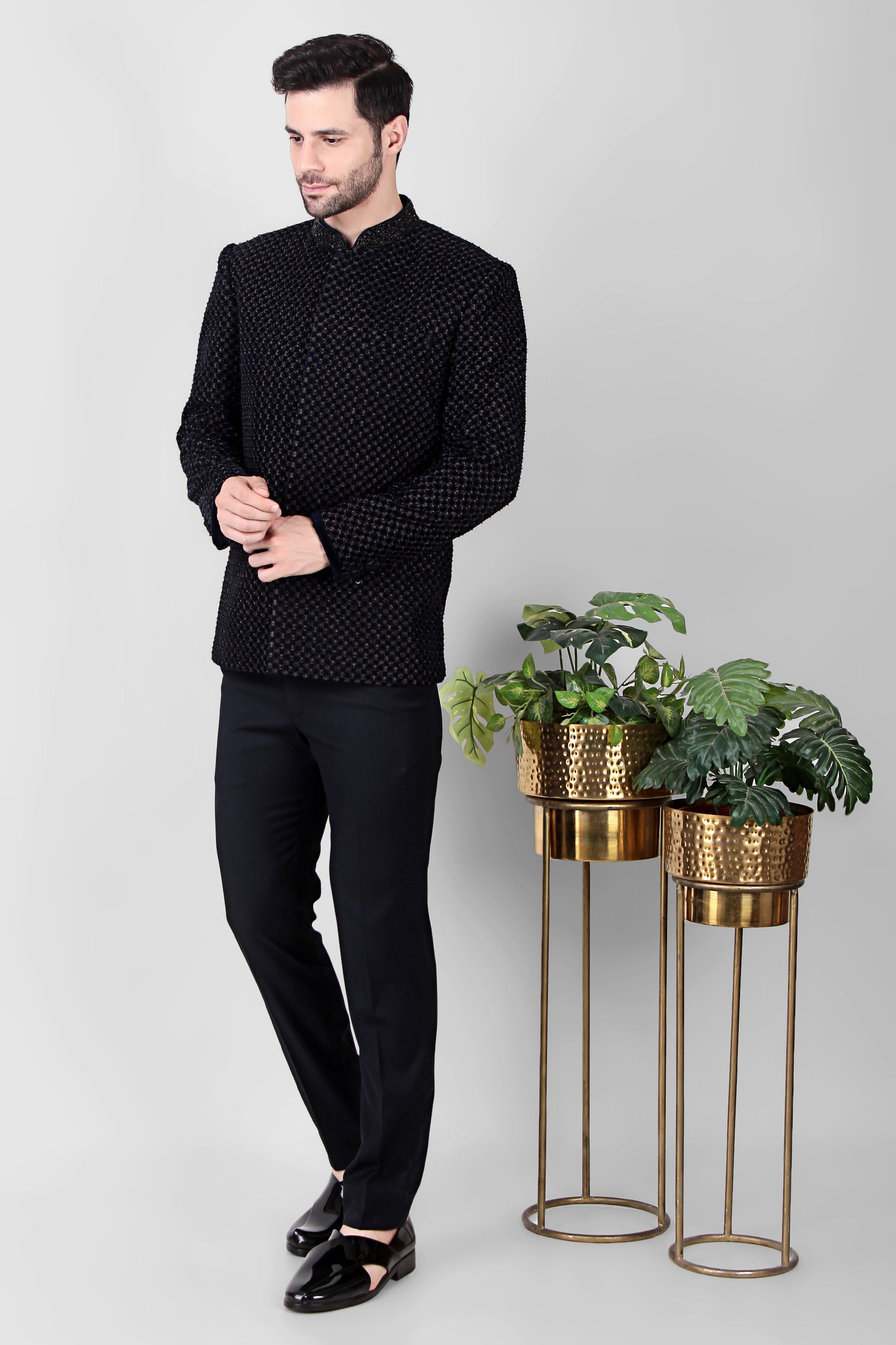 Men’s Bandhgala – Velvet in Black with Beads Embroidery | One Man Show