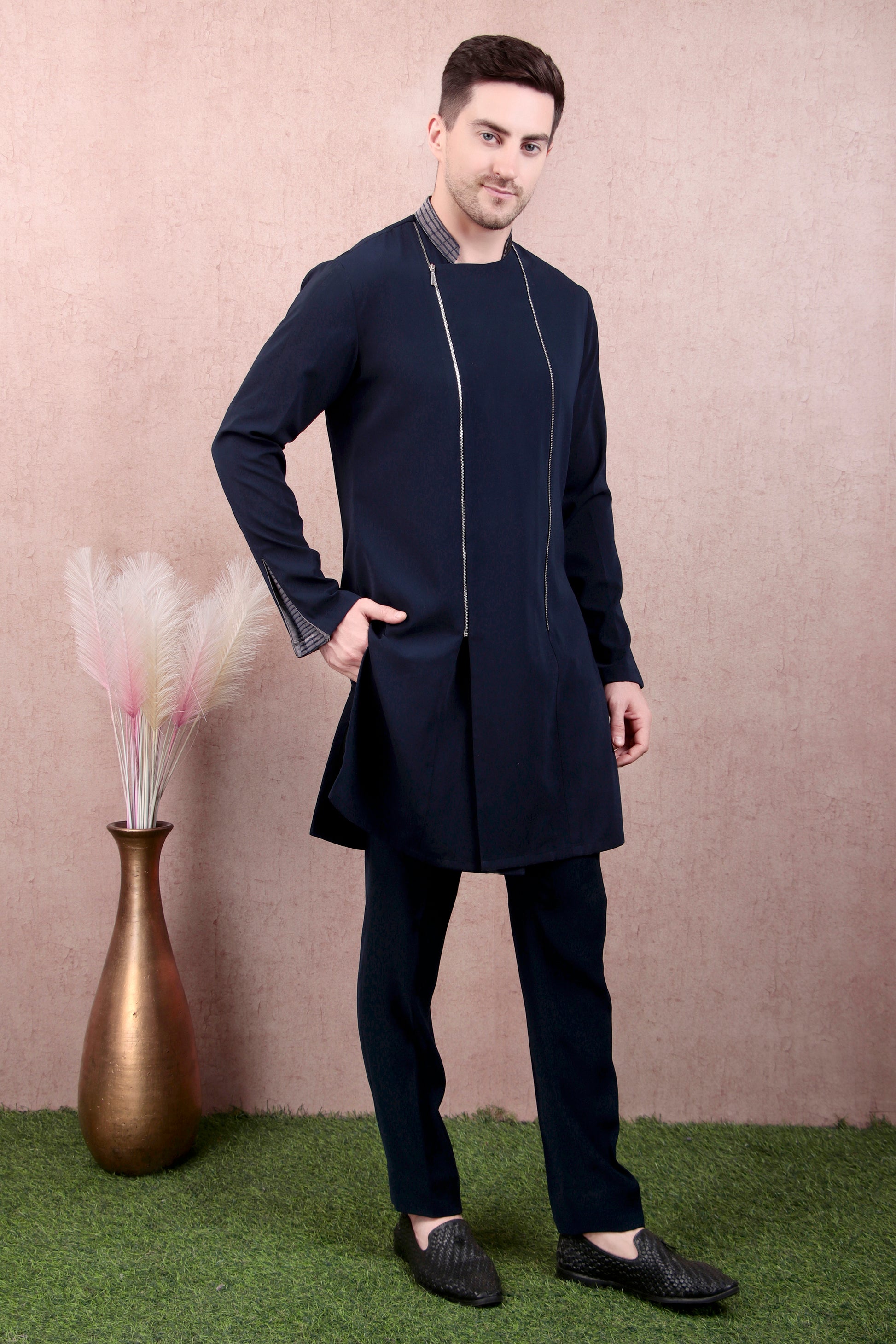Men’s Kurta Set – Asymmetric Zip Placket in Navy with Band Collar & Contrast Lining | One Man Show