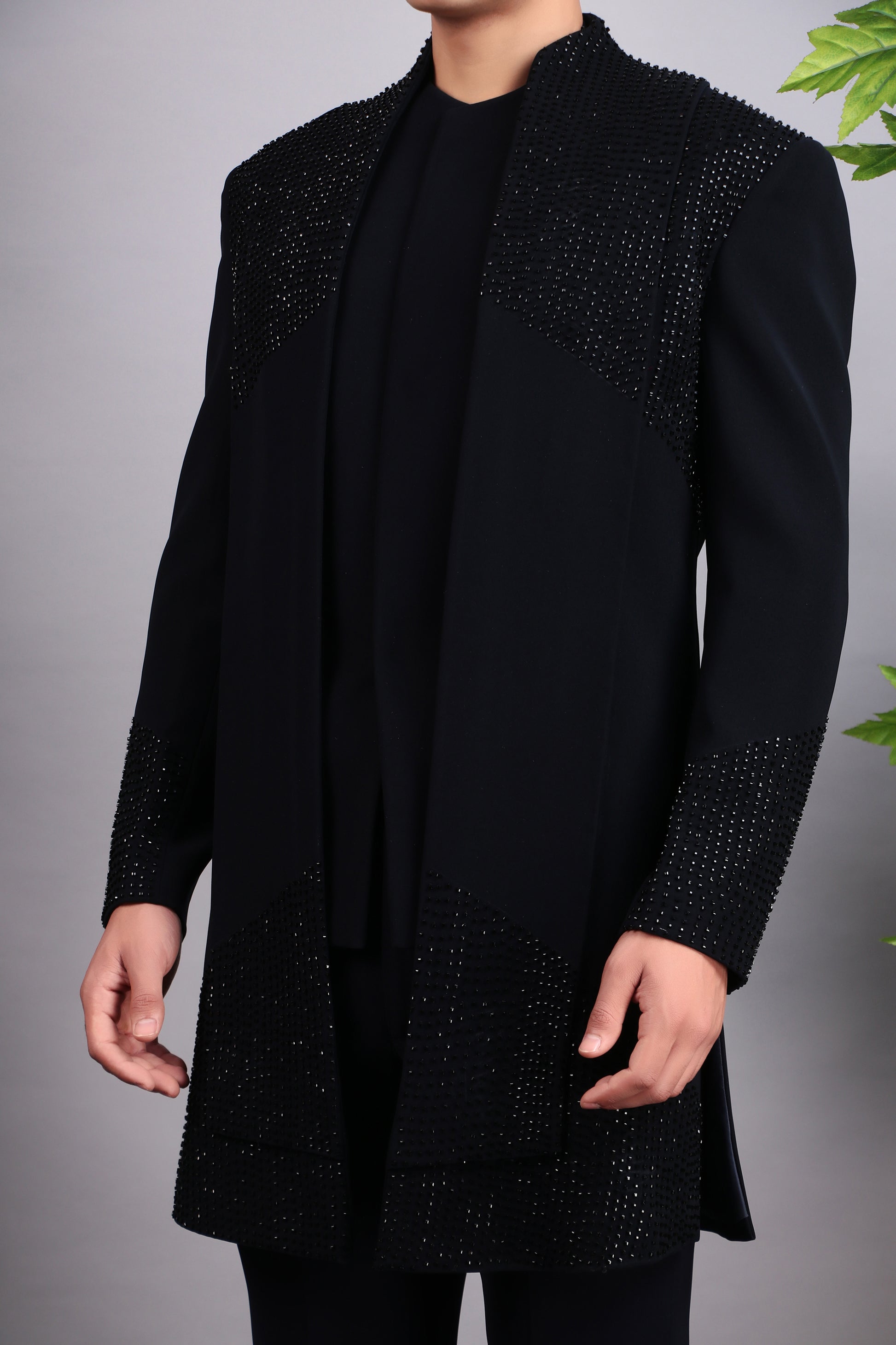 Crafted from premium Japanese Lycra, this Indo-Western ensemble features a modern yet abstract cut, perfect for festive occasions. The jacket showcases intricate beads and stones embroidery, adding a touch of elegance to the silhouette. The front-open design enhances versatility, making it suitable for both formal and semi-formal events.