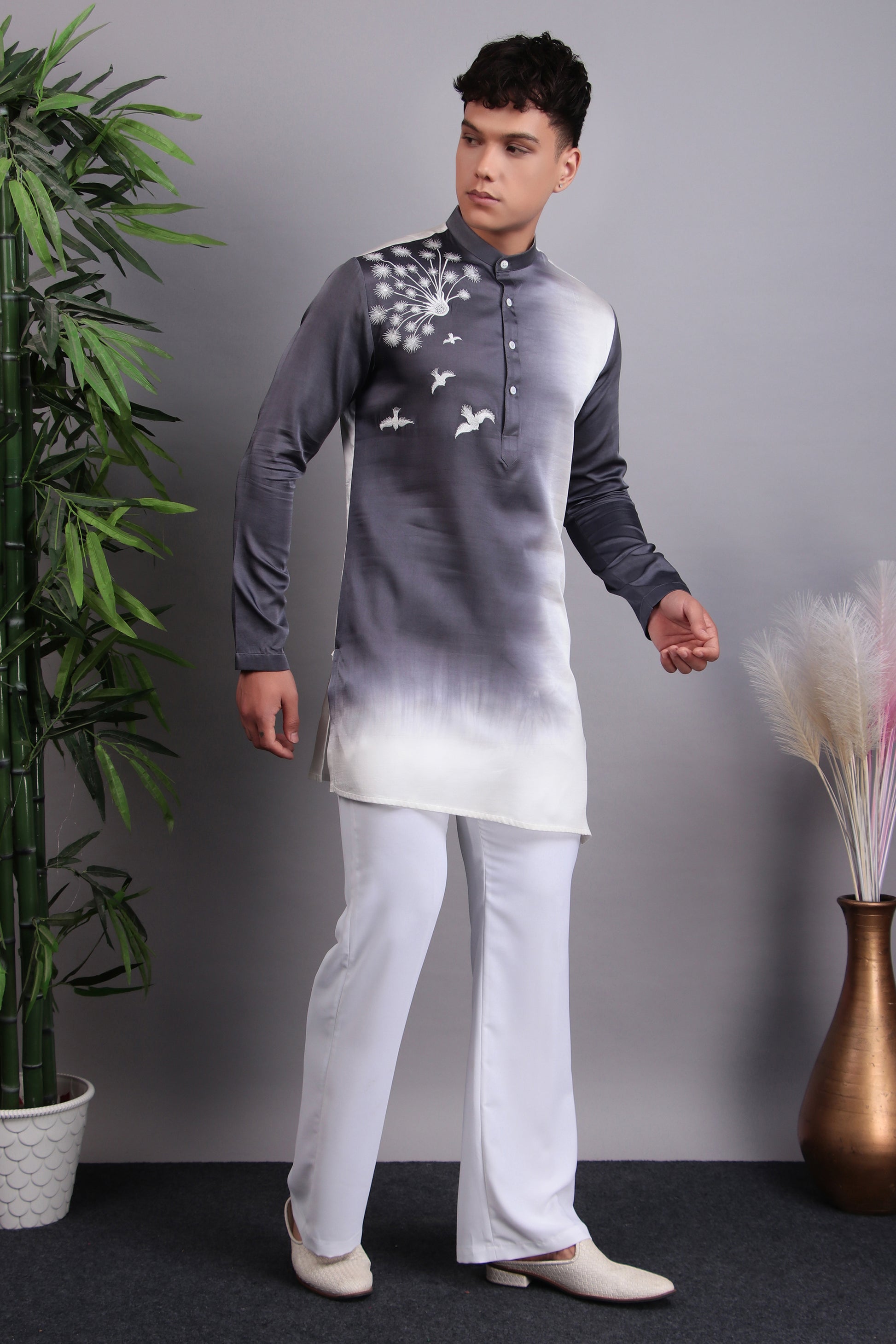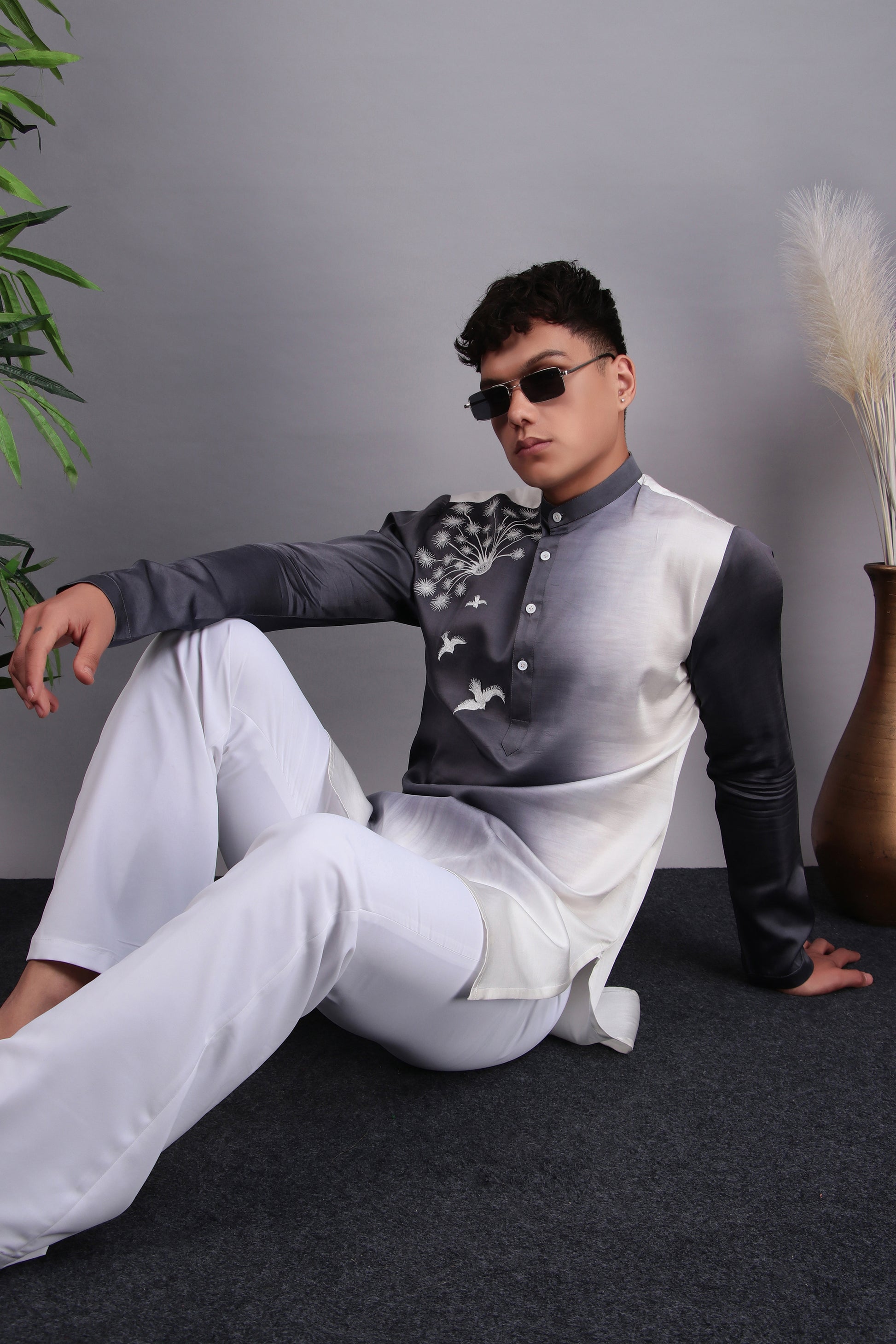 Crafted from soft modal satin, this kurta set features a refined drape and a modern silhouette, perfect for celebrations. The silk thread embroidery, complemented by a tie and dye placement dyeing technique, adds a unique touch to the design. The kurta is tailored to a comfortable length, paired with matching lower pants for a cohesive look.
