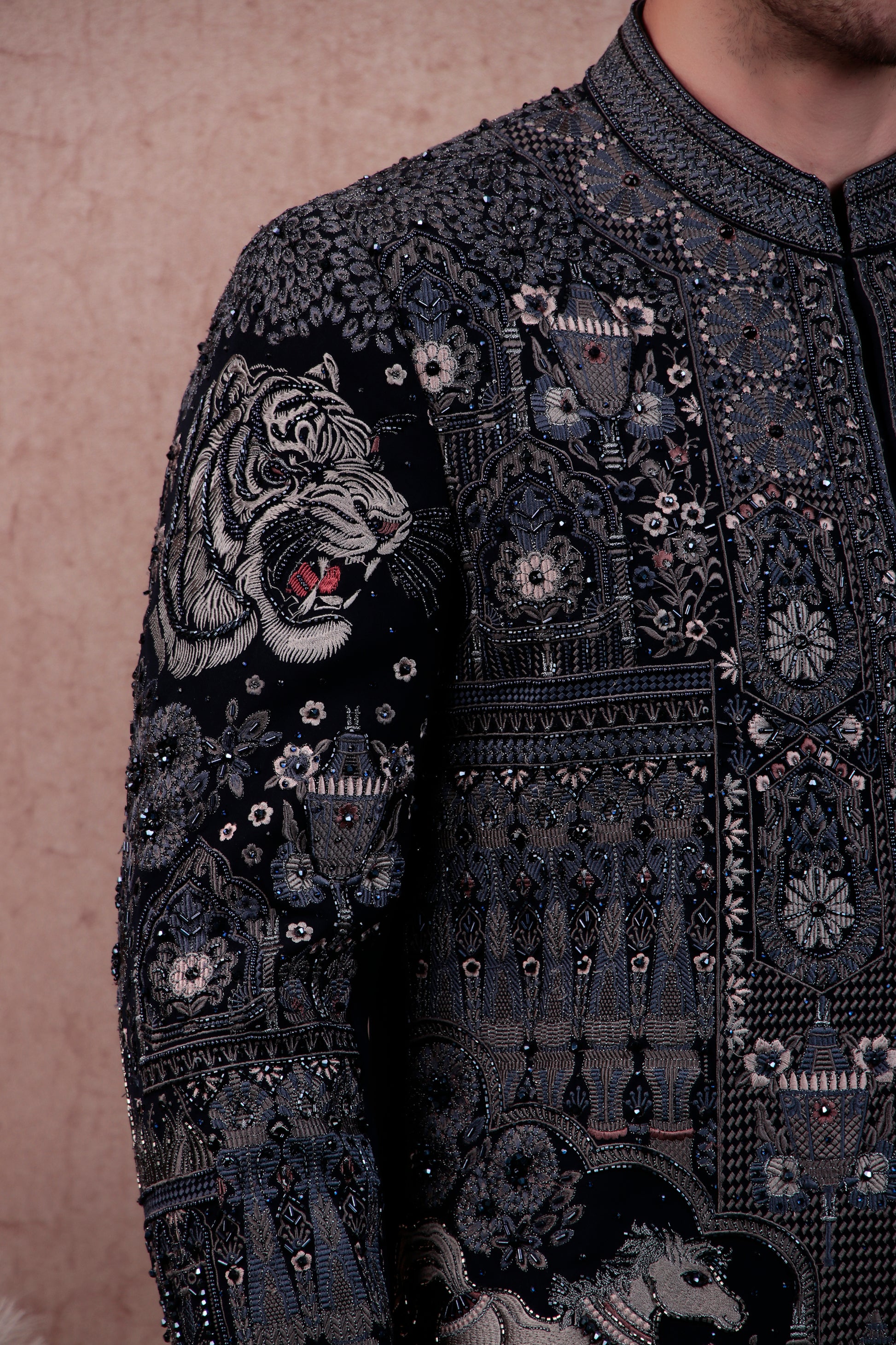 Men’s Bandhgala – Japanese Lycra in Navy Blue with Theme Embroidery Nature | One Man Show