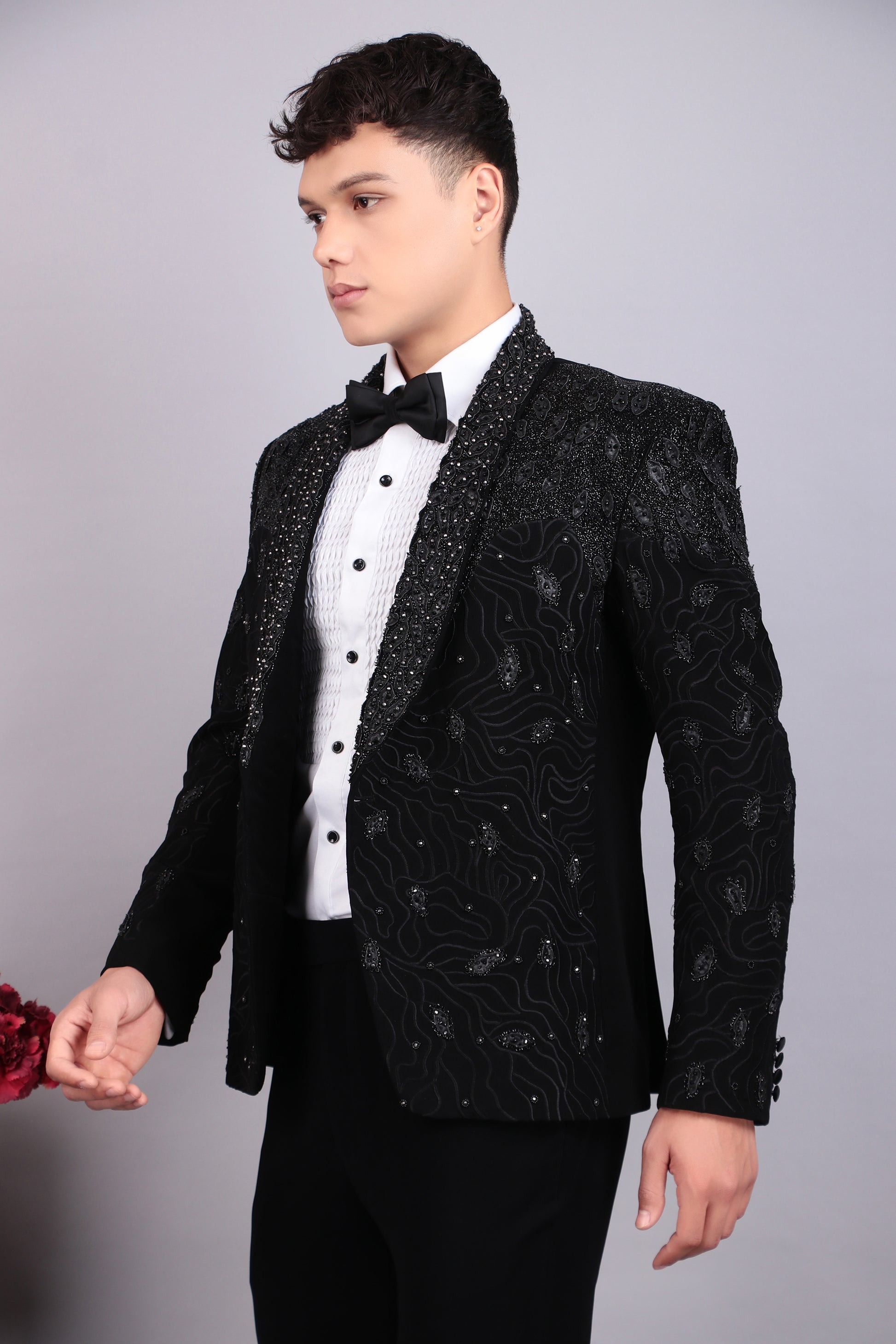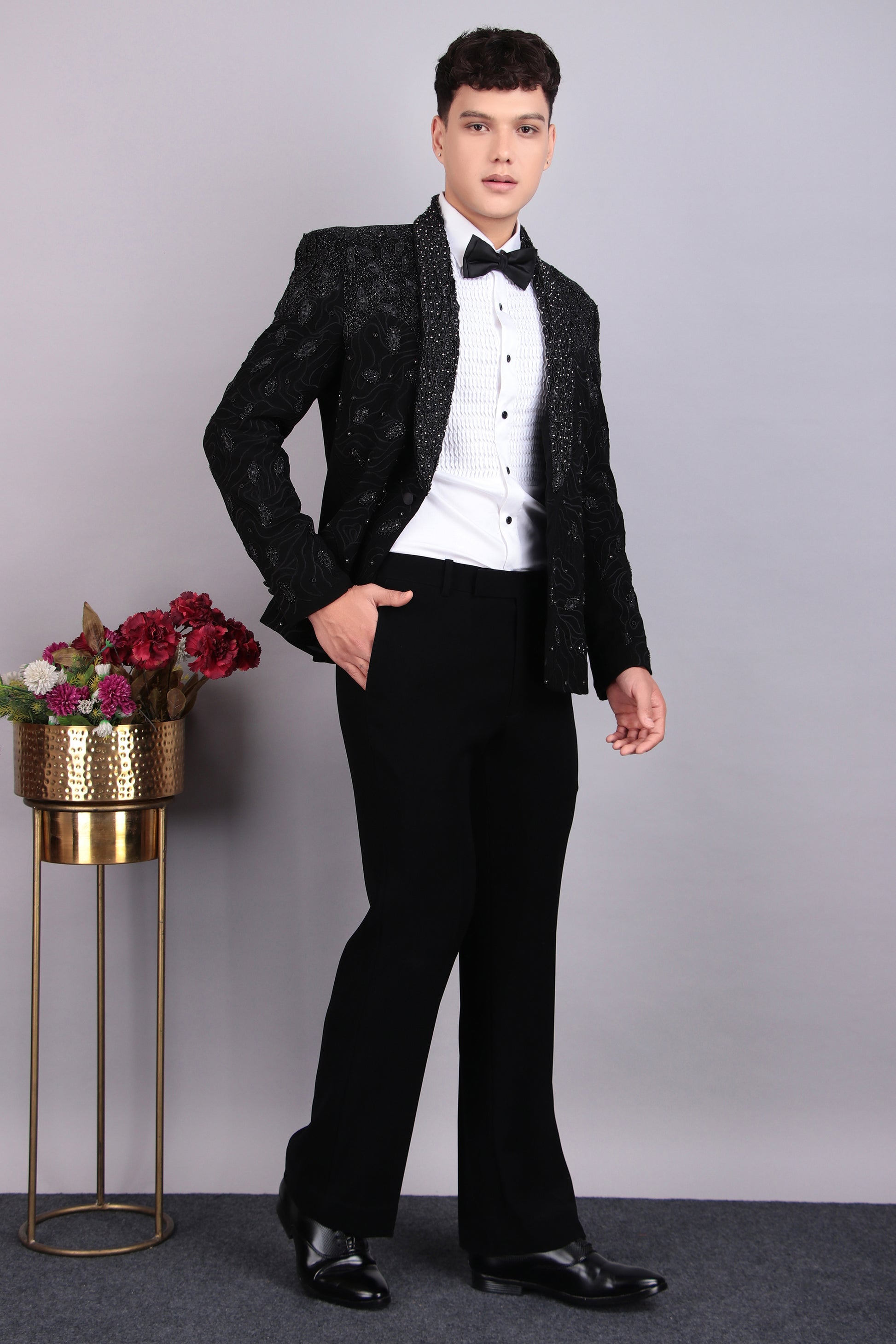 This exquisite tuxedo combines the stretch of Japanese Lycra with the comfort of cotton Lycra for the shirt, ensuring a perfect fit and elegant drape. The standout feature is the intricate blend of multiple embroidery techniques, including zari, beads, and leather appliqué, complemented by silk thread detailing. The tailored silhouette offers a modern yet classic look, ideal for formal occasions.