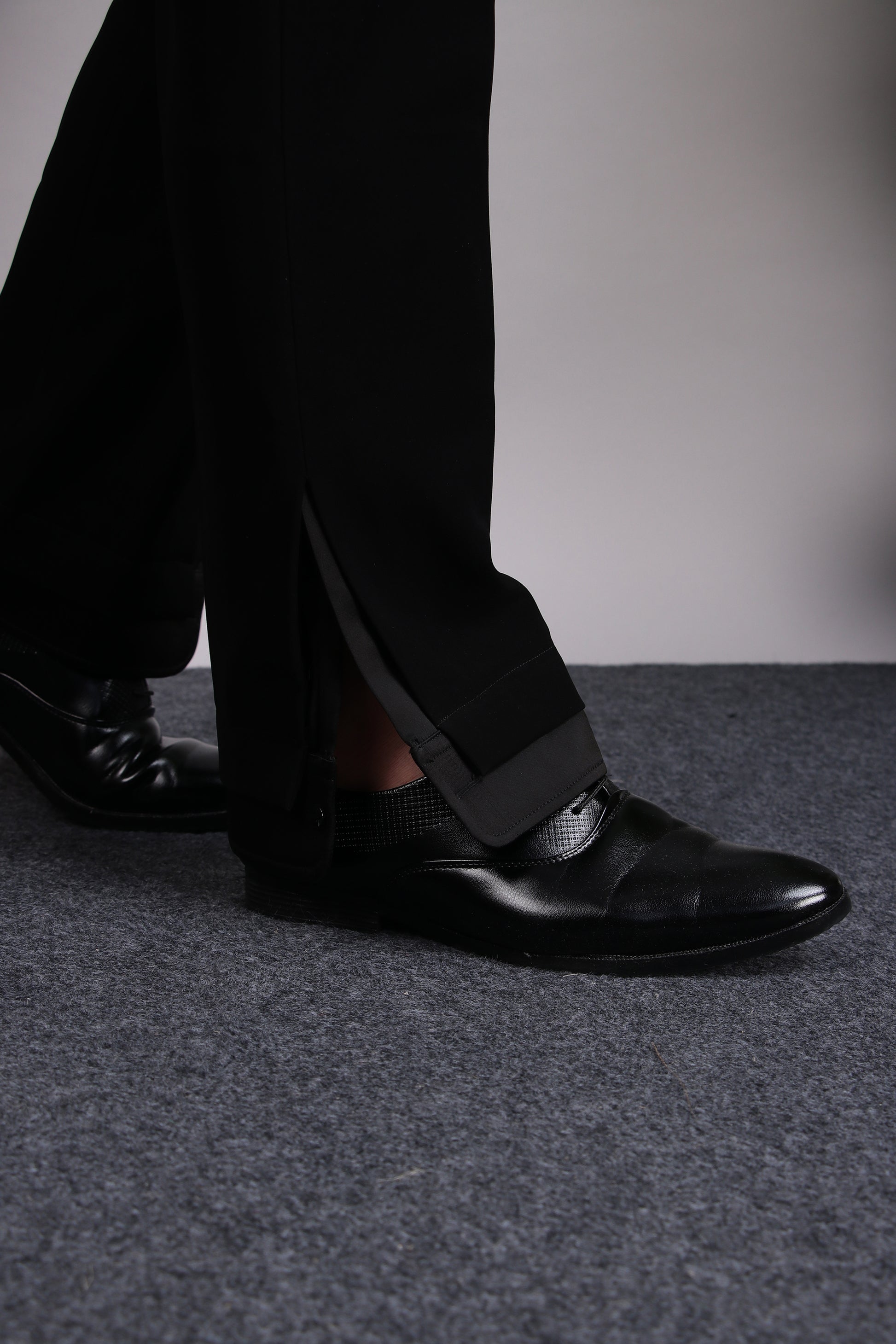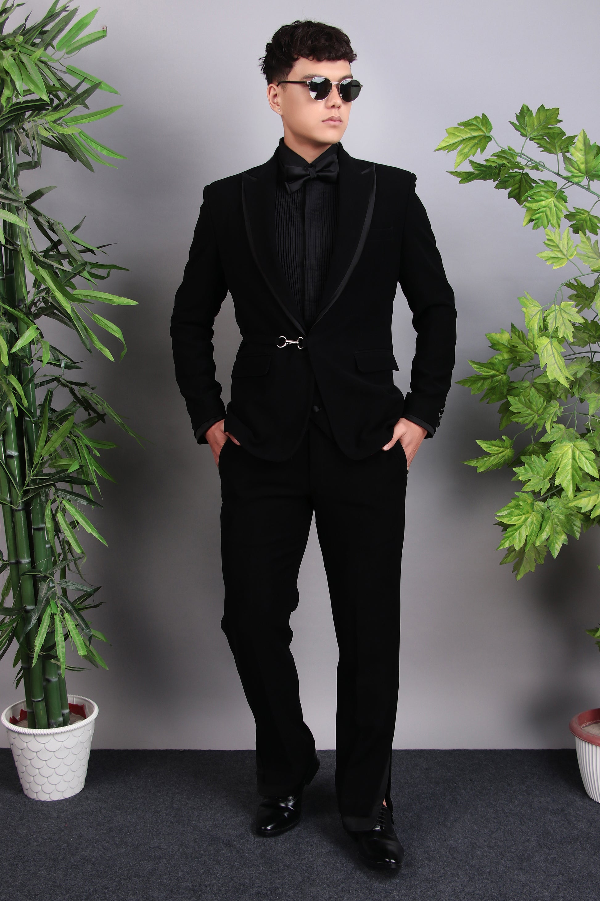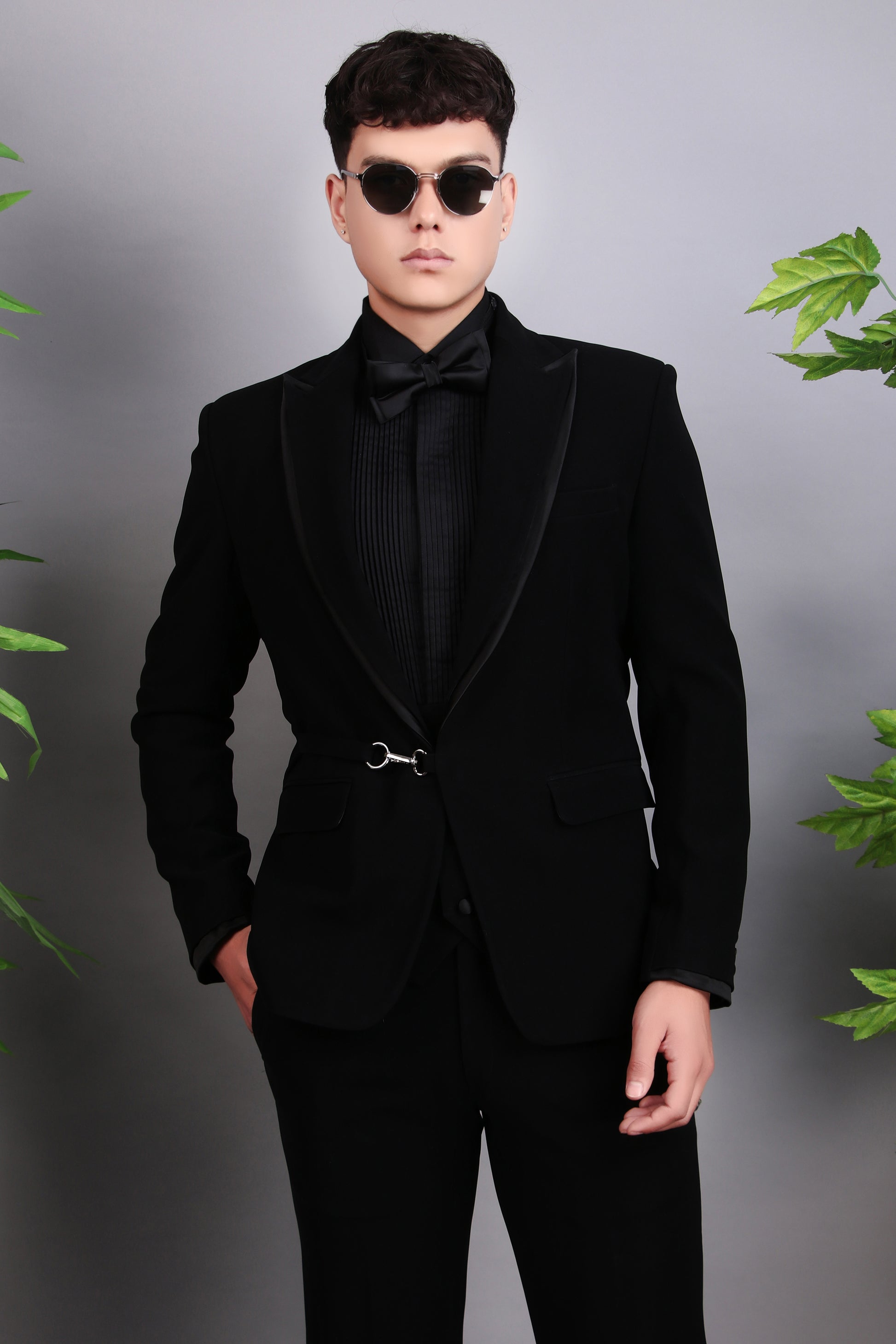 Crafted from premium Japanese Lycra, this tuxedo offers a sleek fit and elegant drape, perfect for formal occasions. The standout feature is the extended front with lapel detailing and a stylish buckle enclosure, ensuring a sophisticated silhouette. Paired with a modal satin shirt, this ensemble is designed for the modern man who values both comfort and style.