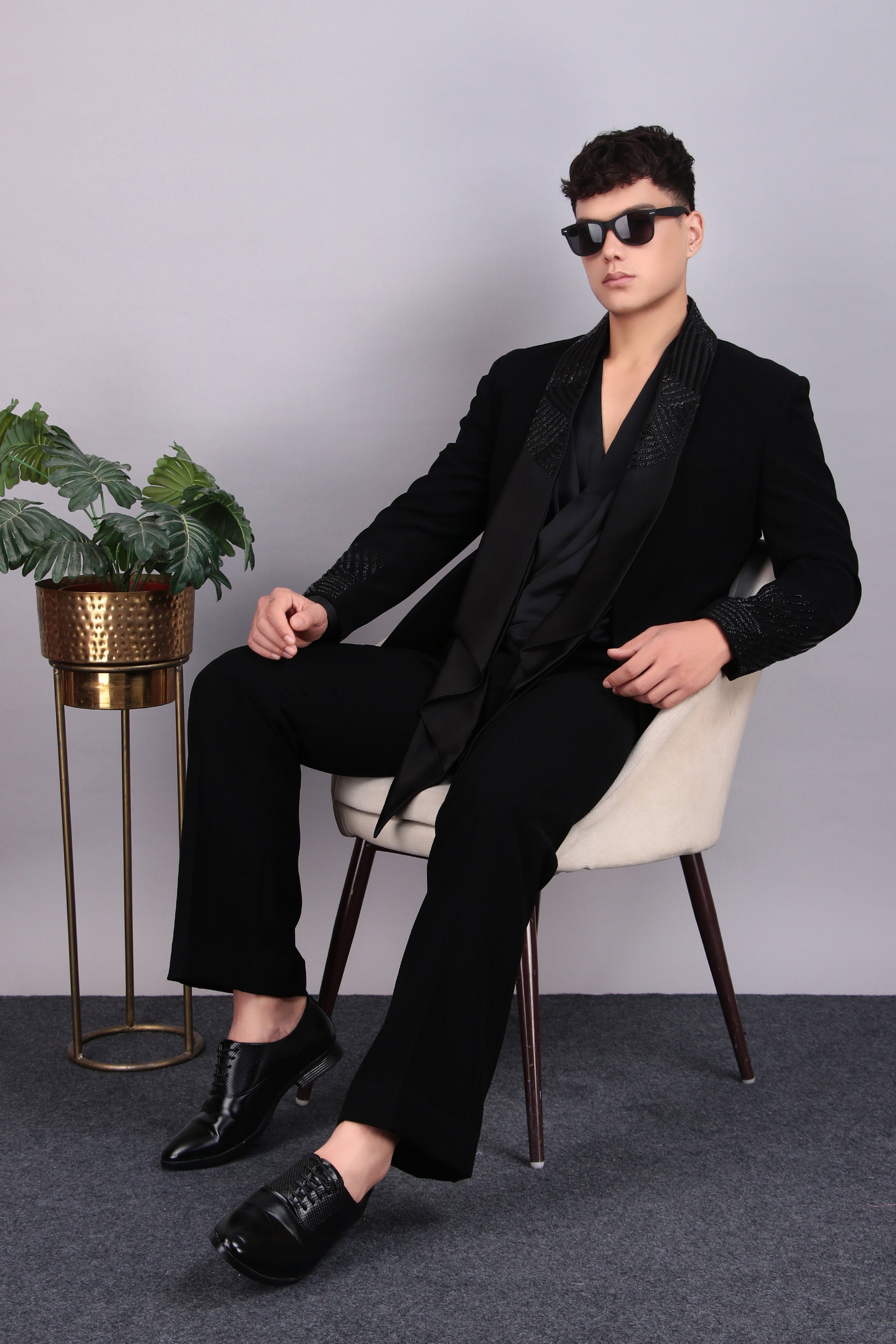 Crafted from premium Japanese Lycra, this tuxedo offers a refined drape and exceptional comfort. The standout layered lapel features intricate bead and glass stone embroidery, complemented by a stylish cowl and pleats on the designer shirt. The silhouette is tailored for a modern fit, making it perfect for formal occasions.