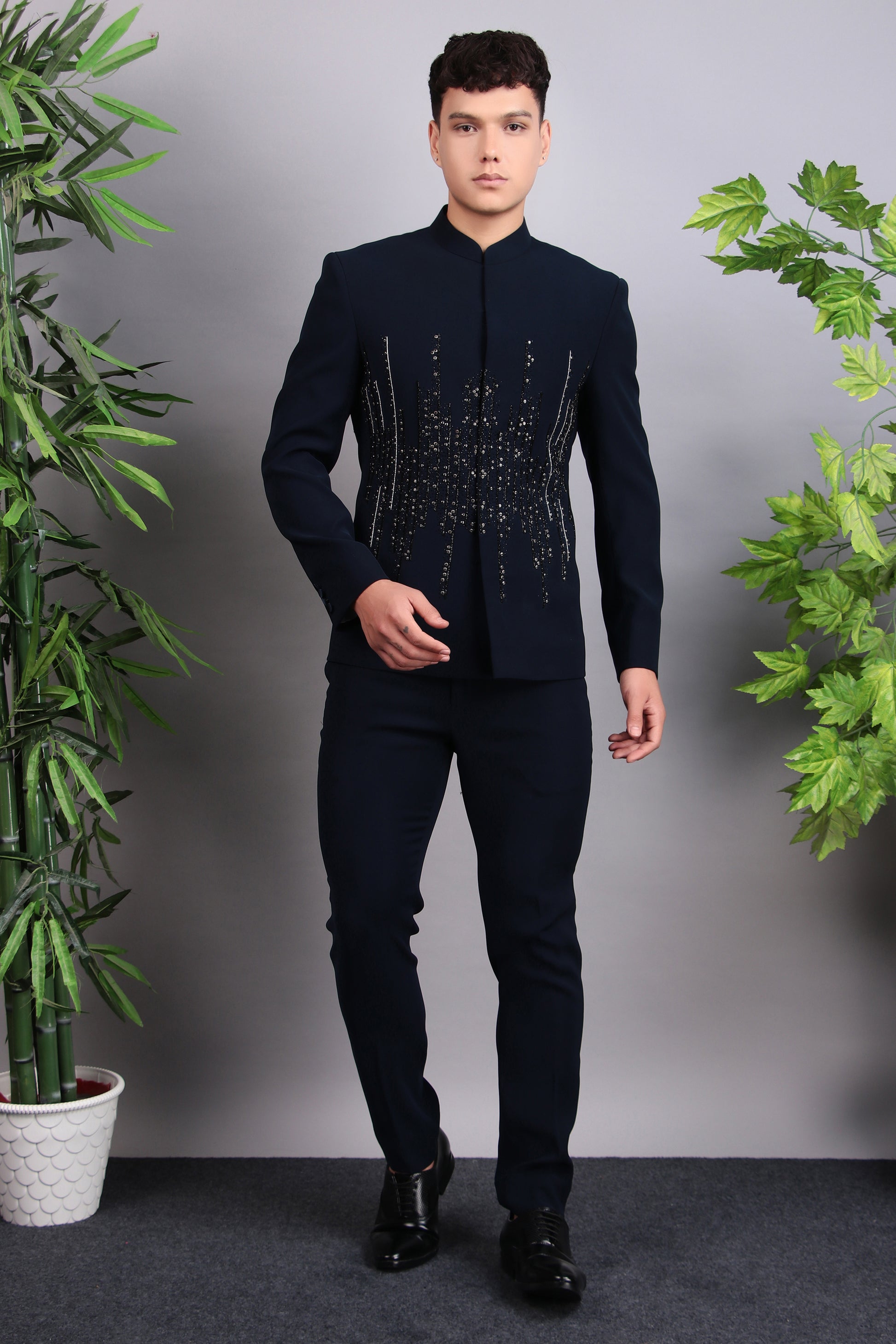 Men’s Bandhgala – Japanese Lycra in Navy Blue with Hand Embroidery | One Man Show