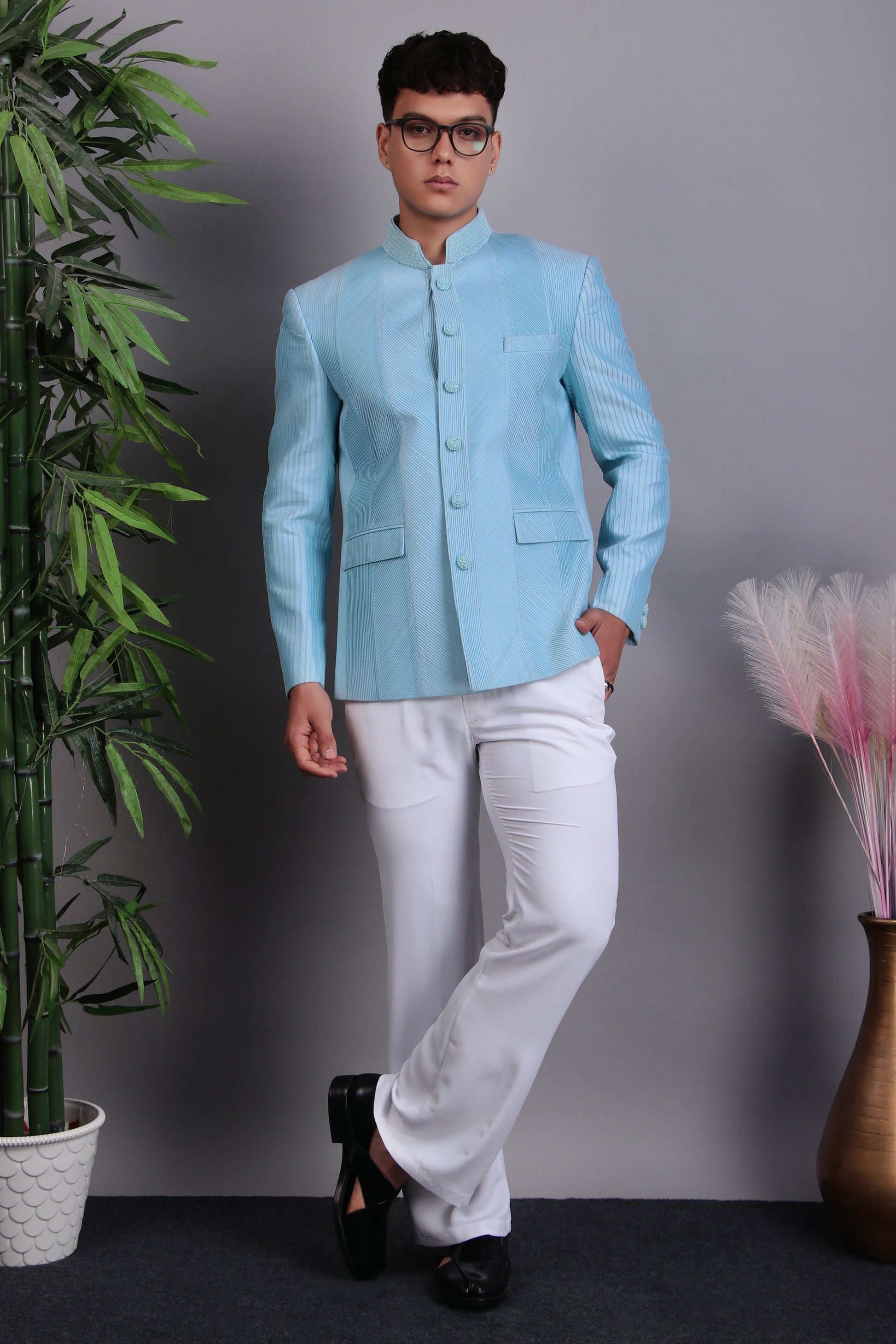 Crafted from premium silk, this blue bandhgala offers a refined drape and a sophisticated silhouette. The hand embroidery featuring silver stones and beads adds a touch of elegance, making it ideal for celebrations and formal events. Paired with Japanese Lycra pants, this ensemble ensures comfort without compromising on style.