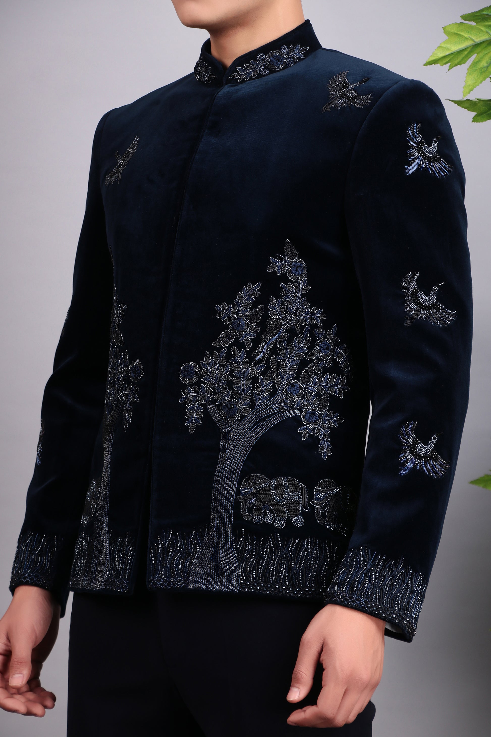 Men’s Bandhgala – Cotton Velvet in Blue with Hand Embroidery | One Man Show