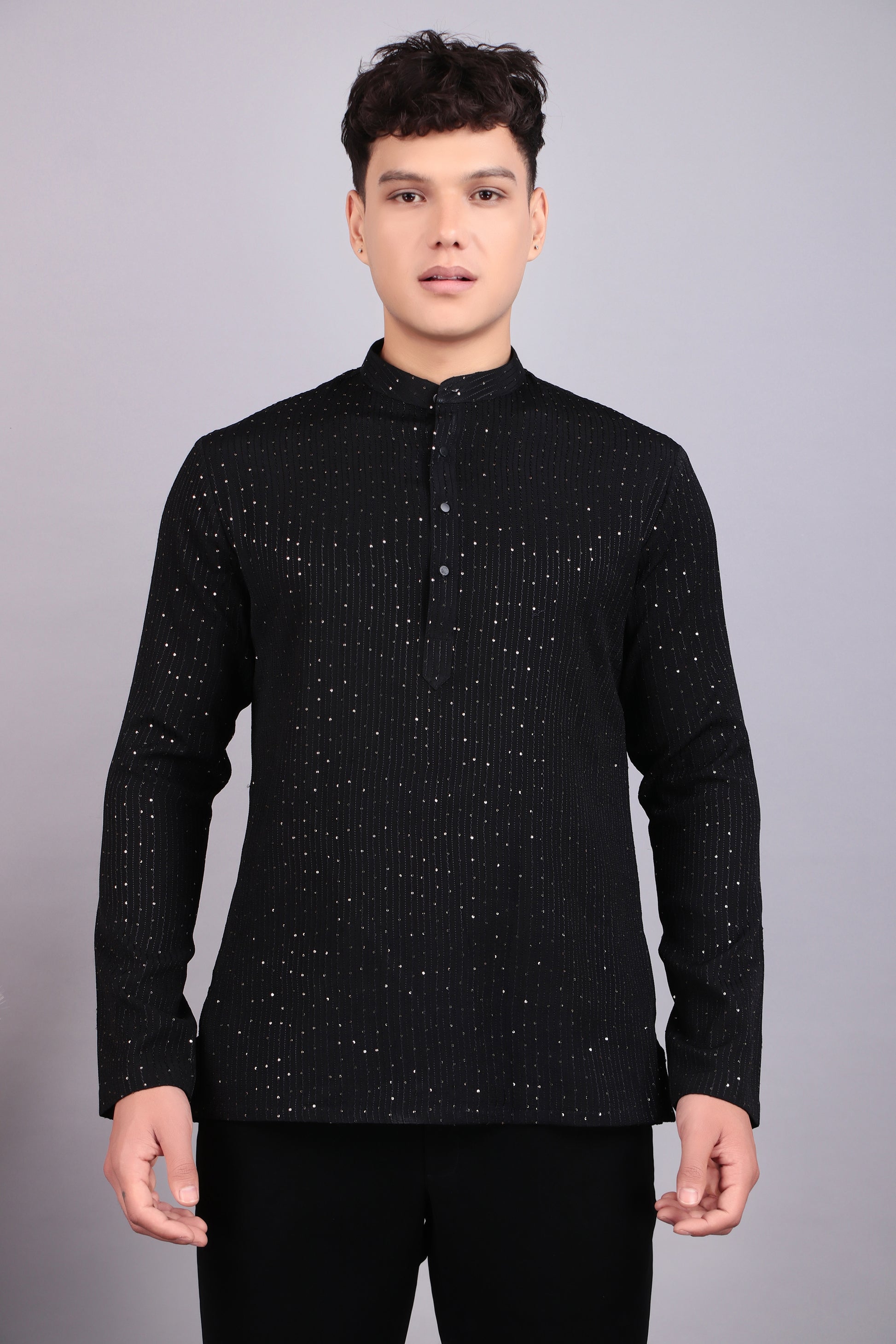 Crafted from premium Japanese Lycra, this Bandhgala offers a sleek silhouette and exceptional drape, perfect for formal occasions. The standout feature is the intricate hand embroidery adorned with gold stones and beads, adding a touch of opulence. The tailored fit ensures a modern look, while the elegant length provides versatility for various events.