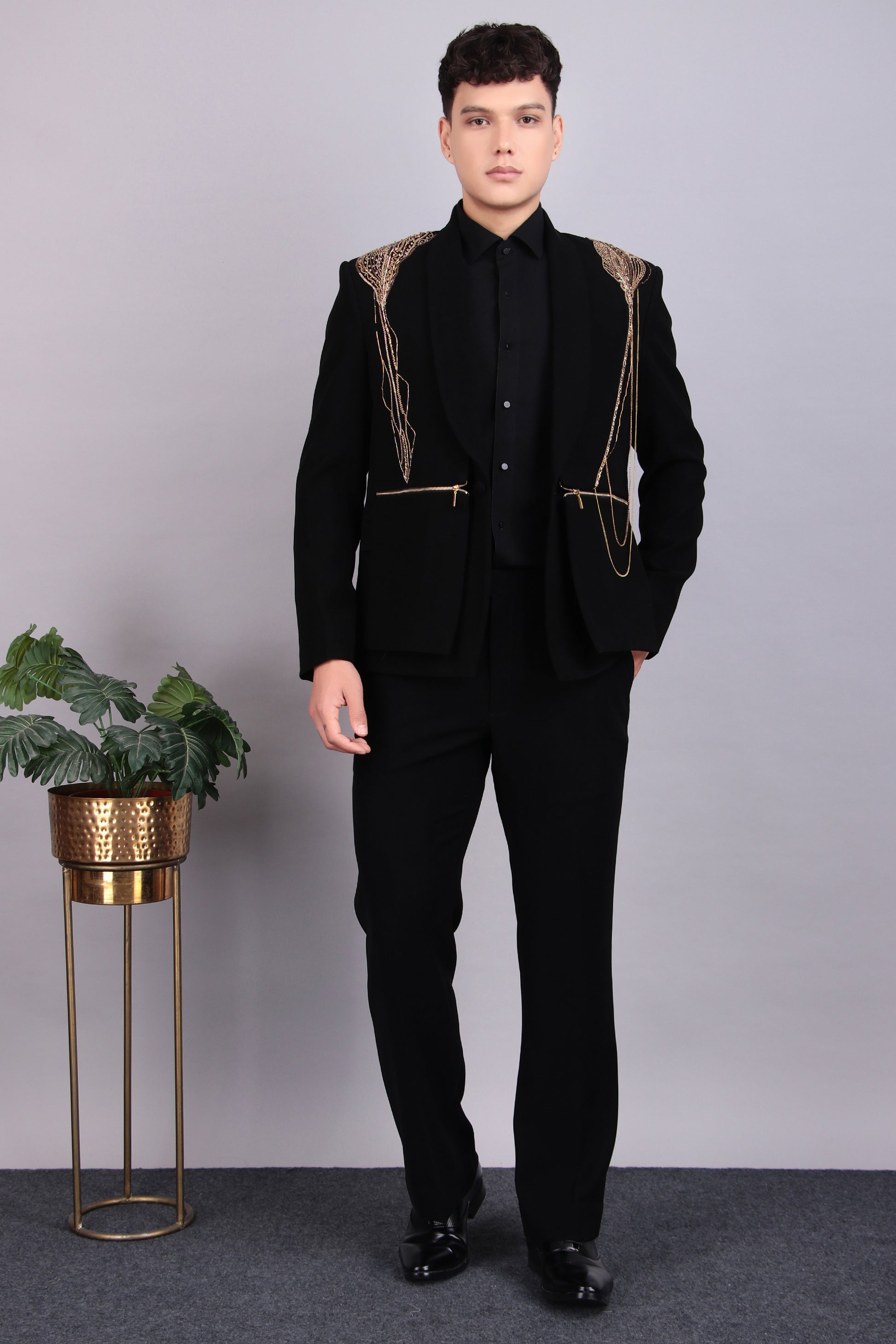 This black tuxedo, made from luxurious Japanese Lycra, offers a refined fit perfect for formal occasions. The jacket features a striking golden embroidery in an abstract style, complemented by a modern zipper front cut. The silhouette is tailored for a sharp look, while the lower pants maintain a classic elegance.