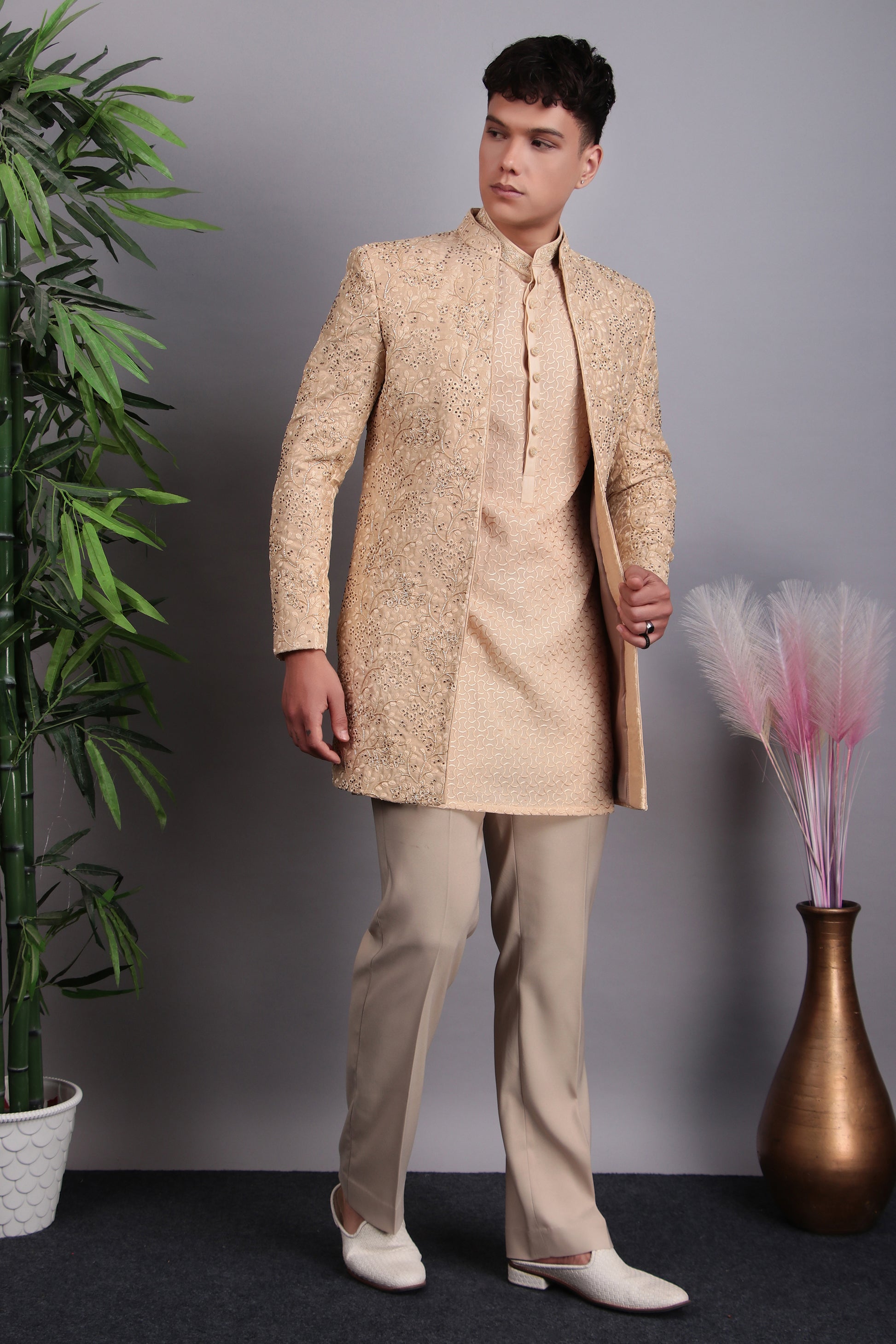 Men’s Indo-Western – Silk Embroidered Fabric in Beige with Floral Hand Embroidery | One Man Show
