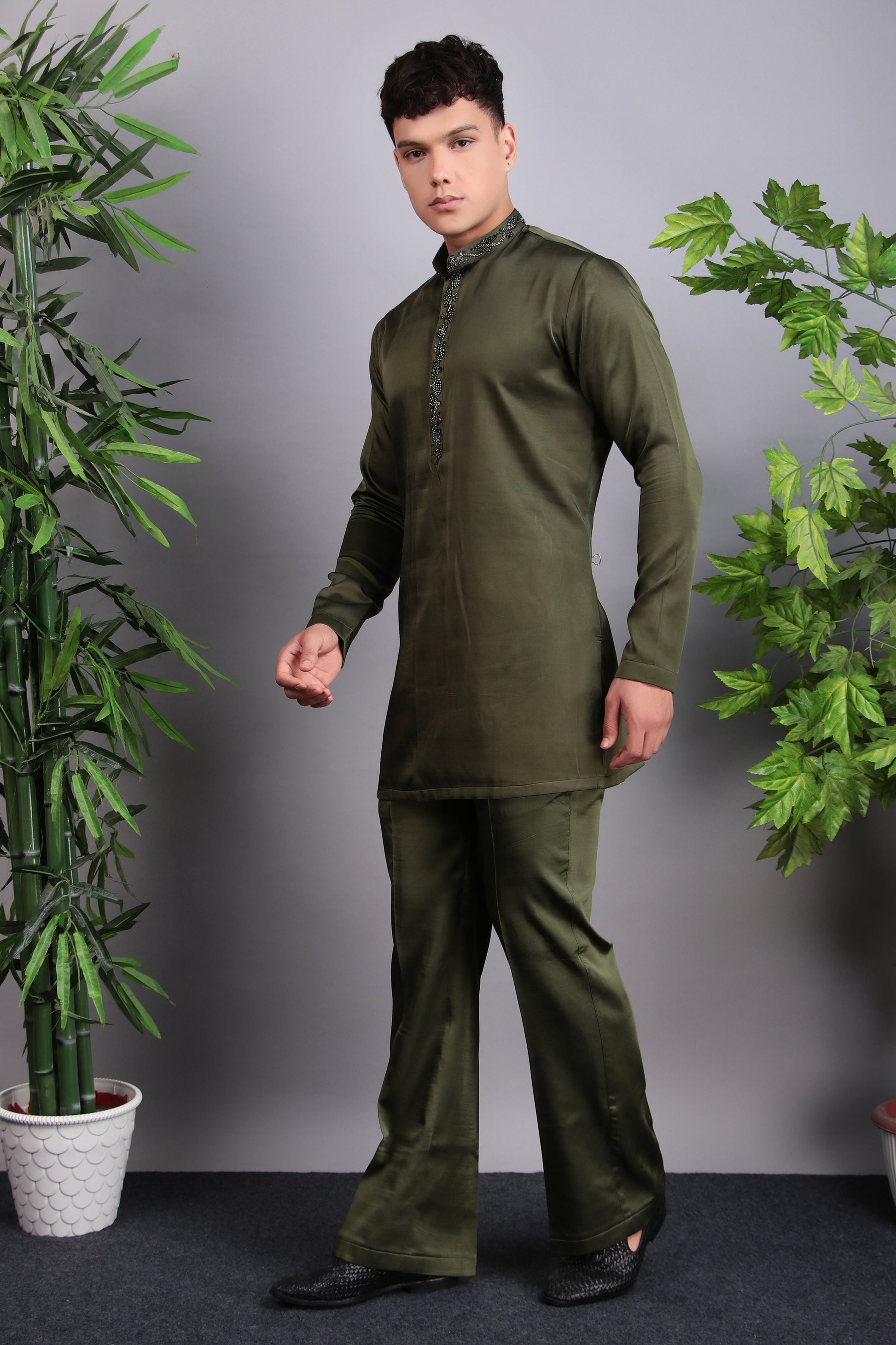 Crafted from sumptuous modal satin and velvet embroidered fabric, this Indo-Western ensemble features a bandhgala kurta adorned with intricate multi-colored floral embroidery, complemented by beads and stones. The silhouette is tailored for a modern fit, ensuring both elegance and comfort. Perfect for festive celebrations or formal gatherings.