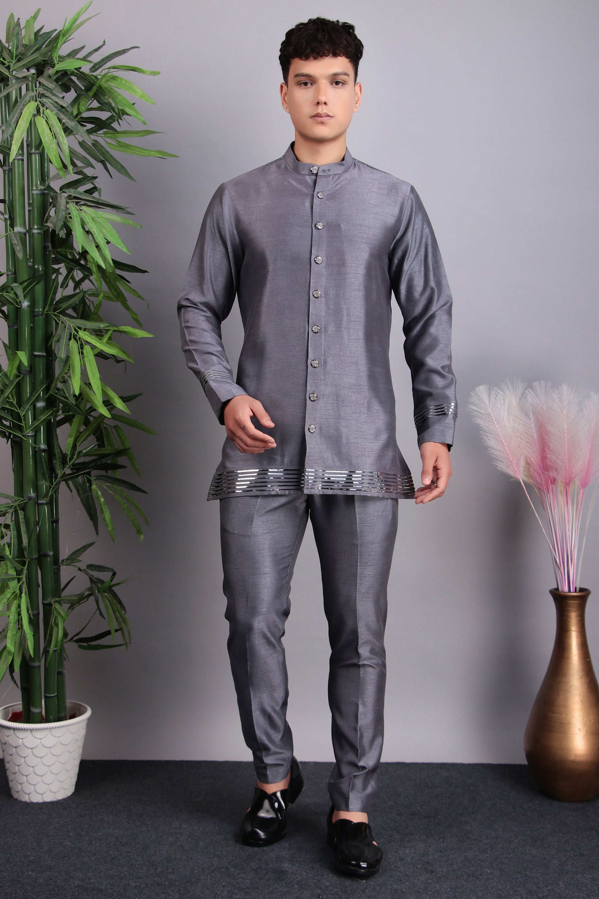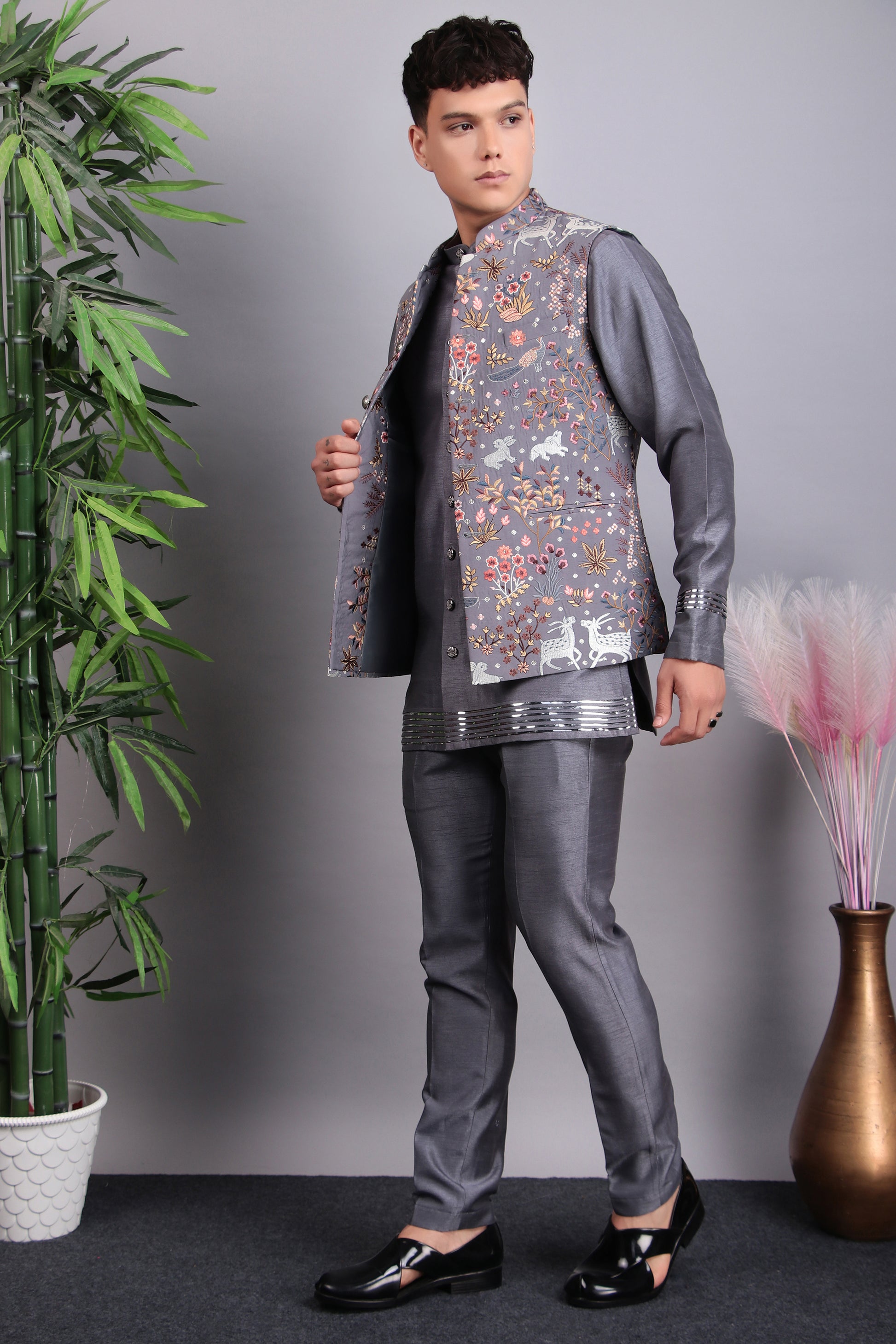 Men’s Nehru Jacket – Silk Embroidered Fabric in Grey with Multi Color Thread Embroidery | One Man Show