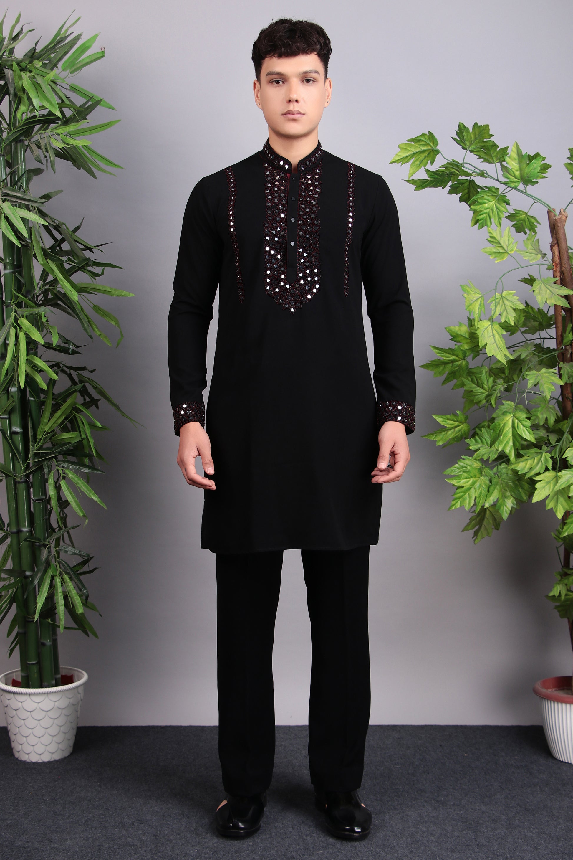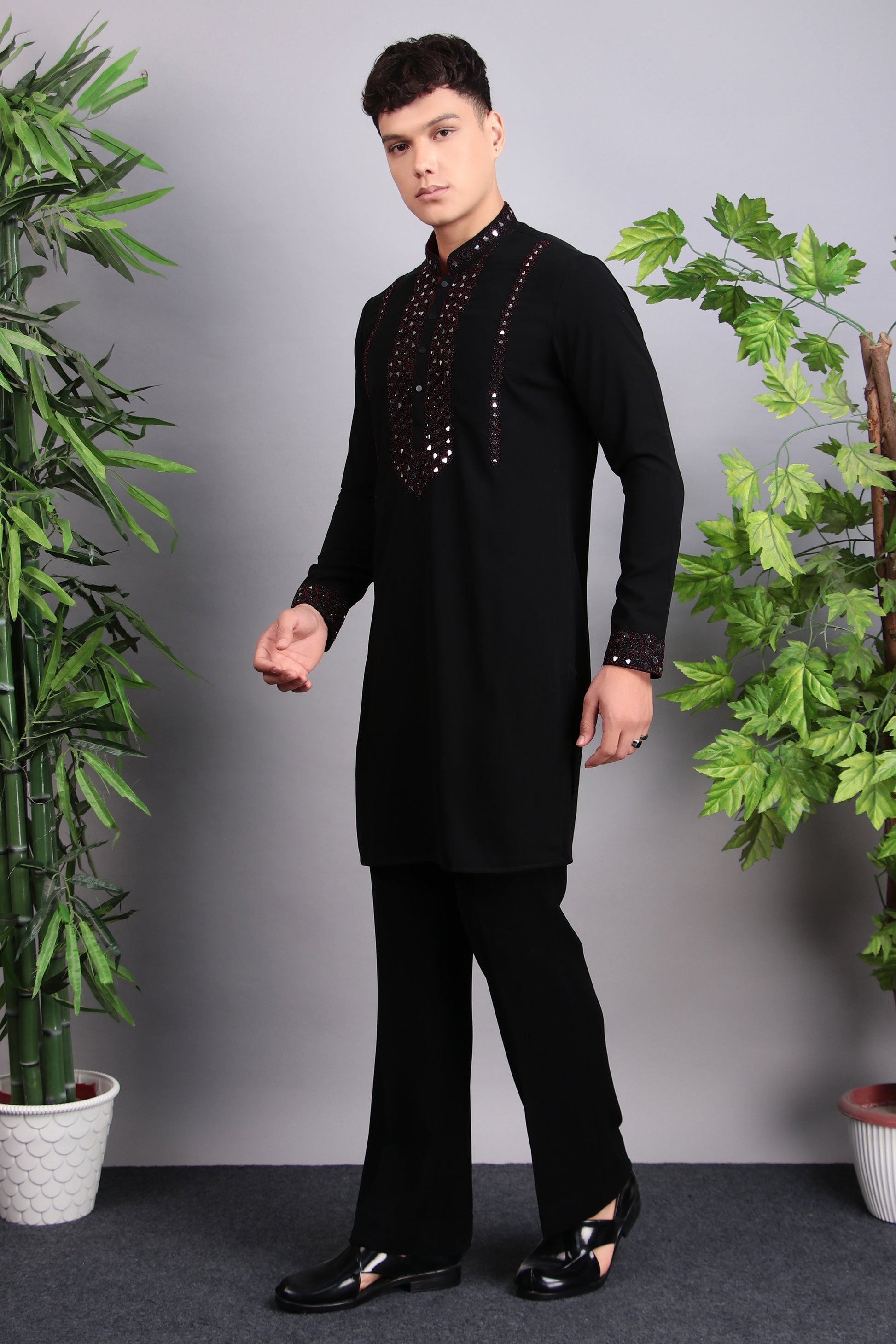 Men’s Kurta Set – Korean Wrinkle-Free in Black with Mirror and Beads Embroidery | One Man Show