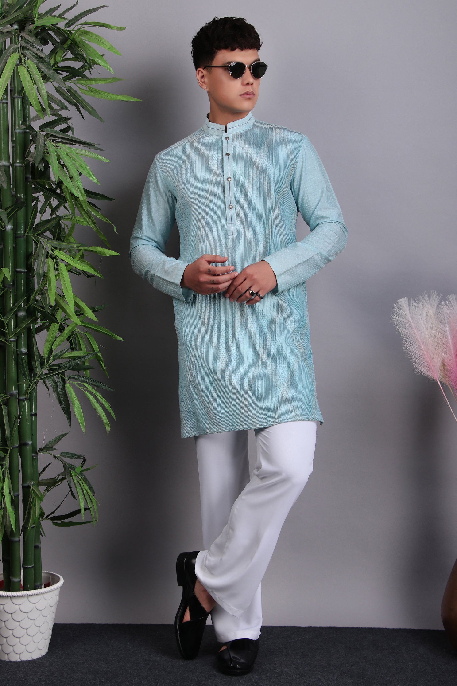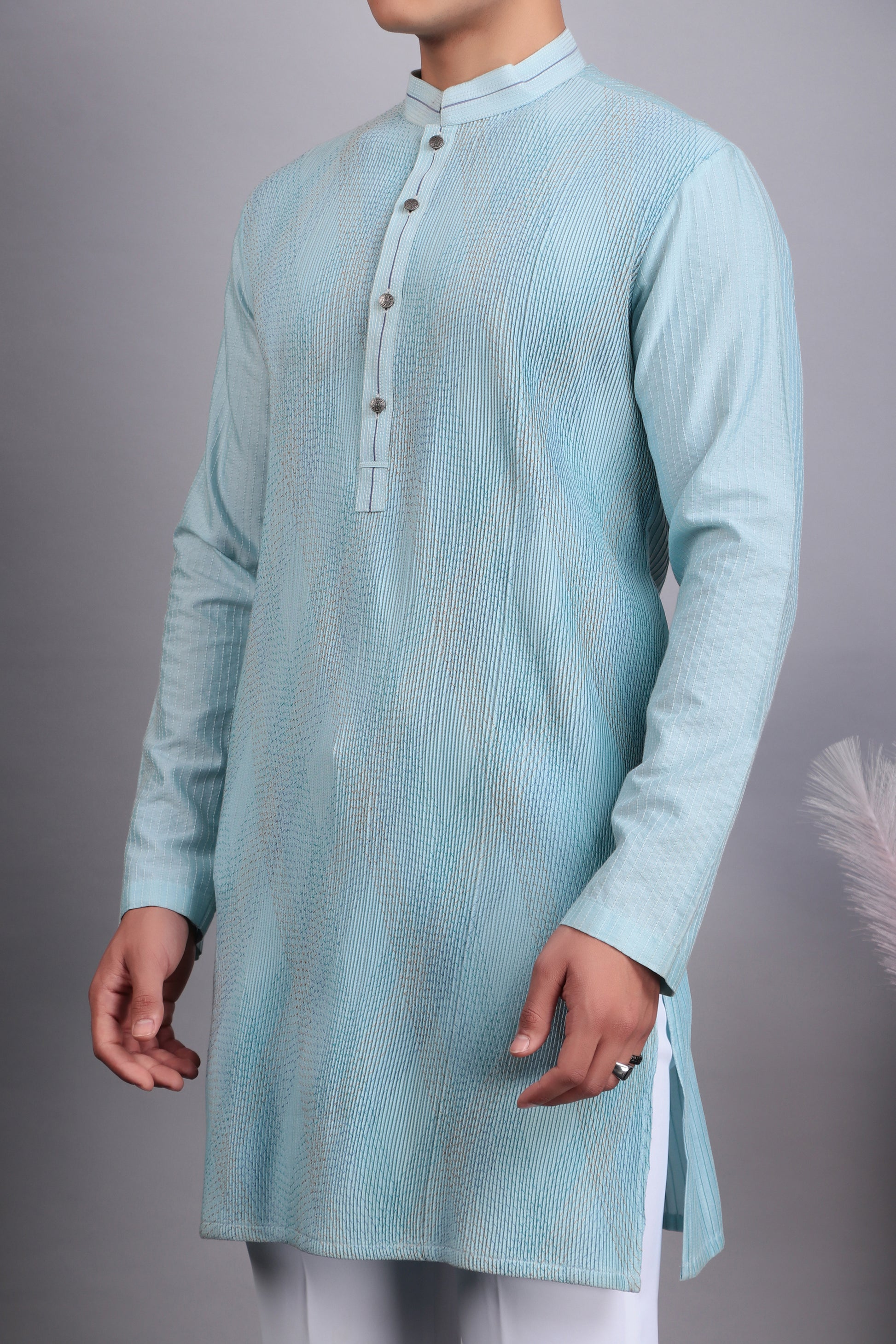 Men’s Kurta Set – Silk Cotton in Blue with Thread Work and Pintex Fabric Manipulation | One Man Show