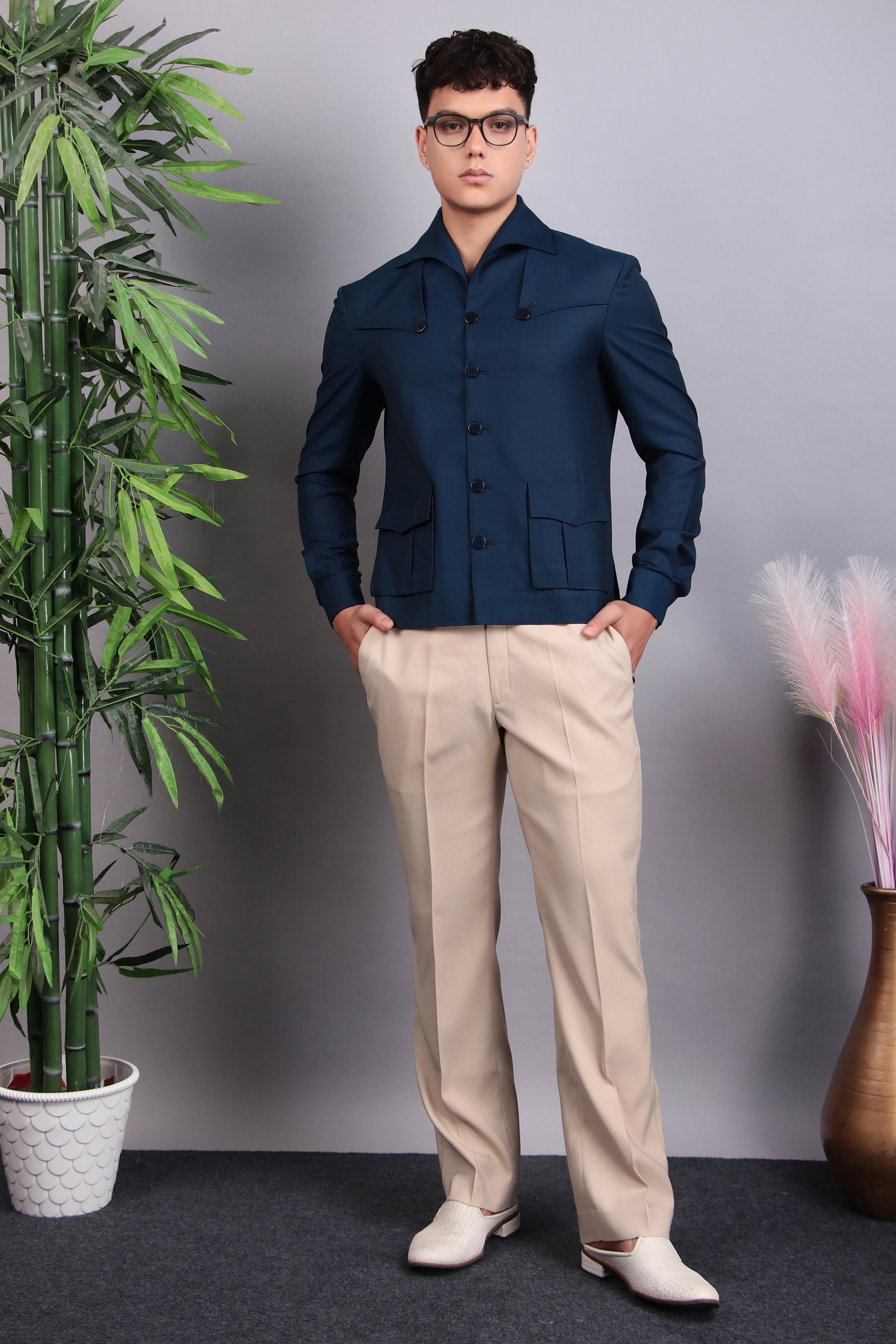 Men’s Suit – Suiting Lycra in Blue with Hunter Shirt and Hand Stitchwork Details | One Man Show