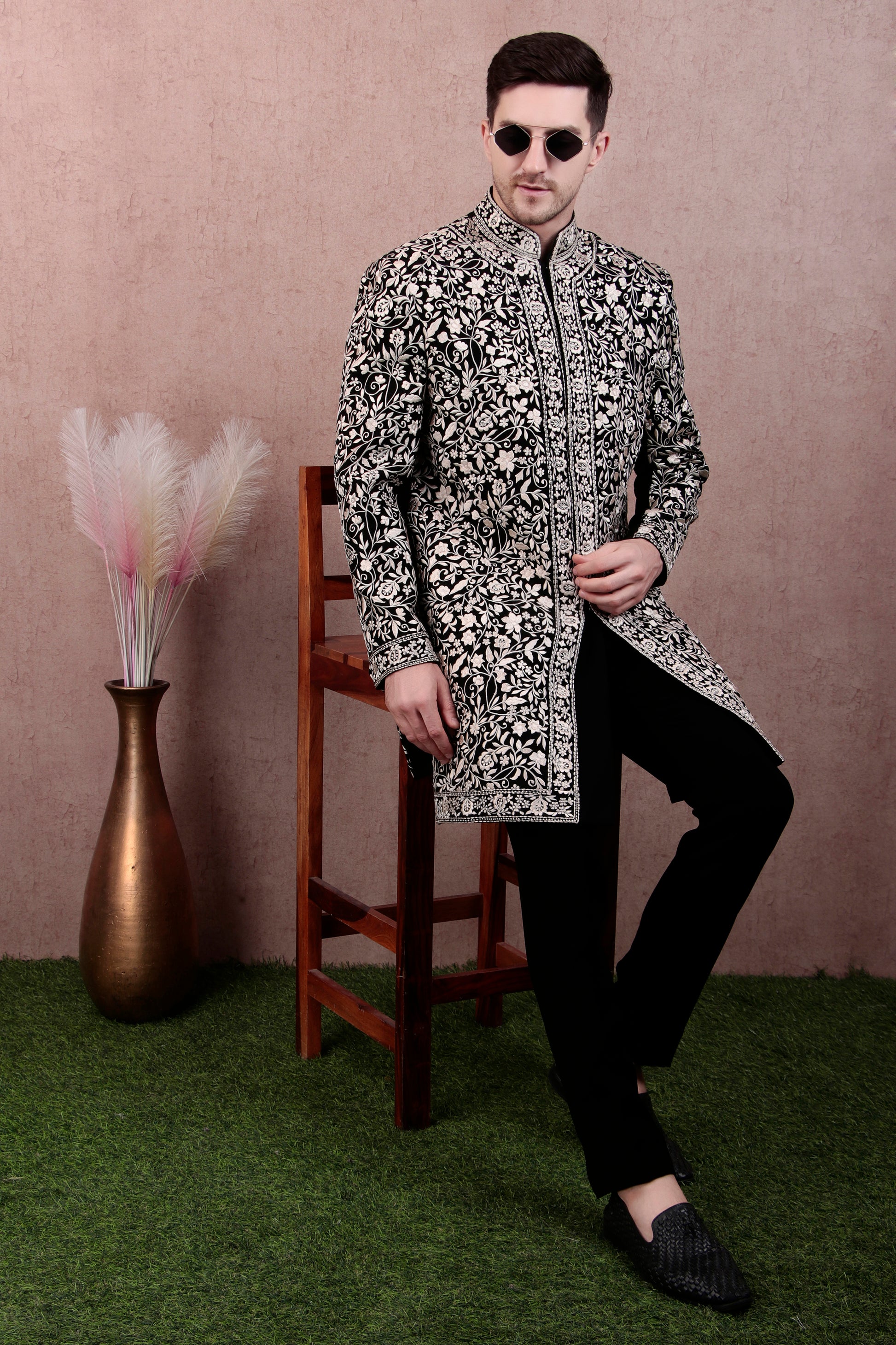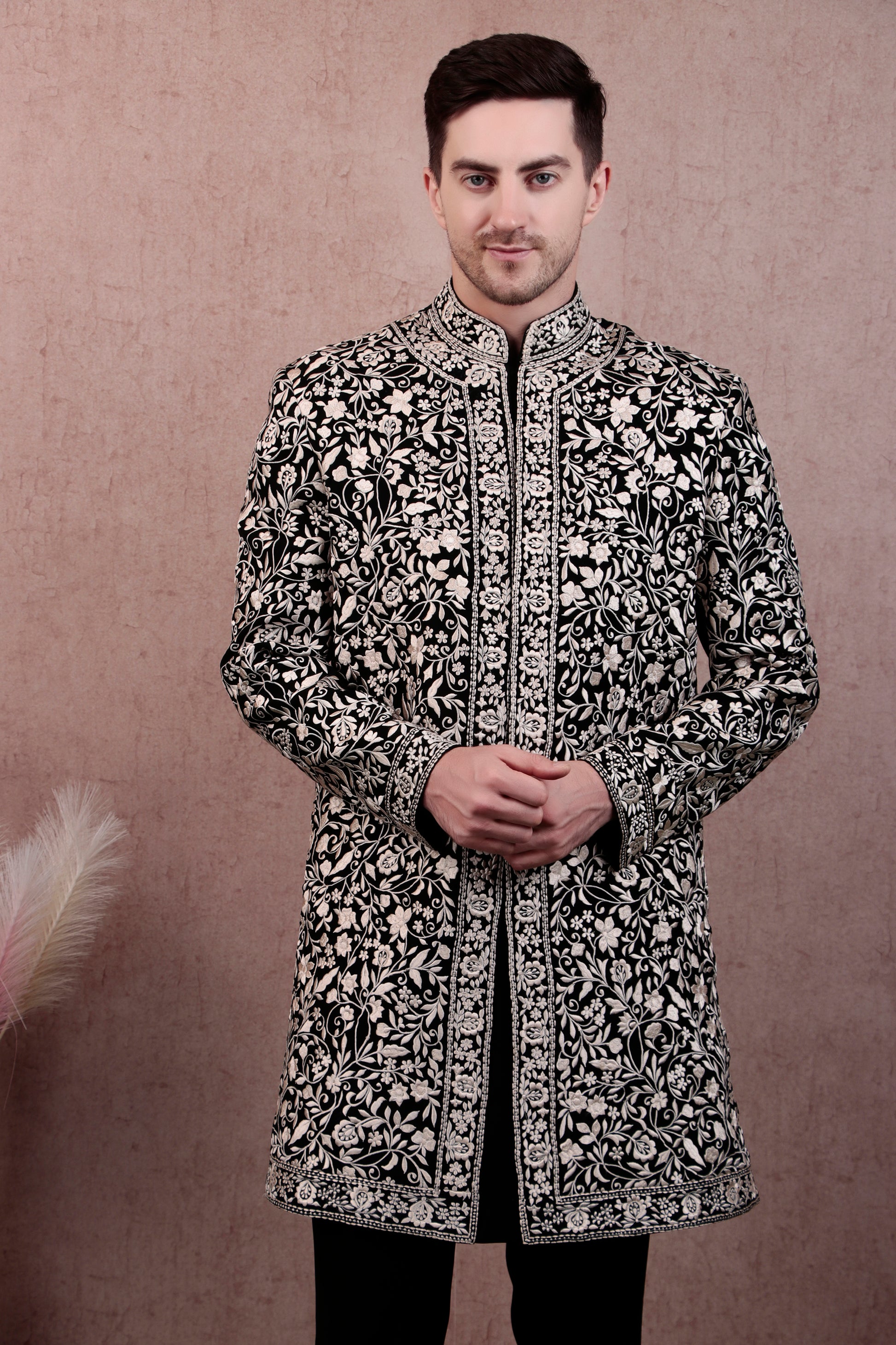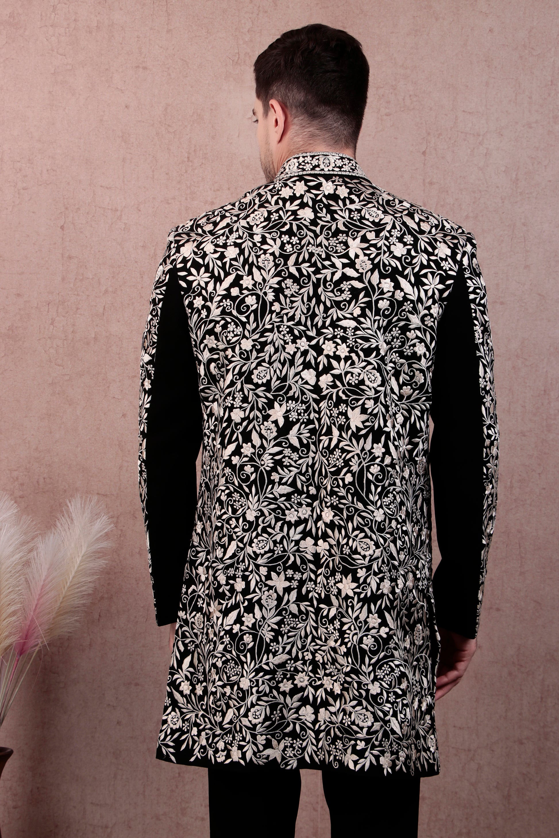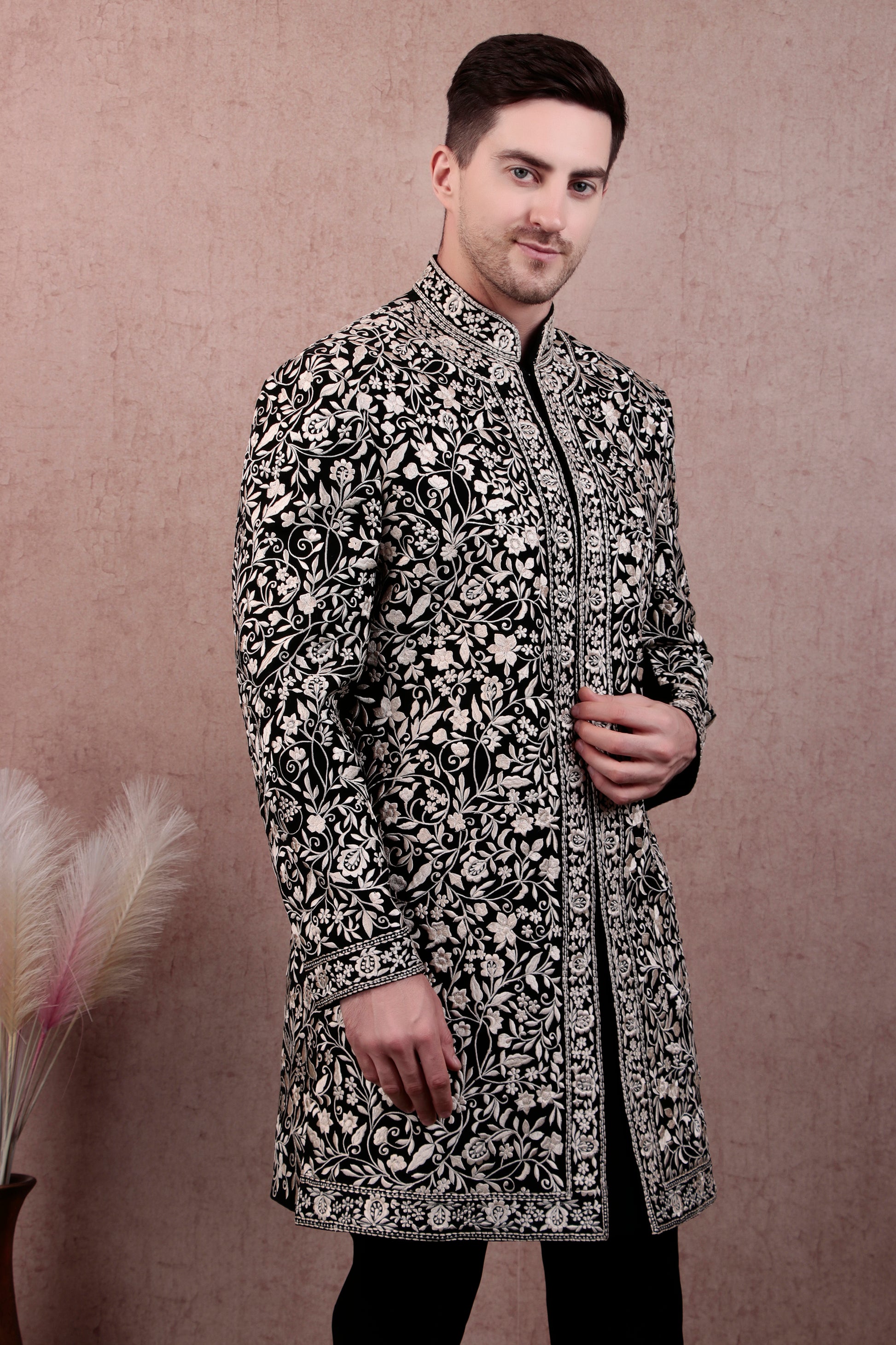 Men’s Sherwani – Japanese Lycra in Black with Silk Thread Floral Embroidery | One Man Show