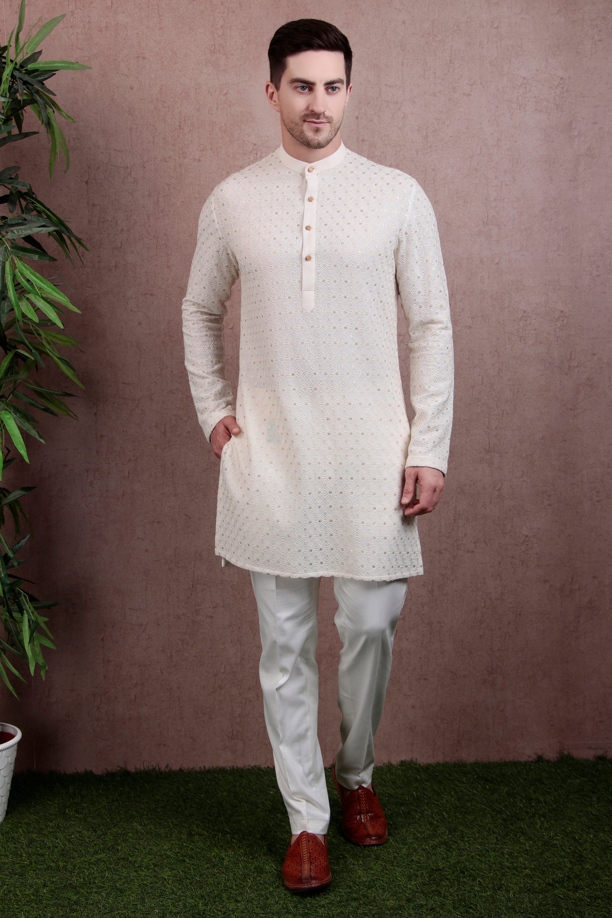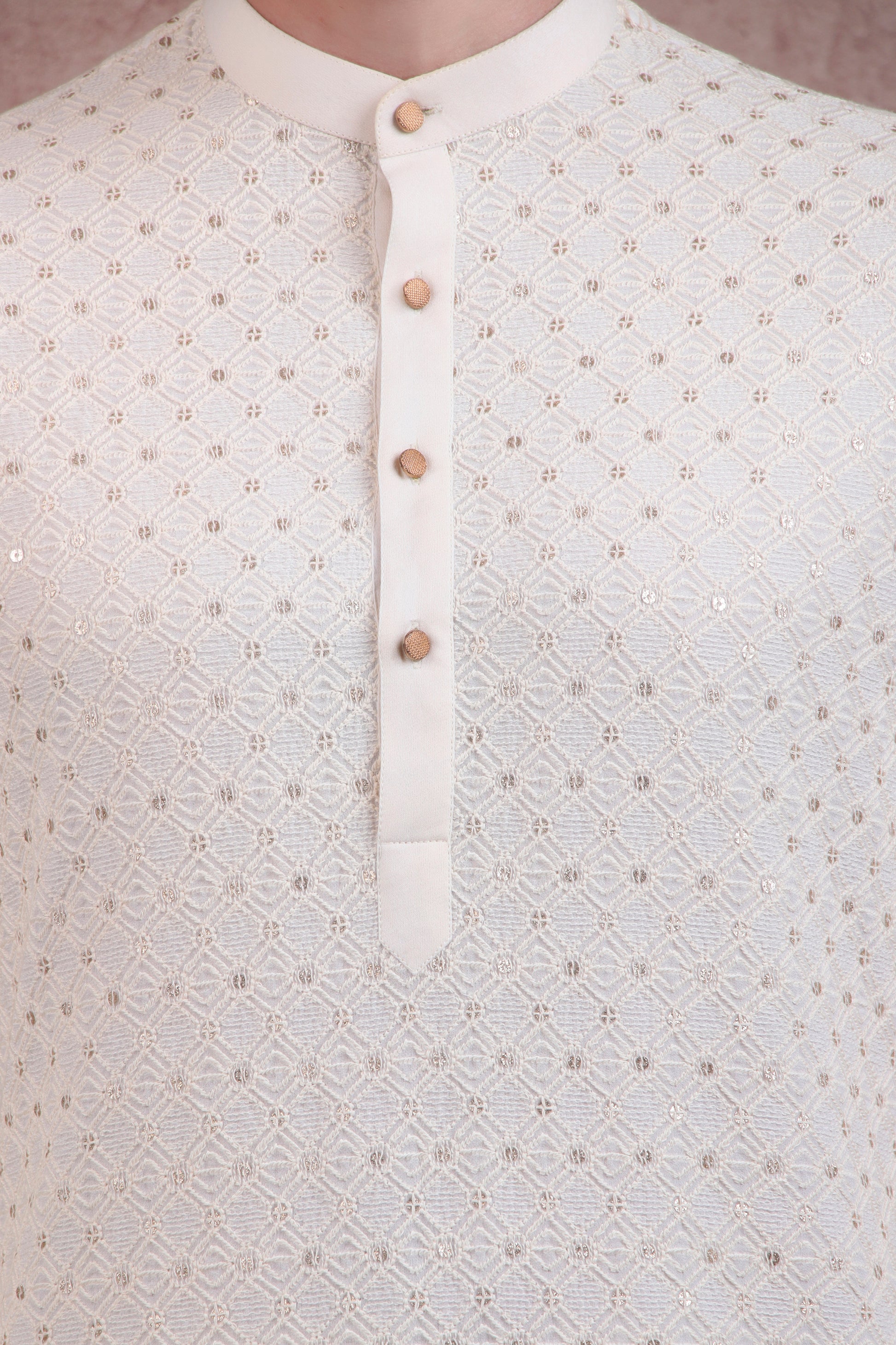 Men’s Designer Kurta Set – Georgette in Ivory with Silk Thread Embroidery & Lapel Jacket Cut | One Man Show