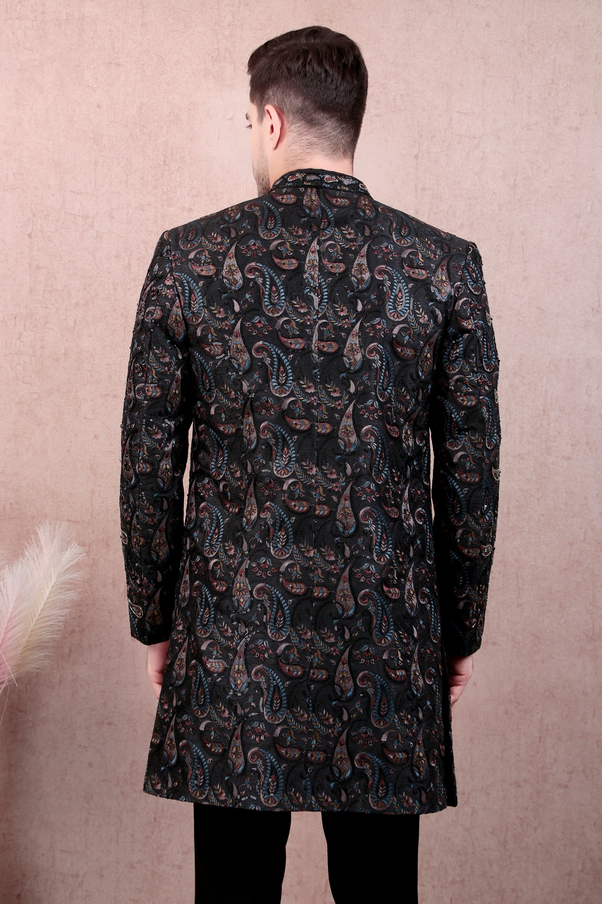 Men’s Sherwani – Georgette in Black with Silk Thread Paisley Embroidery | One Man Show